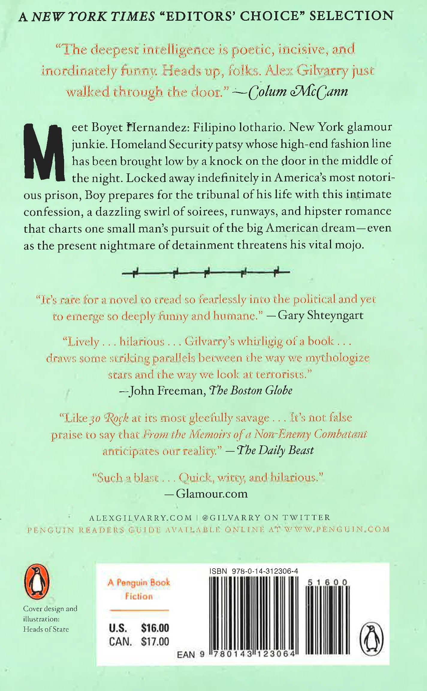 Alex Gilvarry's widely acclaimed first novel is the story of designer Boy Hernandez: Filipino immigrant, New York glamour junkie, Guantánamo detainee. Locked away indefinitely and accused of being linked to a terrorist plot, Boy prepares for the tribunal of his life with this intimate confession, a dazzling swirl of soirees, runways, and hipster romance that charts one small man's undying love for New York City and his pursuit of the big American dream--even as the present nightmare of detainment chisels away at his vital wit and chutzpah. A New York Times Editor's Choice, From the Memoirs of a Non-Enemy Combatant unveils two of America's most illusory realms--high fashion and Homeland Security--in a funny, wise, and beguiling, and Kafkaesque tale for our strange times.