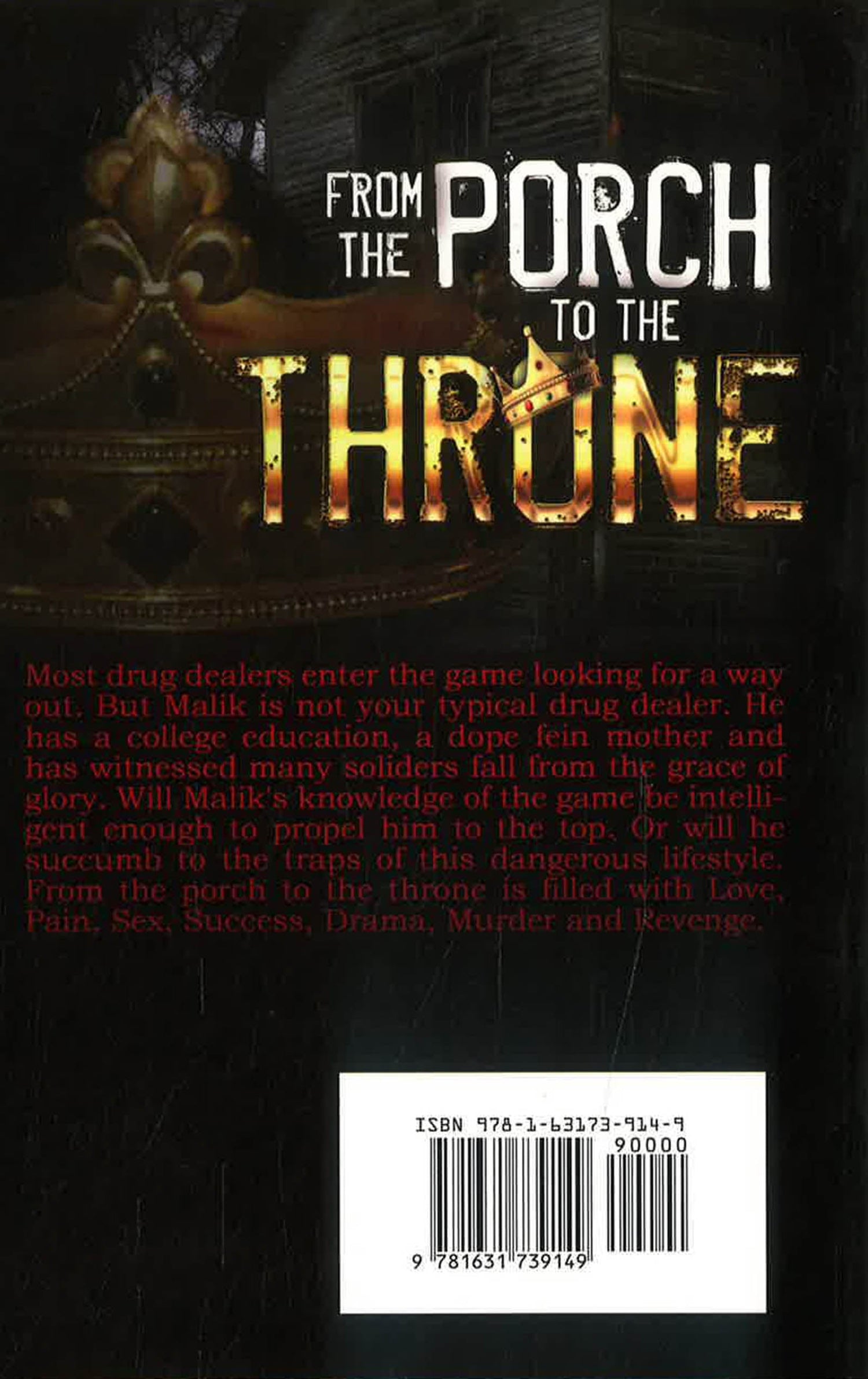 Most drug dealers enter the game looking for a way out. But Malik is not your typical drug dealer. He has a college education, dope fein mother and has witnessed many soliders fall from the grace of glory. Will Malik's knowledge of the game be intelligent enough to propel him to the top. Or will he succumb to the traps of this dangerous lifestyle. From the porch to the throne is filled with LOVE, PAIN, SEX, SUCCESS, DRAMA, MURDER and REVENGE