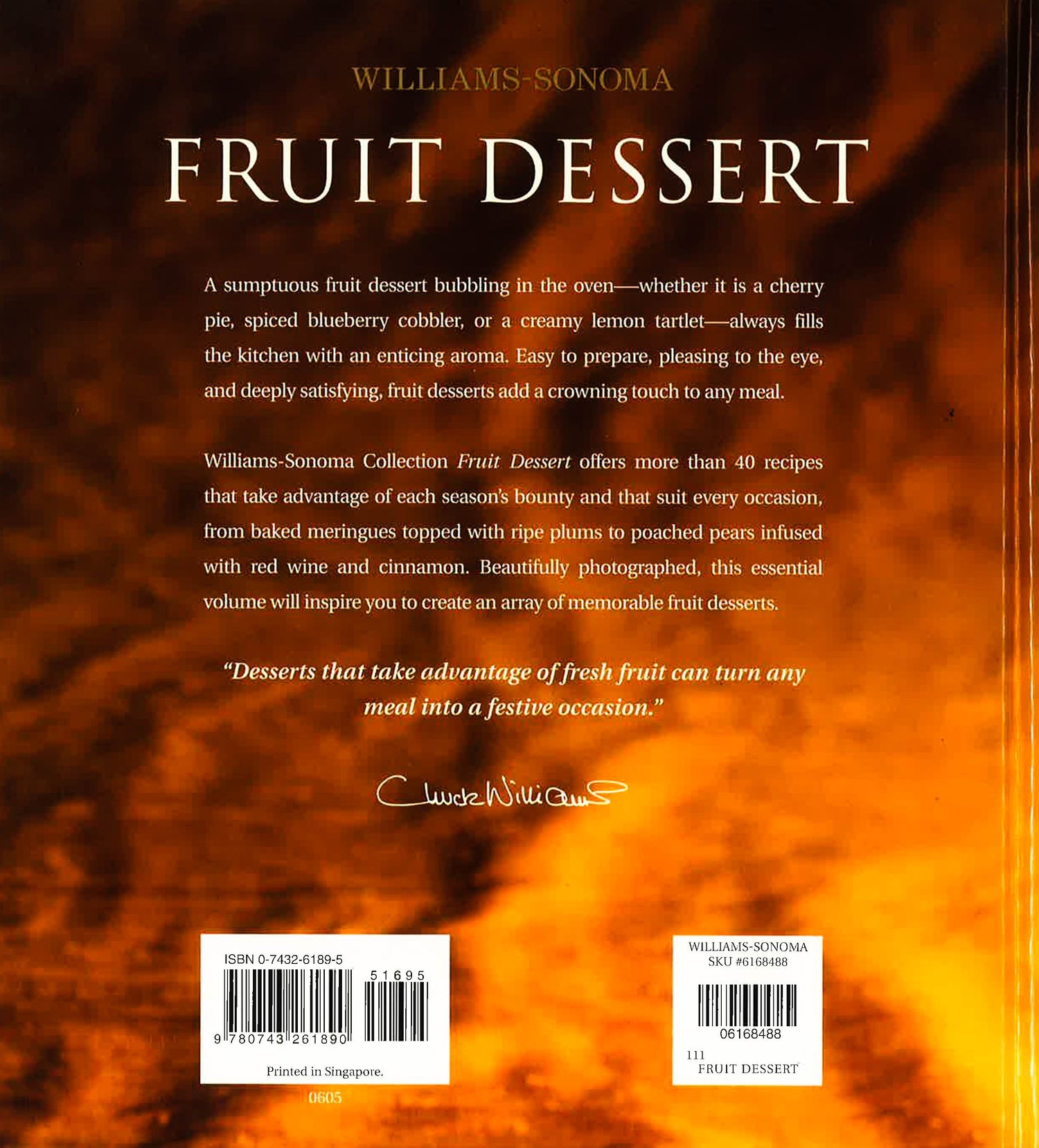 A trifle layered with ripe summer raspberries, frothy whipped cream, and sponge cake. Tender gingered apricots baked with a crisp almond topping. Sweet, juicy blackberries concealed inside a flaky pastry turnover. Whether stewed with spices or simply dusted with powdered sugar as the topping for a tart, almost every kind of fruit can be transformed into a delectable dessert. Williams-Sonoma Collection Fruit Dessert offers more than 40 favorite recipes, from homey pies and cobblers to elegant tarts and sorbets. For the perfect end to a dinner party, serve your guests an exotic coconut cake with fresh mango or homemade strawberry ice cream enriched with cr?me fra?che. When you are short on time, whip up a batch of easy baked apples or a warm berry compote to serve alongside ice cream or pound cake. And during the holidays, indulge yourself with a homemade pumpkin pie or apple crisp. Full-color photographs and helpful sidebars on key ingredients and techniques accompany each recipe, so you can successfully picture and prepare your dish of choice. An informative basics section at the back of the book offers tips on how to select fruit at its peak of ripeness and perfect your tart dough and pie crust. Whether you are looking for an impressive dessert or a simple dish that takes just minutes to prepare, you will find no shortage of inspiration in these pages.