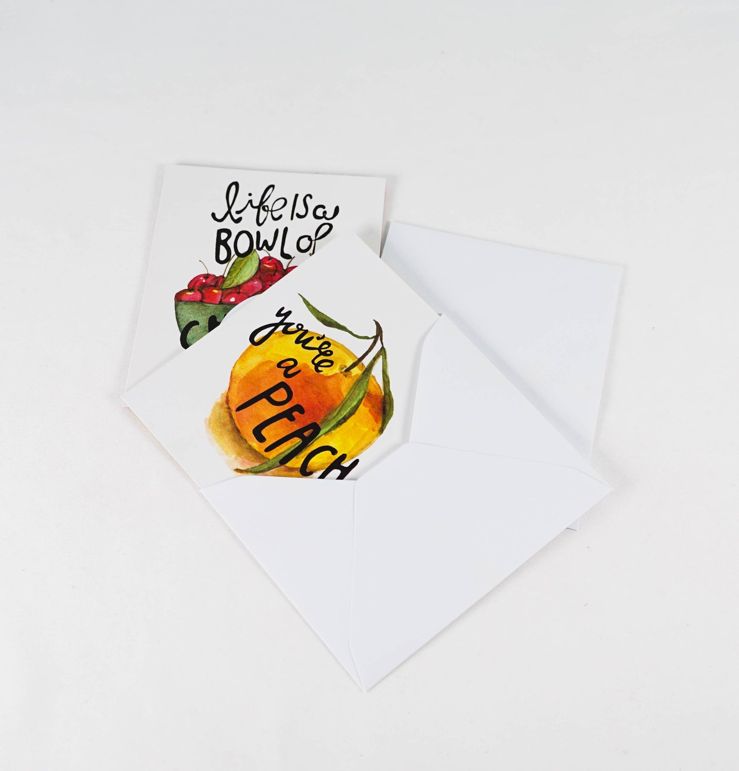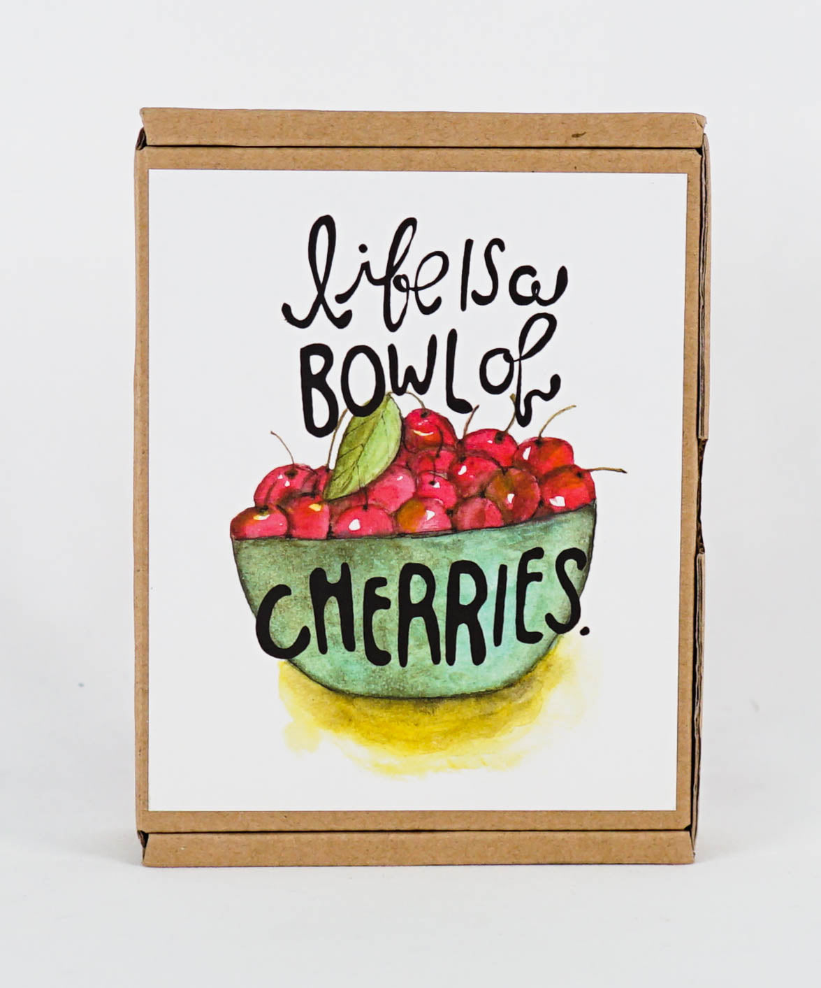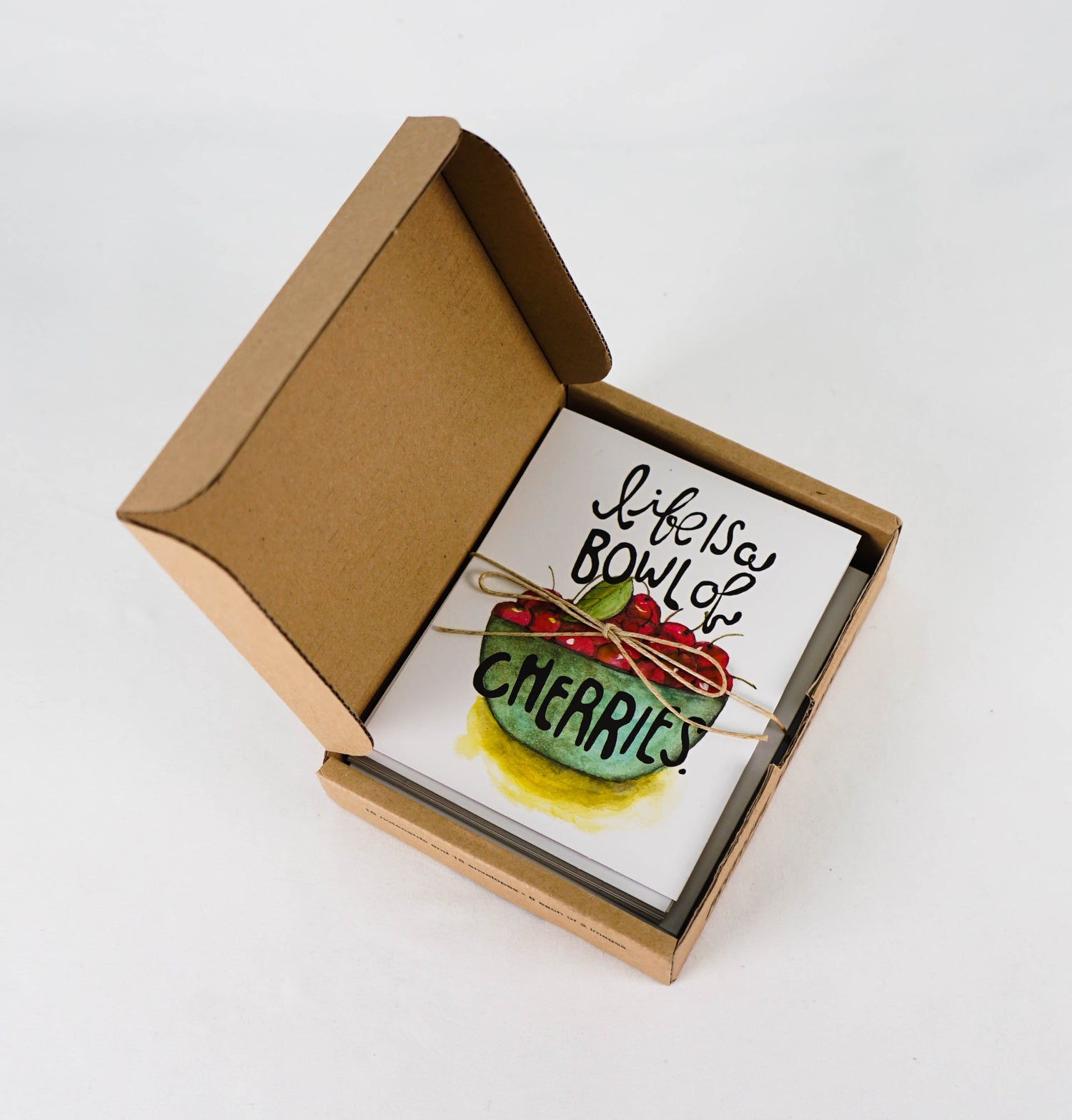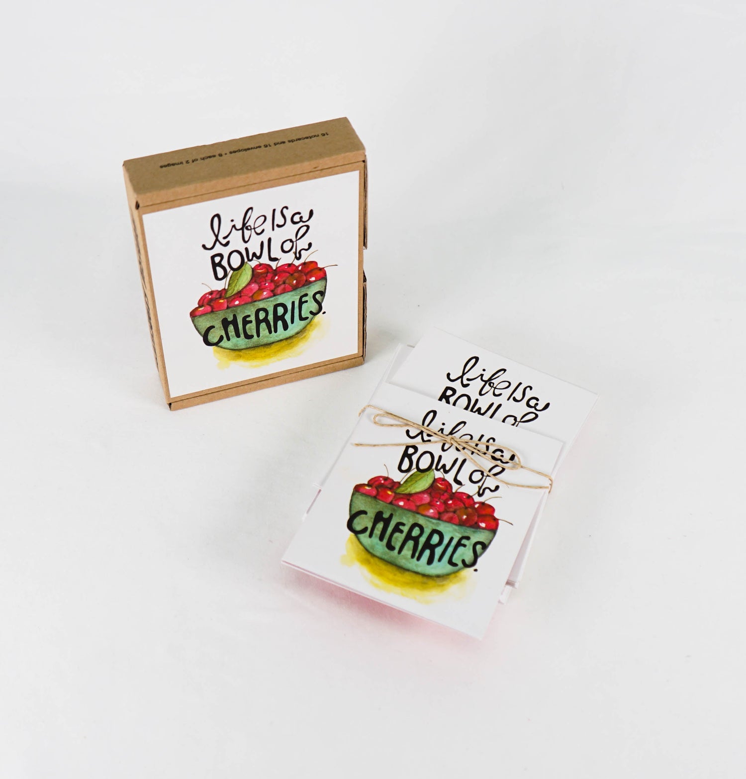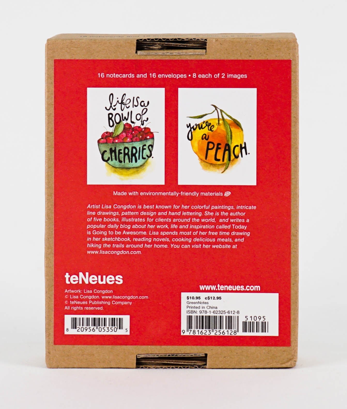 GreenNotes are our environmentally friendly set of notecards with on-trend designs and fresh art. The Fruitful Expressions GreenNote boxed notecard set with the lively "Lift is a Bowl of Cherries" and "You're a Peach" sentiments are happy notes for any occasion. Each reusable, fun corrugated box contains 16 notecards & envelopes, printed with soy-based inks on environmentally friendly materials. Our GreenNotes focus on function and form with vibrant, full-color artwork. Cards are printed on uncoated paper stock, bundled together with a decorative twine tie.