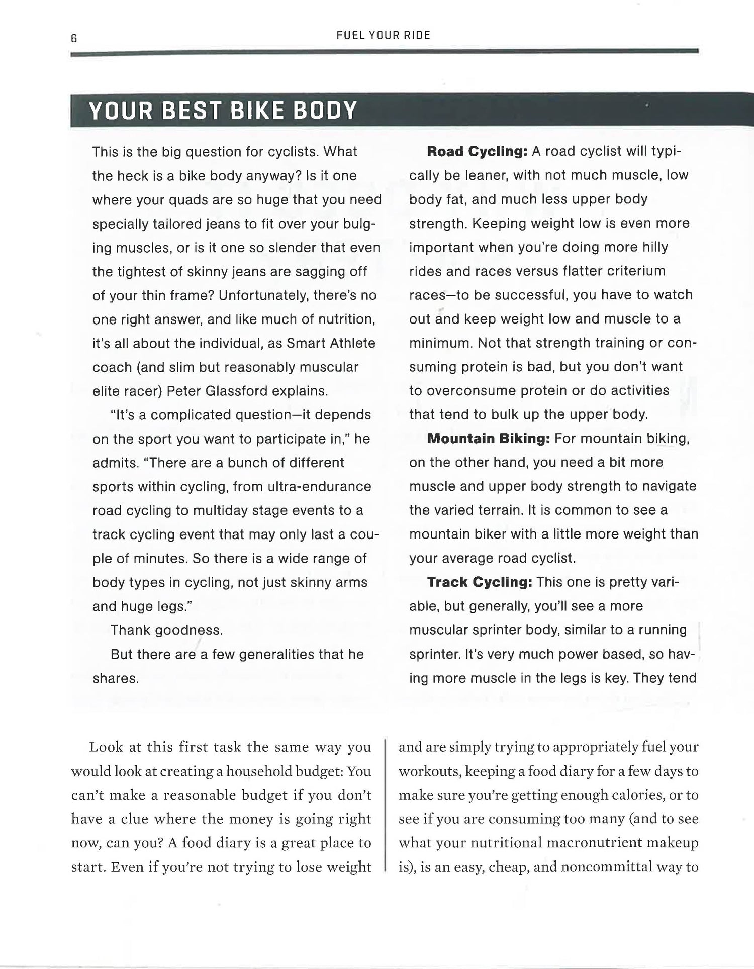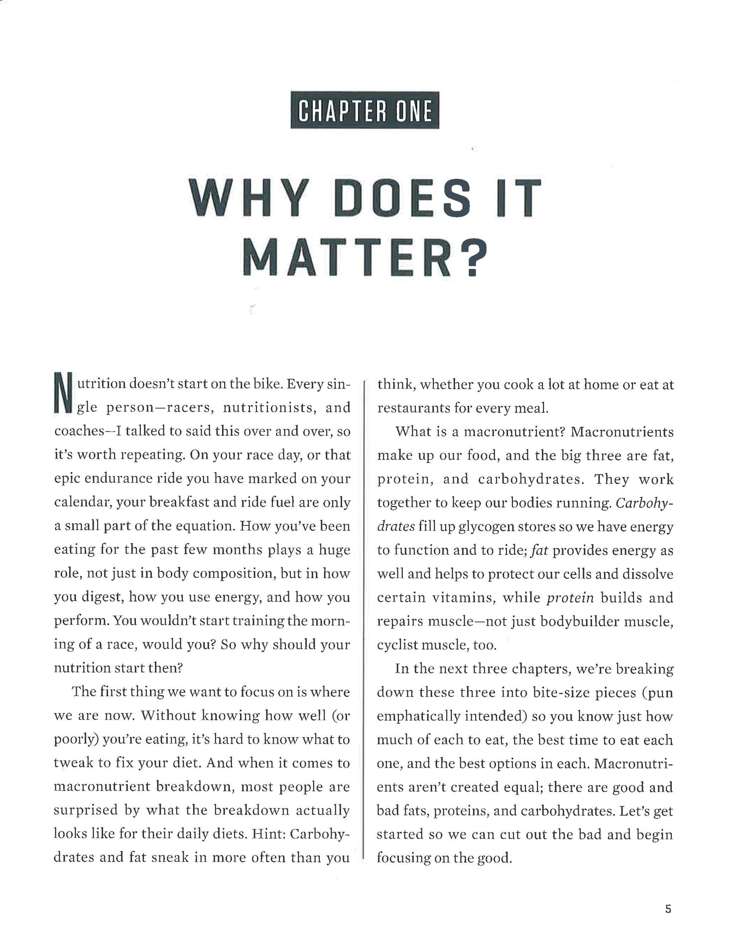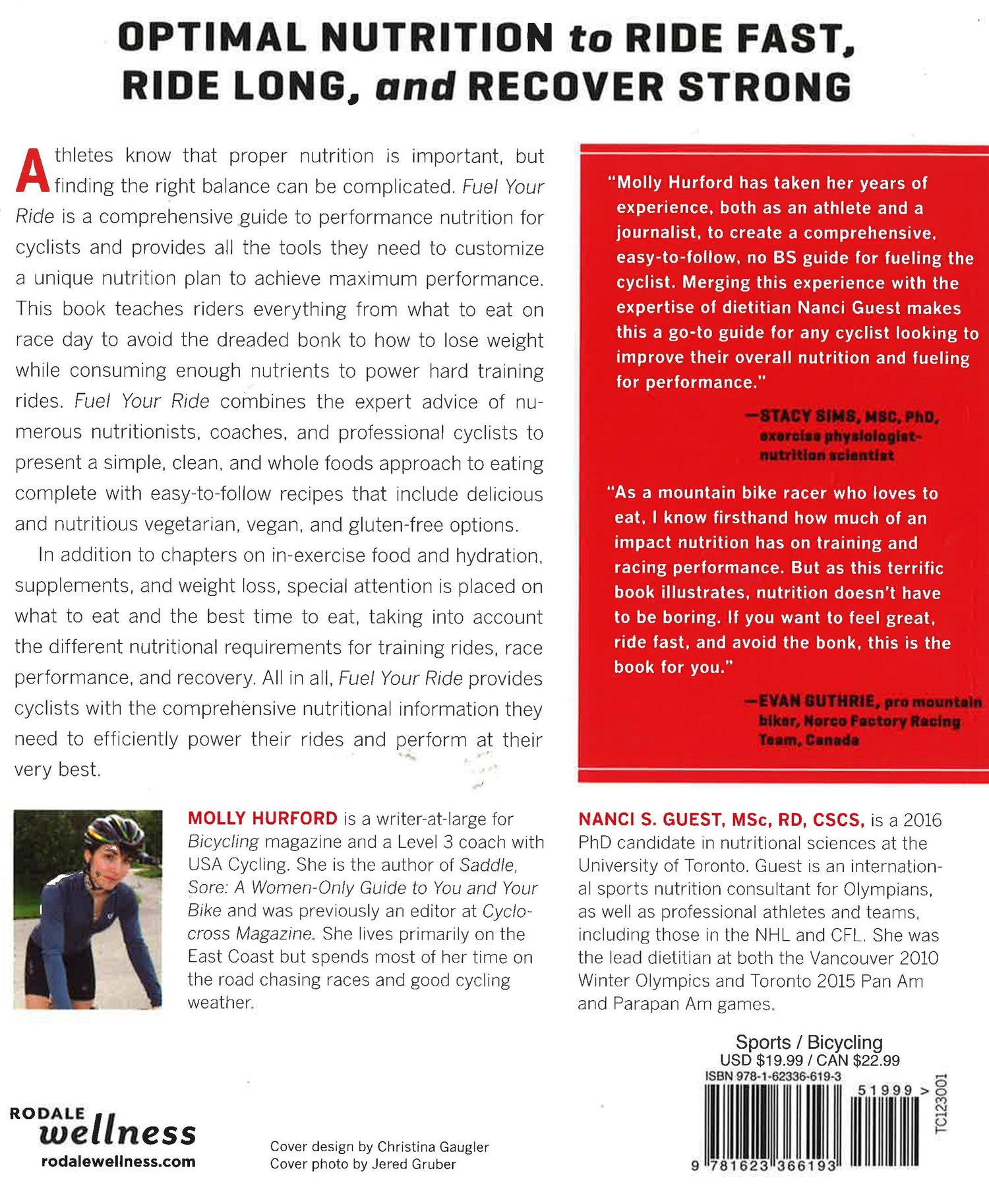 Chapters are broken down by meal, but also include sections on hydration, supplements, gut health, and weight loss-everything a cyclist needs to know to reach peak performance. The text includes recipes that will appeal to a wide range of people within the dietary spectrum, but without pontificating complicated or abstract diet theories or using a typical ingredients and intensive cooking preparations. For example, instead of a 20-ingredient list for a gluten-free pancake, the book showcases a recipe that involves just sweet potatoes, eggs, and a bit of cinnamon with maple syrup. Fuel Your Ride is a readable, interesting, and sometimes humorous diet and nutrition book that pushes the fun without losing the science.