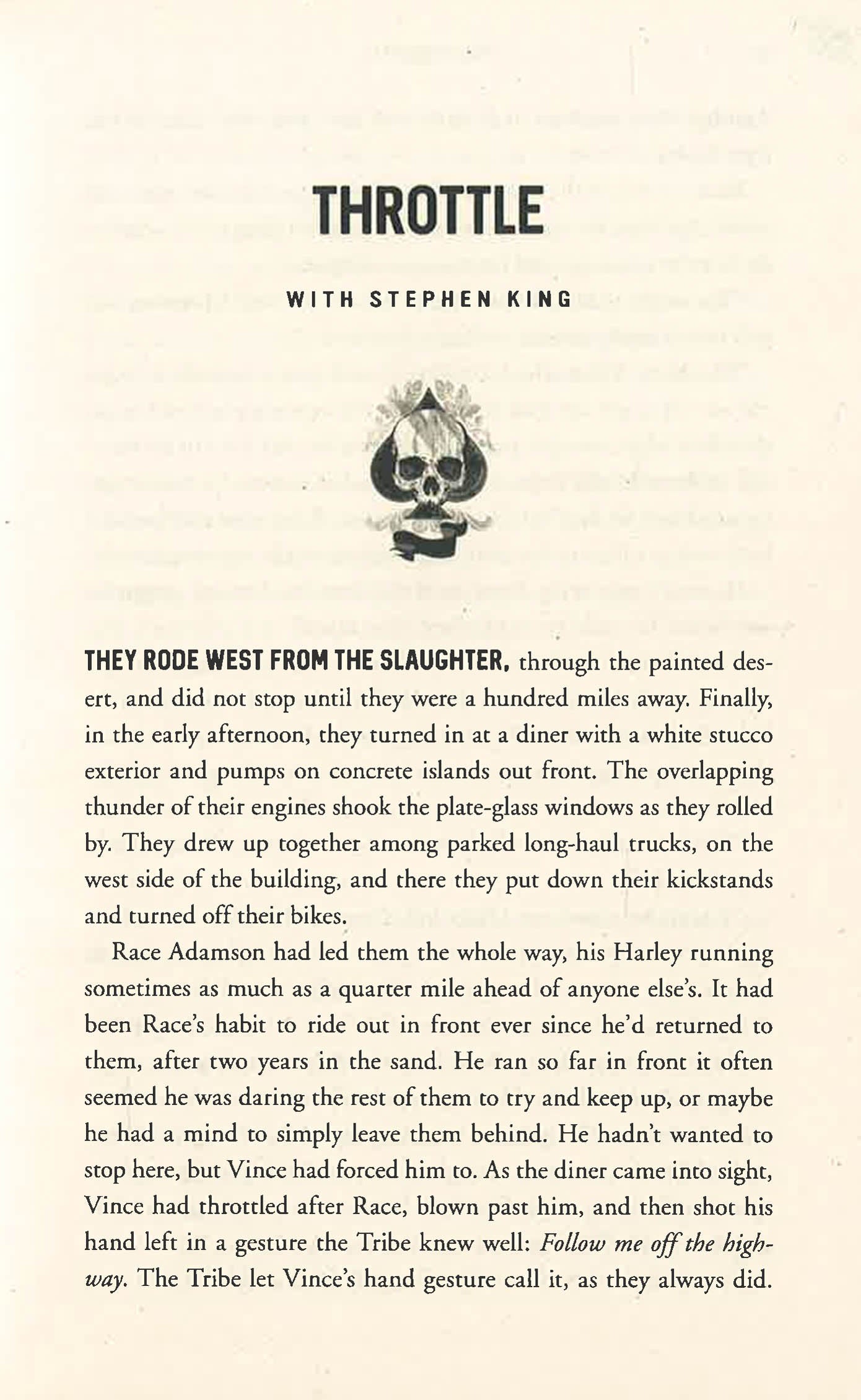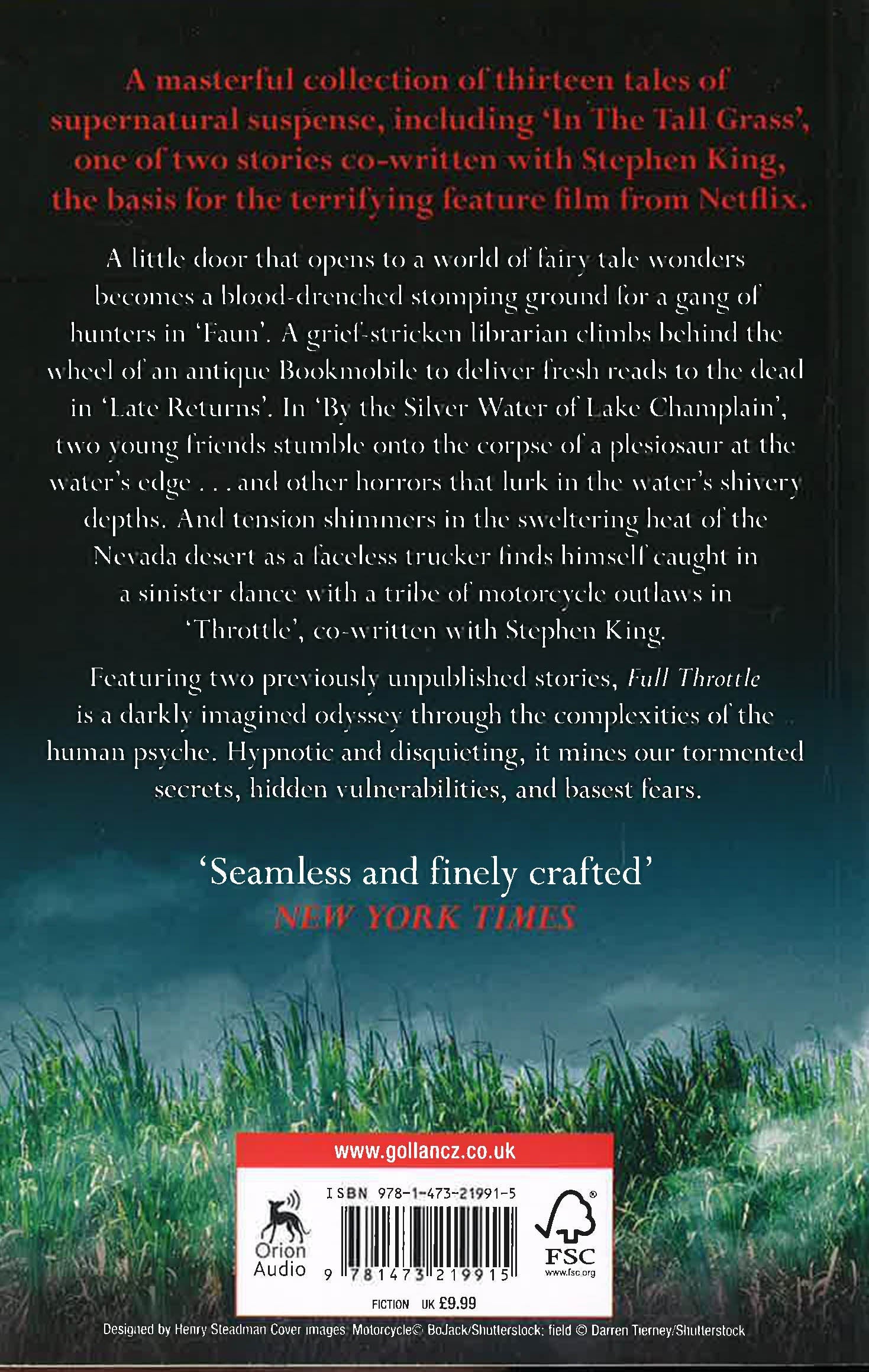 In this masterful collection of short fiction, Joe Hill dissects timeless human struggles in thirteen relentless tales of supernatural suspense, including "In The Tall Grass," one of two stories co-written with Stephen King, basis for the terrifying feature film from Netflix.A little door that opens to a world of fairy tale wonders becomes the blood-drenched stomping ground for a gang of hunters in "Faun." A grief-stricken librarian climbs behind the wheel of an antique Bookmobile to deliver fresh reads to the dead in "Late Returns." In "By the Silver Water of Lake Champlain," two young friends stumble on the corpse of a plesiosaur at the water's edge, a discovery that forces them to confront the inescapable truth of their own mortality . . . and other horrors that lurk in the water's shivery depths. And tension shimmers in the sweltering heat of the Nevada desert as a faceless trucker finds himself caught in a sinister dance with a tribe of motorcycle outlaws in "Throttle," co-written with Stephen King.Featuring two previously unpublished stories, and a bevy of shocking chillers, Full Throttle is a darkly imagined odyssey through the complexities of the human psyche. Hypnotic and disquieting, it mines our tormented secrets, hidden vulnerabilities, and basest fears.