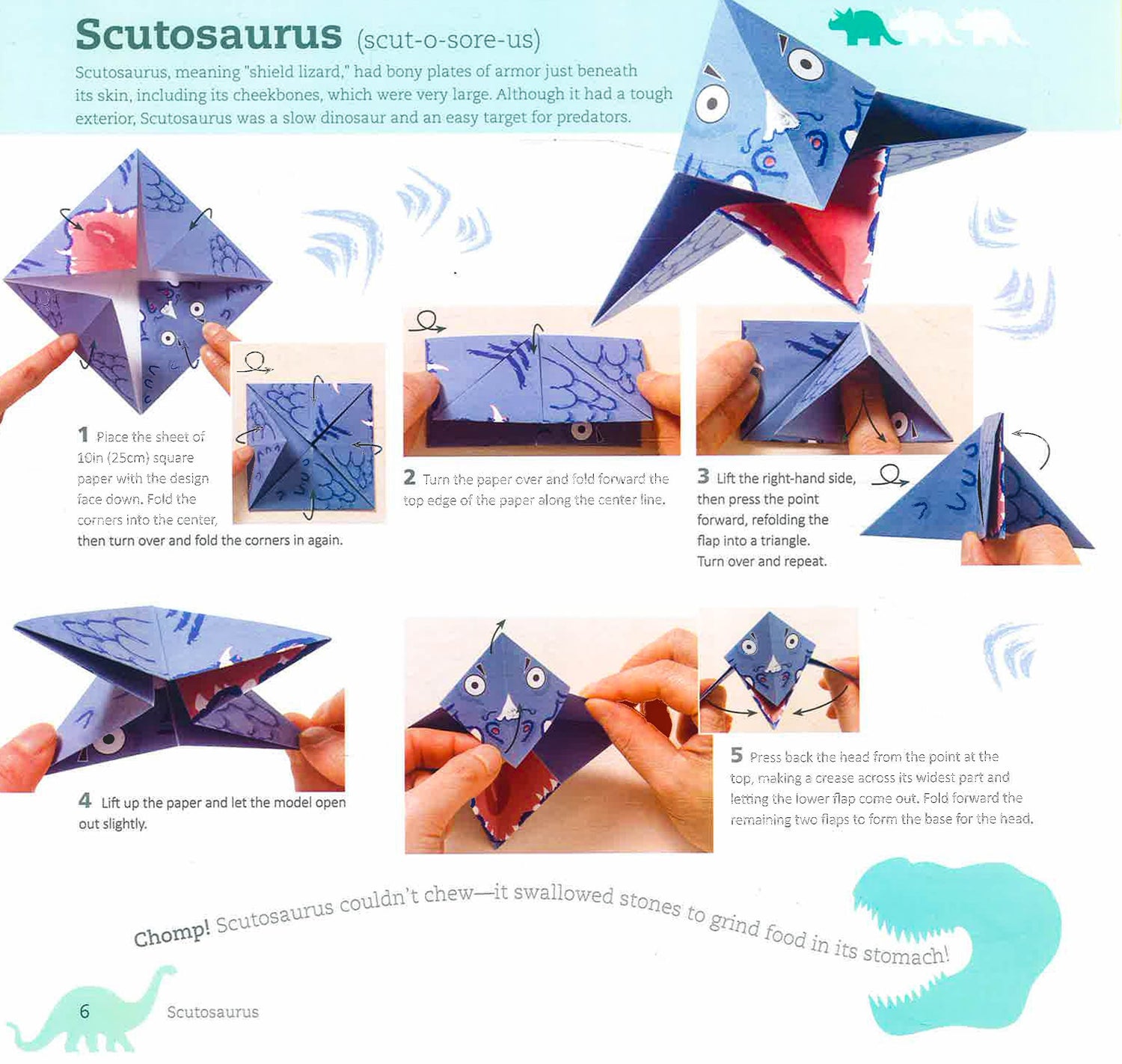 12 step-by-step dinosaur origami projects for children, including paper to make them with.