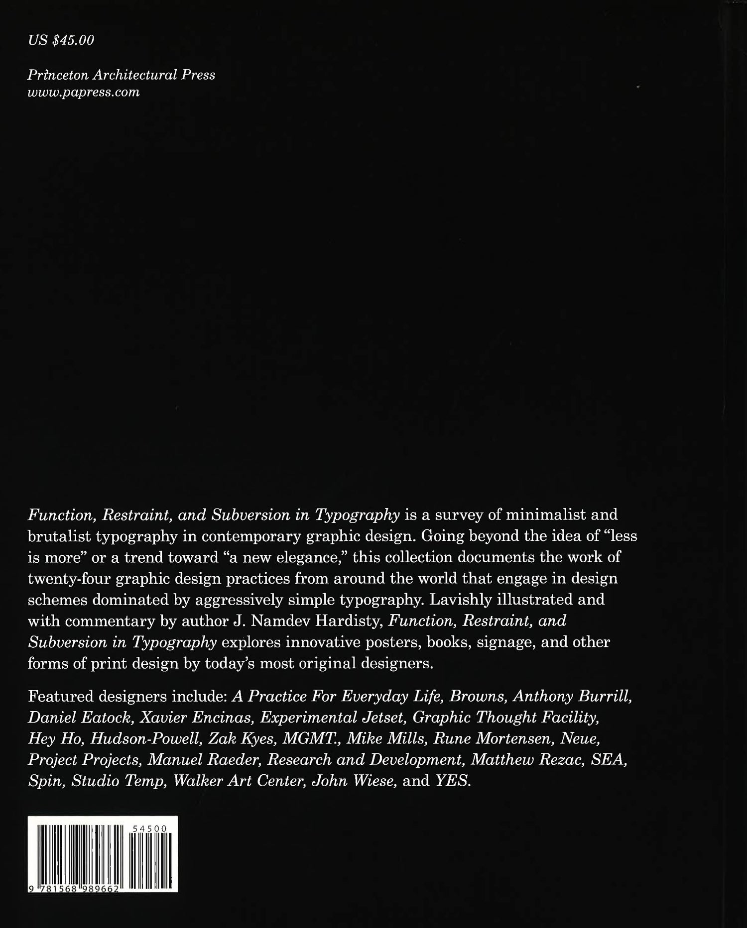 The beauty of contemporary graphic design is that dozens of movements emerge and re-emerge from view. Yet, too often we are left with only the vague impression that something is going on. To appreciate what that might be requires us to slow down, ignore superficial trends, and take a more in-depth look. This is the approach taken by Function, Restraint, and Subversion in Typography, a survey of minimalist and brutalist typography in contemporary graphic design. This international collection documents the work of more than twenty-four graphic designers who engage in an aggressively simple typography. Lavishly illustrated with commentary by author J. Namdev Hardisty, the book explores the innovative posters, books, signage, and other forms of print design by such well-known designers as Daniel Eatock, Experimental Jetset, Spin, the Walker Art Center's design studio, as well as those just beginning to make a mark onthe design world, including MGMT., Project Projects, SEA, Xavier Encinas, Manuel Raeder, YES, and more.