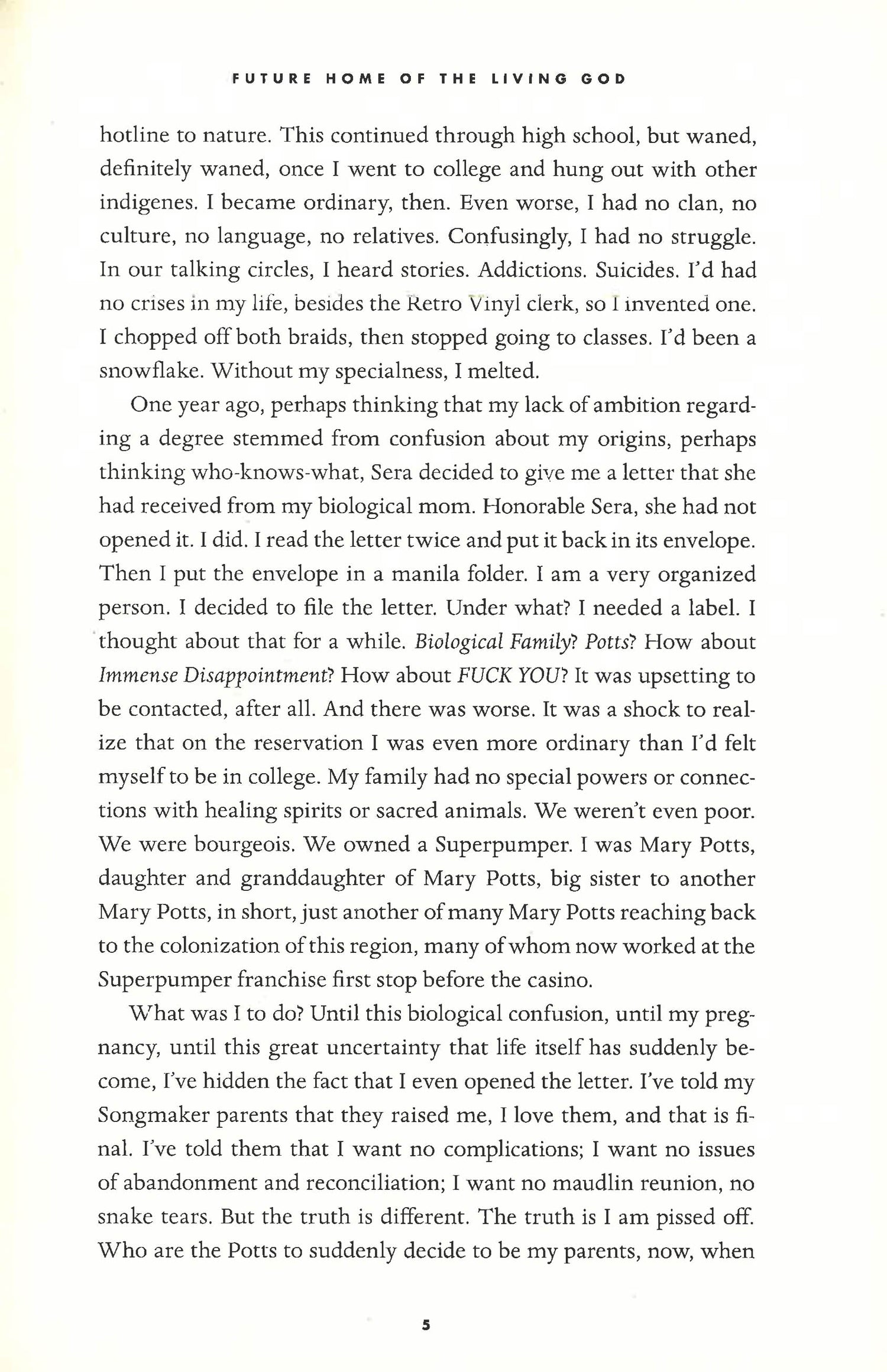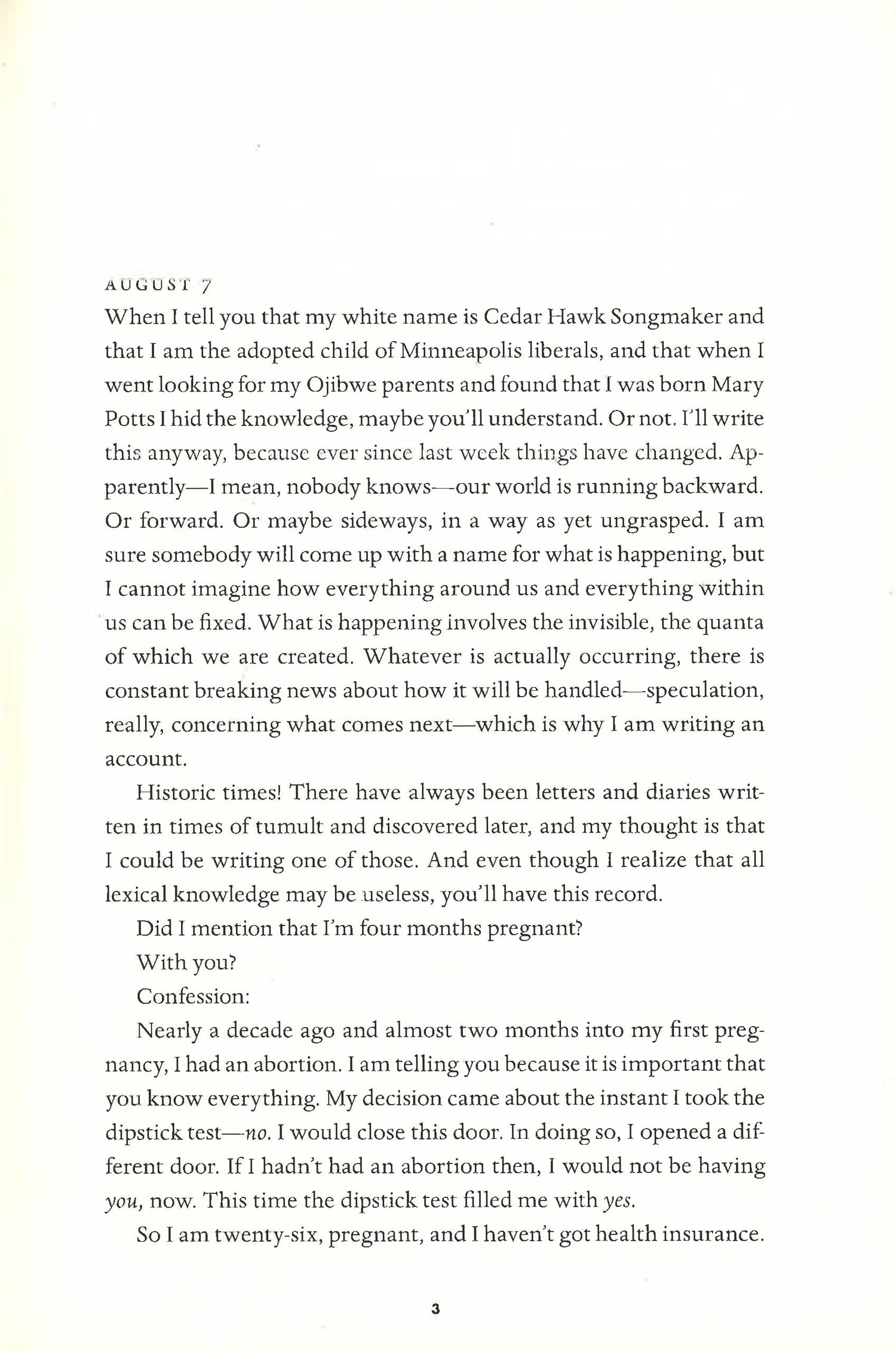 Though she wants to tell the adoptive parents who raised her from infancy, Cedar first feels compelled to find her birth mother, Mary Potts, an Ojibwe living on the reservation, to understand both her and her baby’s origins. As Cedar goes back to her own biological beginnings, society around her begins to disintegrate, fueled by a swelling panic about the end of humanity.