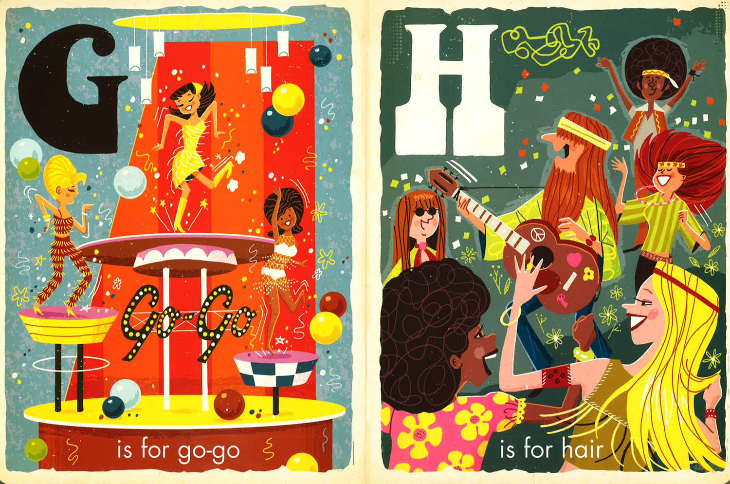 This book includes a fun collection of twenty-six illustrations featuring educational concepts for your toddler from the explosive 1960s, the decade the Baby Boomers came of age. Rock and roll, the space race, pop art, divisive wars both hot and cold, psychedelia, and important gains in civil rights framed this exciting era of cultural and social change.