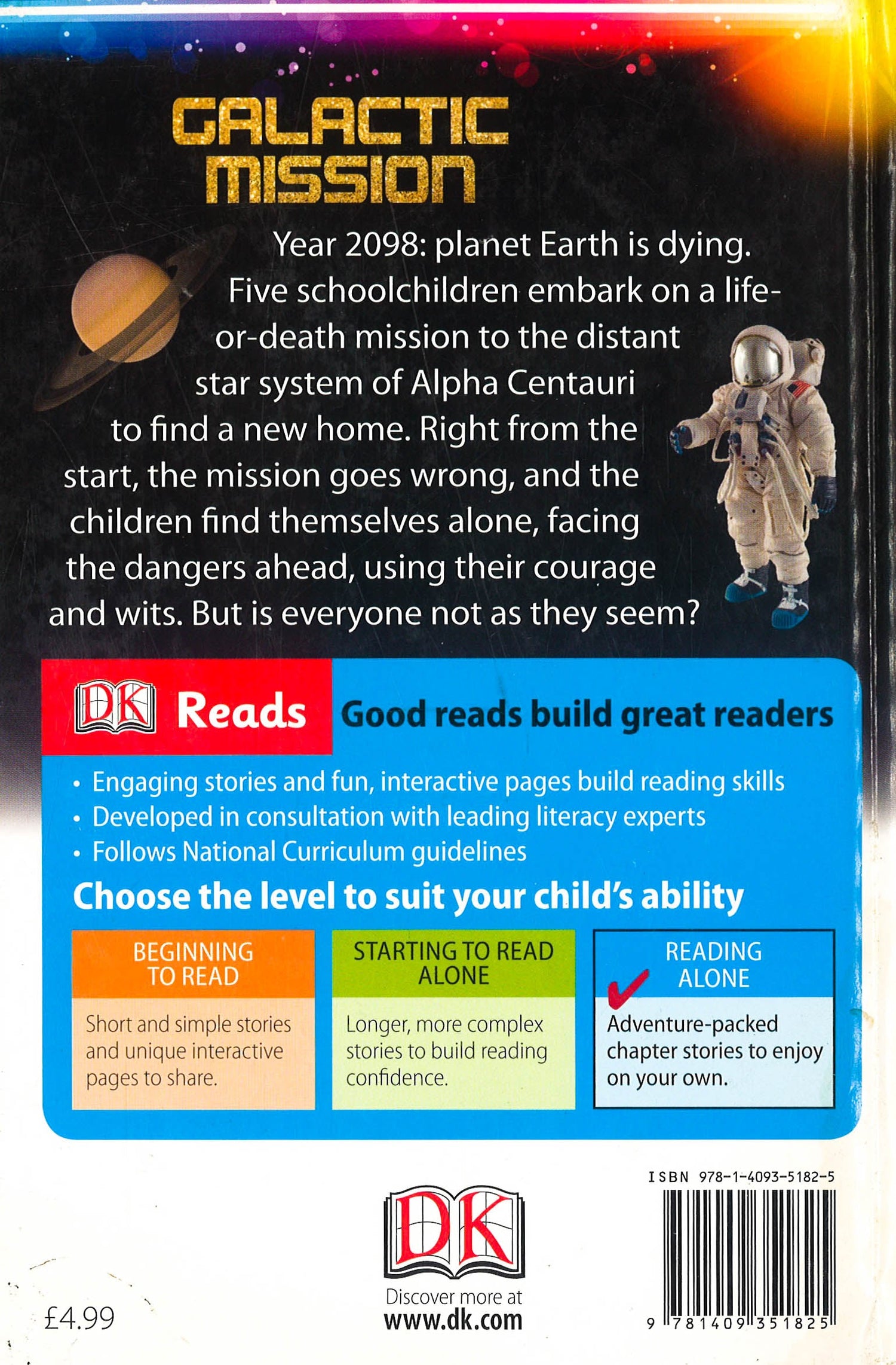 New series from DK designed to help kids learn how to read and learn to love reading Galactic Mission is a 'Reading Alone' reader, perfect for children who are proficient readers, developing the habit of reading widely for both pleasure and information. DK Reads proves that good reads build great readers. Year 2098: planet Earth is dying. Five school children embark on a life or death mission to the distant star system of Alpha Centauri to find a new home. Right from the start, the mission goes wrong, and the children find themselves alone, facing the dangers ahead, using their courage and wits. But is everyone not as they seem? Galactic Mission is part of the new DK Reads series, a three-level reading scheme that helps children become confident readers, featuring engaging and illustrated topics. DK Reads is created in consultation with literacy experts and adheres to levelled reading scheme guidelines so the grammar, vocabulary, and content are spot on for each stage.