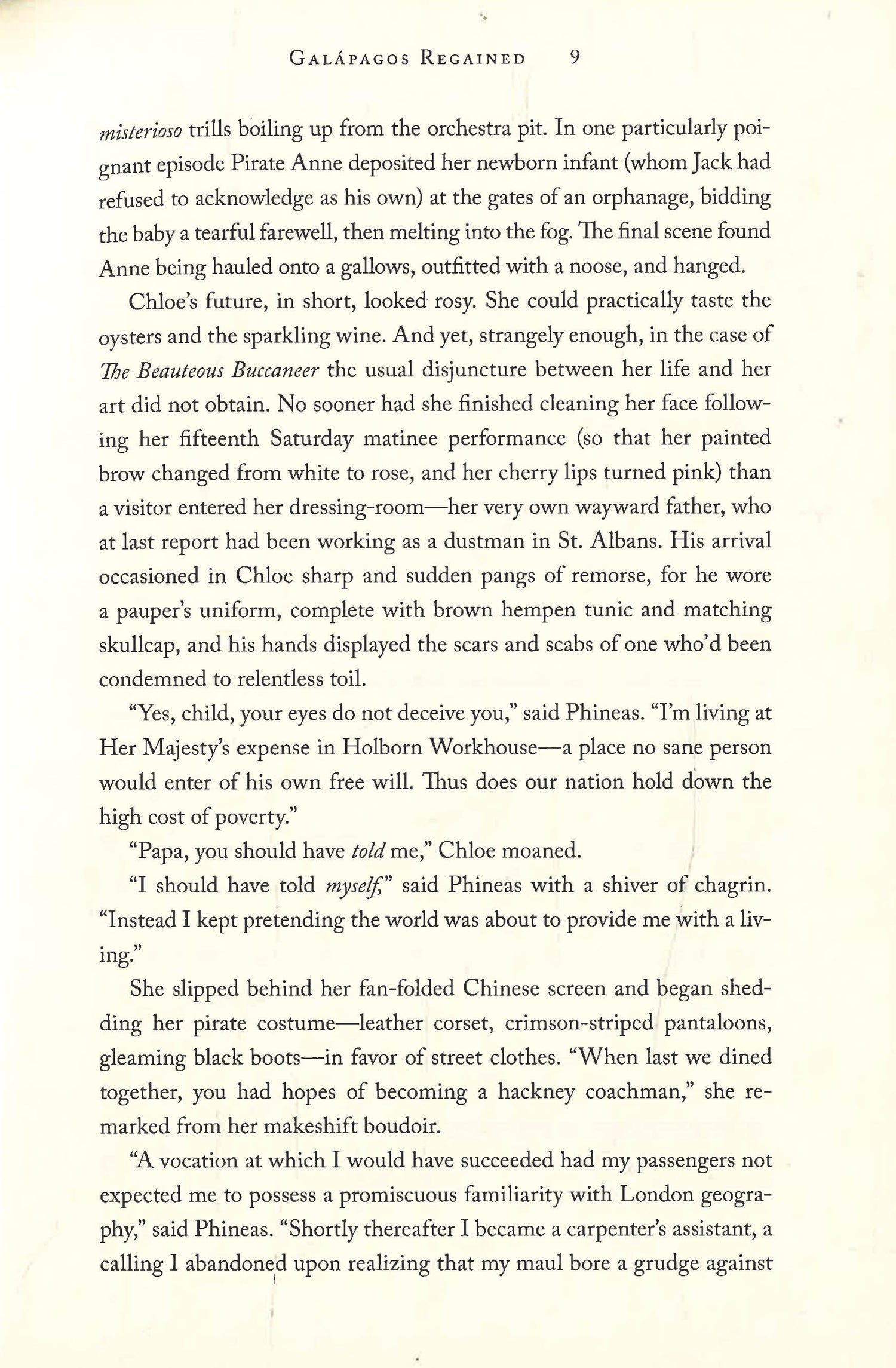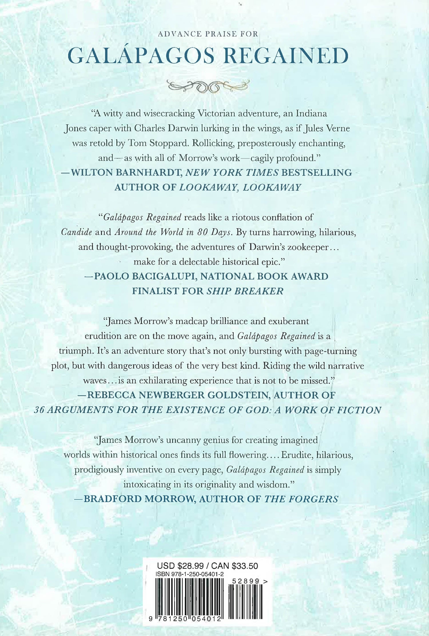 James Morrow's Galápagos Regained centers on the fictional Chloe Bathurst, an unemployed Victorian actress who finds work on Charles Darwin's estate, nurturing the strange birds, exotic lizards, and giant tortoises he brought back from his trip around the world. When Chloe gets wind of the Great God Contest, sponsored by the Percy Bysshe Shelley Society£10,000 to the first petitioner who can prove or disprove the existence of a Supreme Beingshe decides that Mr. Darwin's materialist theory of speciation might just turn the trick. (If Nature gave God nothing to do, maybe He was never around in the first place.) Before she knows it, her ambitions send her off on a wild adventurea voyage by brigantine to Brazil, a steamboat trip up the Amazon, a hot-air balloon flight across the Andesbound for the Galápagos archipelago, where she intends to collect the live specimens through which she might demonstrate evolutionary theory to the contest judges.