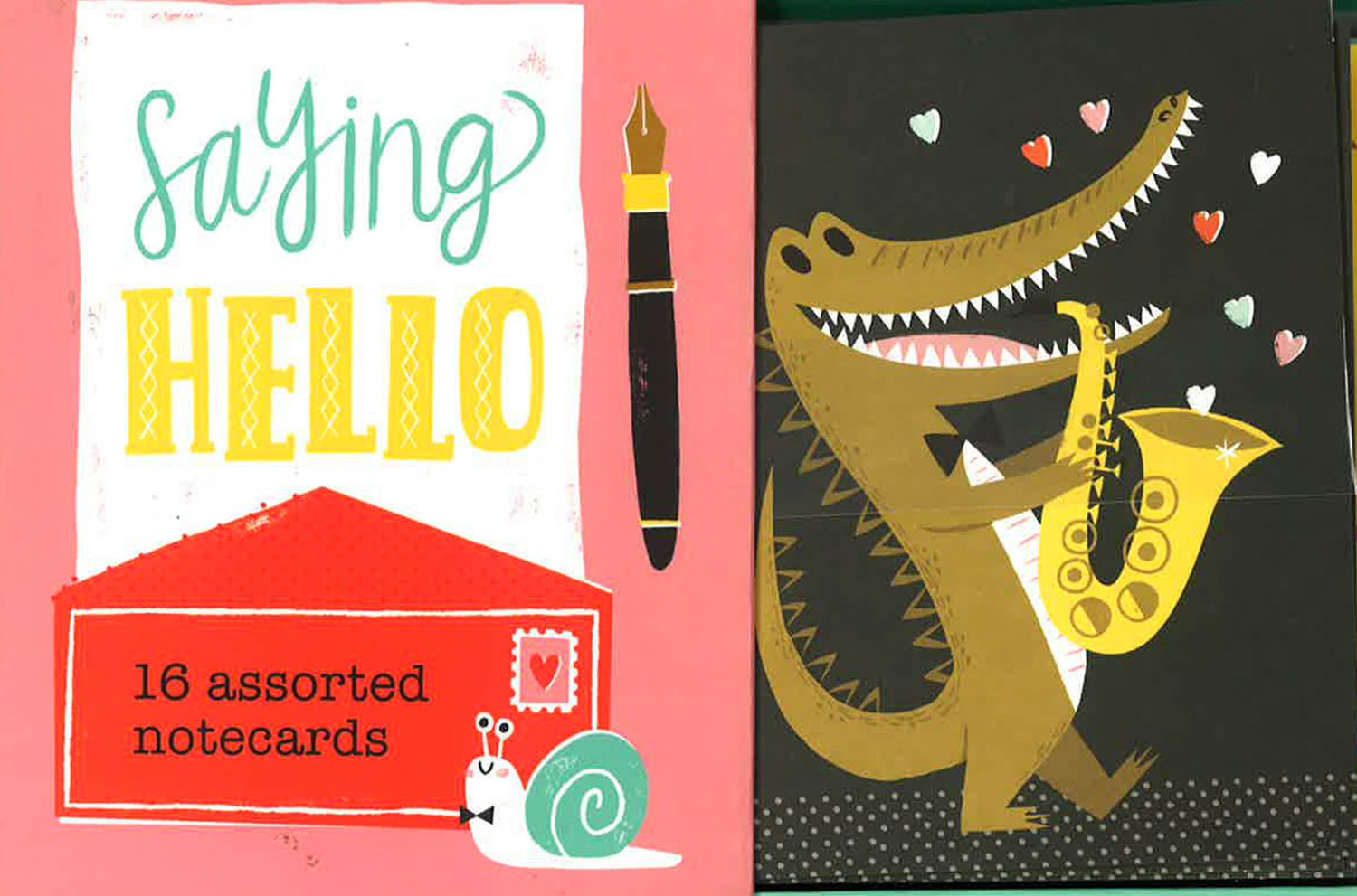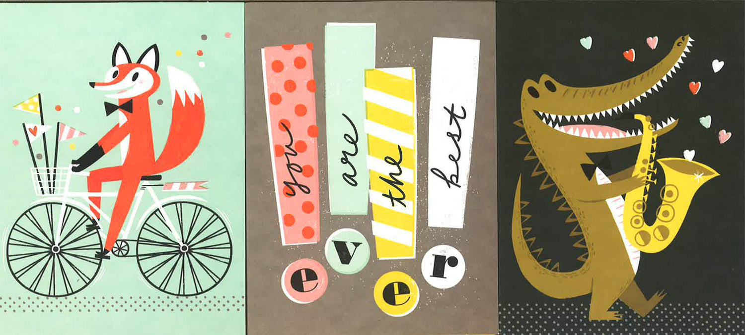 Sixteen assorted cards. Six different designs. 17 colored envelopes.
