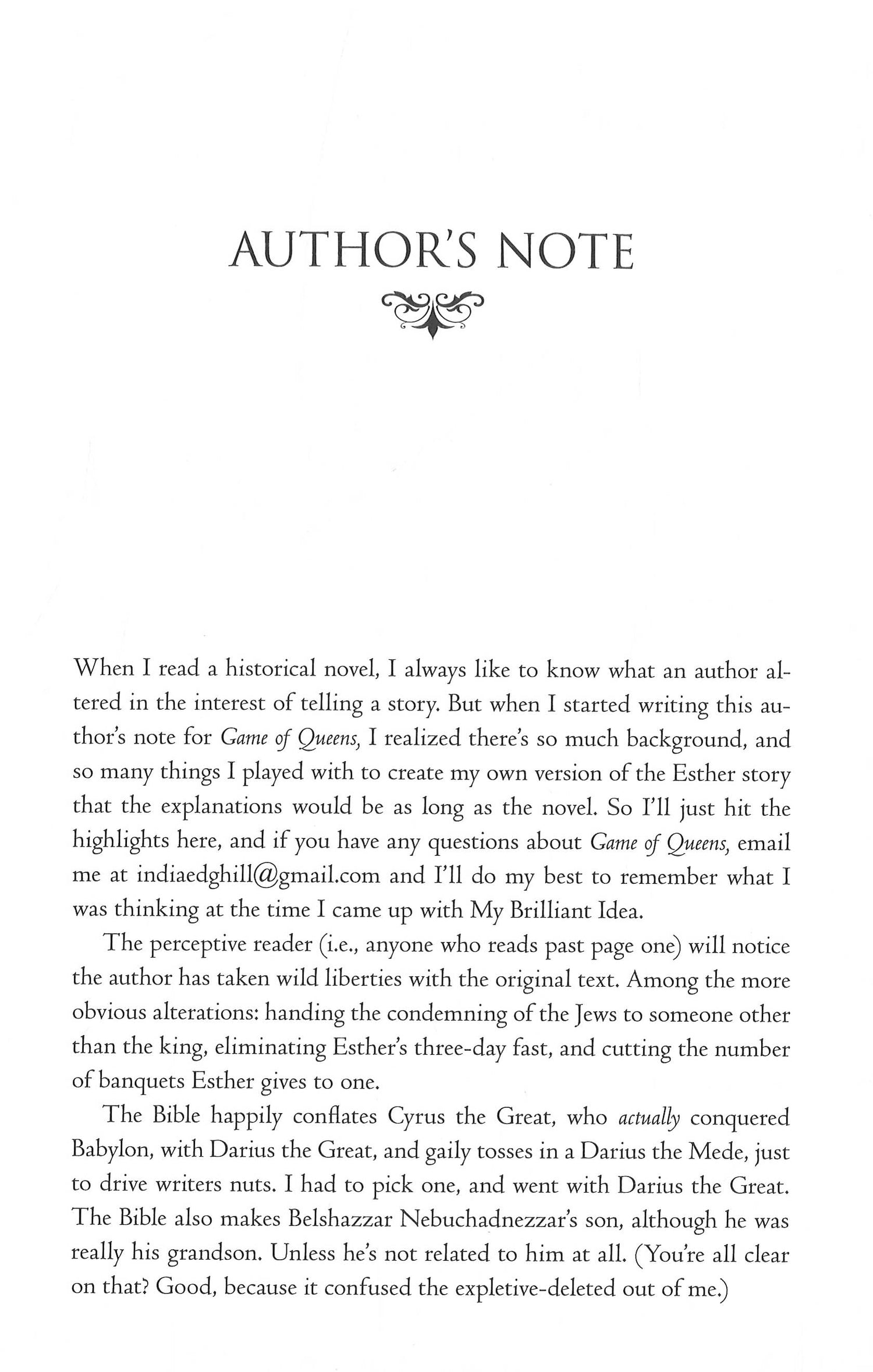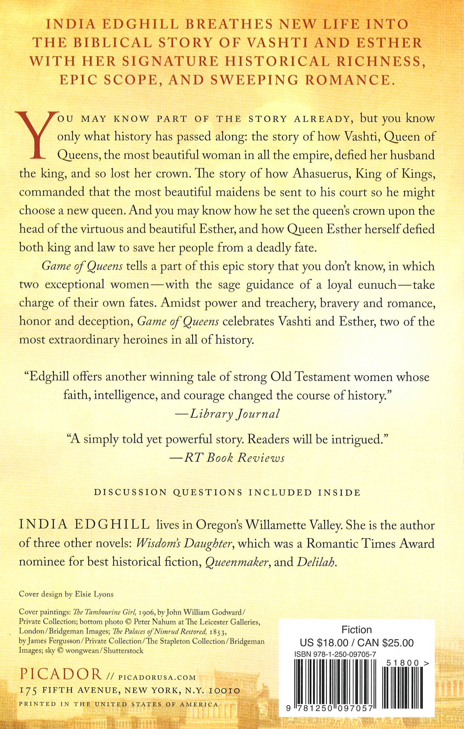 For fans of The Red Tent and The Dovekeepers, India Edghill breathes new life into the biblical story of Vashti and Esther with her signature historical richness, epic scope, and sweeping romance.You may know part of the story already, but you know only what history has passed along: the story of how Vashti, Queen of Queens, the most beautiful woman in all the empire, defied her husband the king, and so lost her crown. The story of how Ahasuerus, King of Kings, commanded that the most beautiful maidens be sent to his court so he might choose a new queen. And you may know how he set the queen's crown upon the head of the virtuous and beautiful Esther, and how Queen Esther herself defied both king and law to save her people from a deadly fate.Game of Queens tells the part of this epic story that you don't know, in which two exceptional women--with the sage guidance of a loyal eunuch--take charge of their own fates. Amidst power and treachery, bravery and romance, honor and deception, Game of Queens celebrates Vashti and Esther, two of the most extraordinary heroines in all of history.