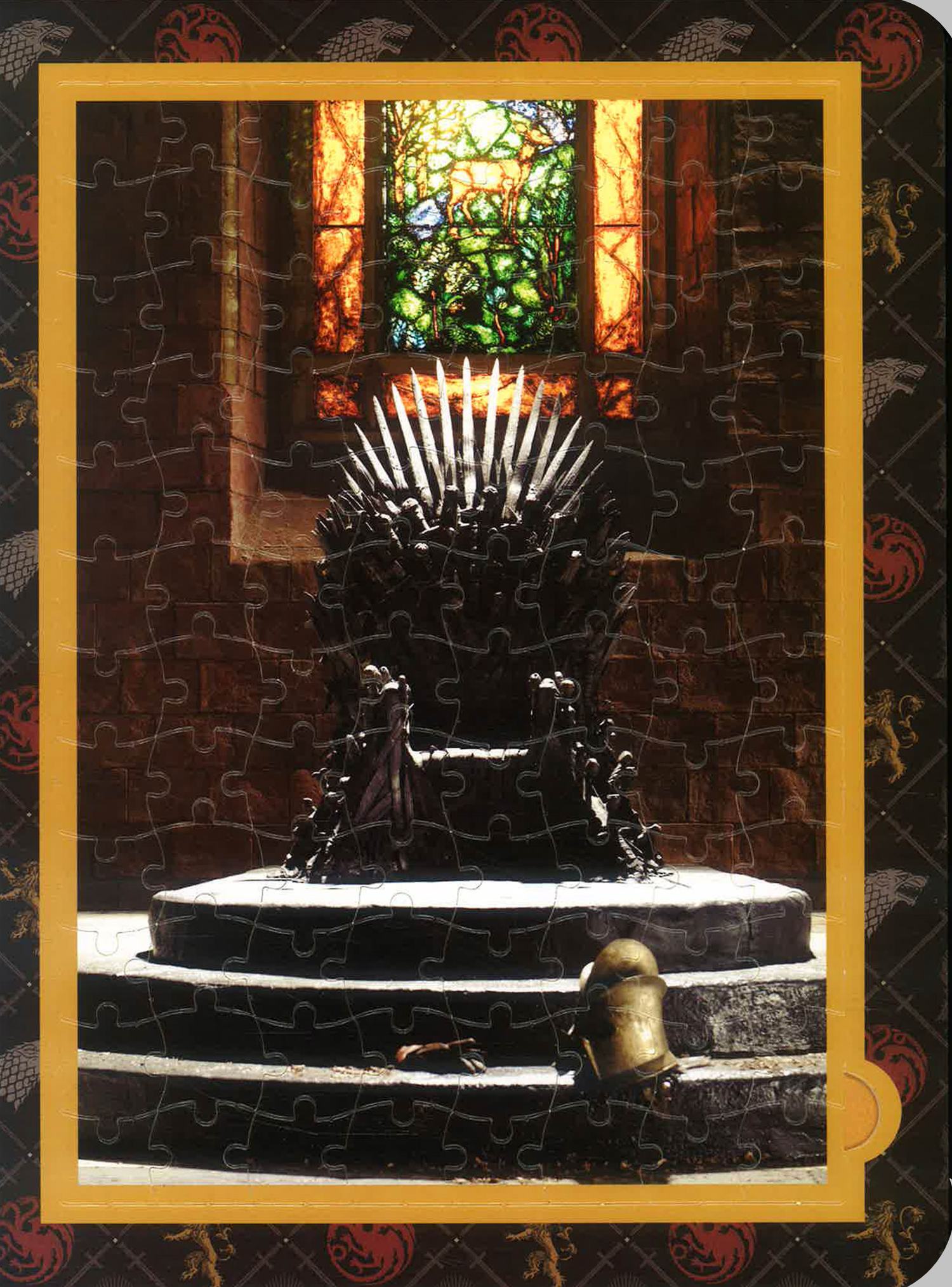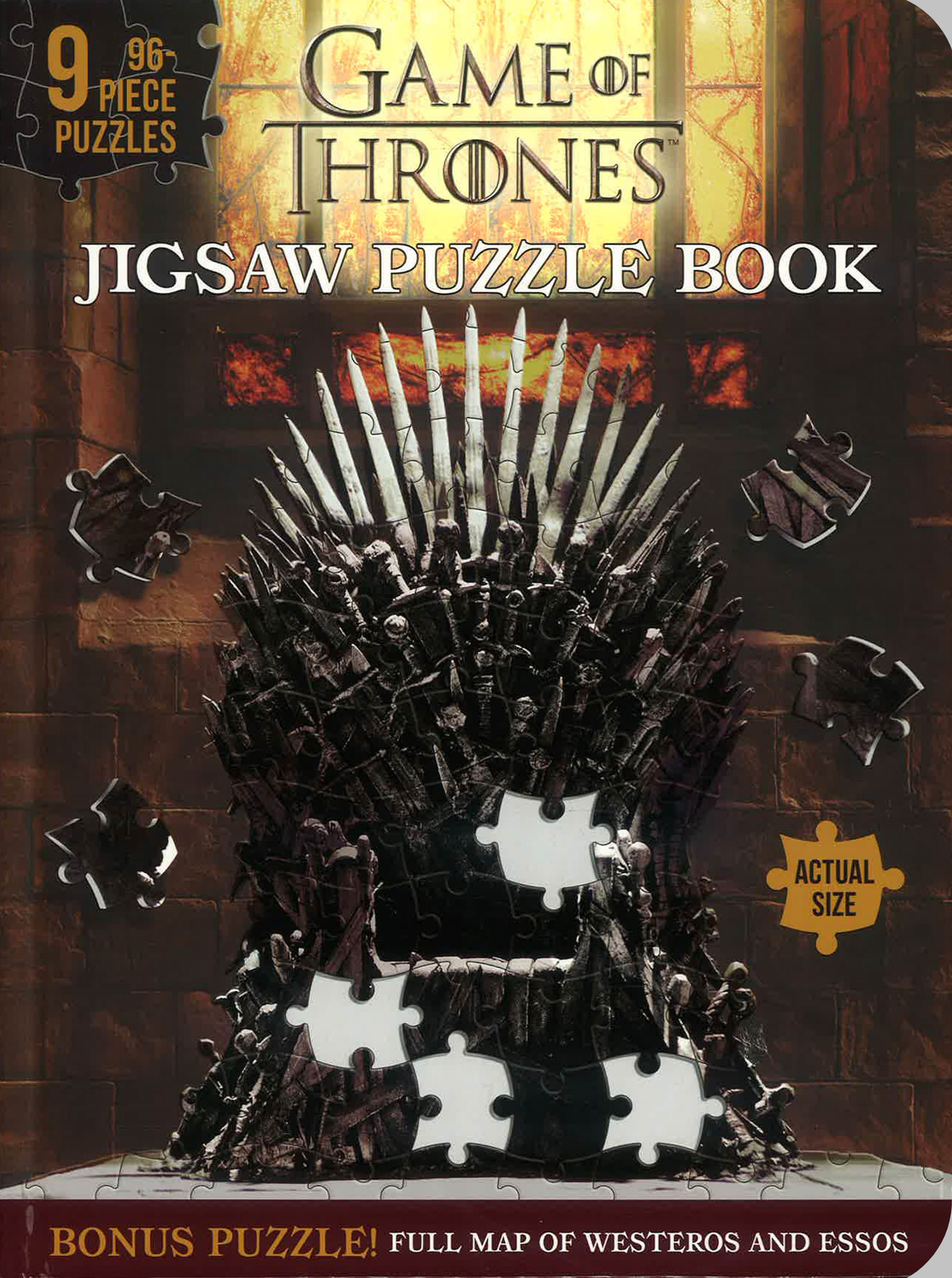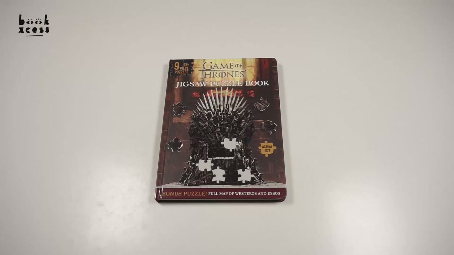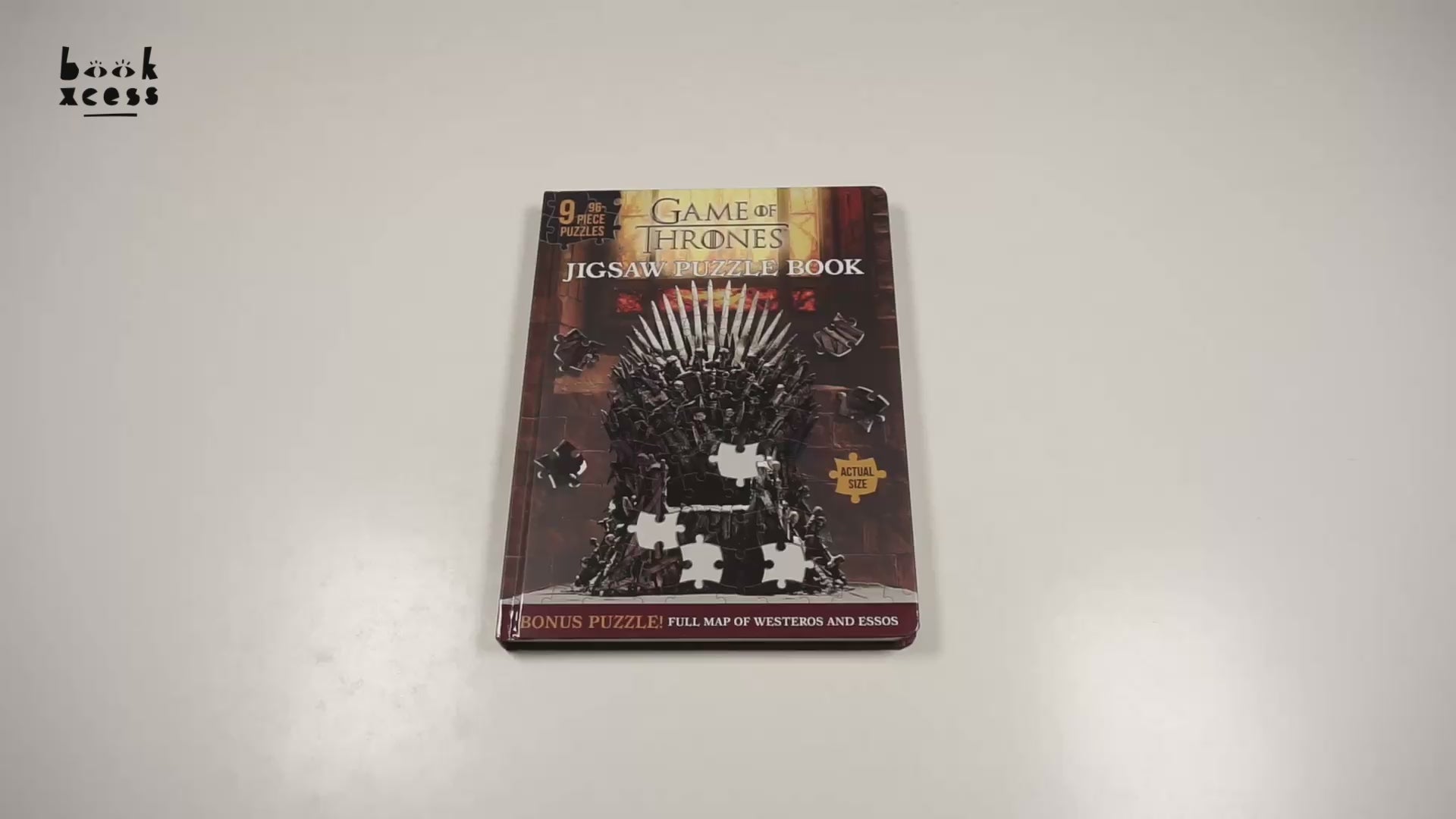 Nine 96-piece jigsaw puzzles bound together like a book feature iconic scenes, characters, and trivia from the hit HBO series Game of Thrones.