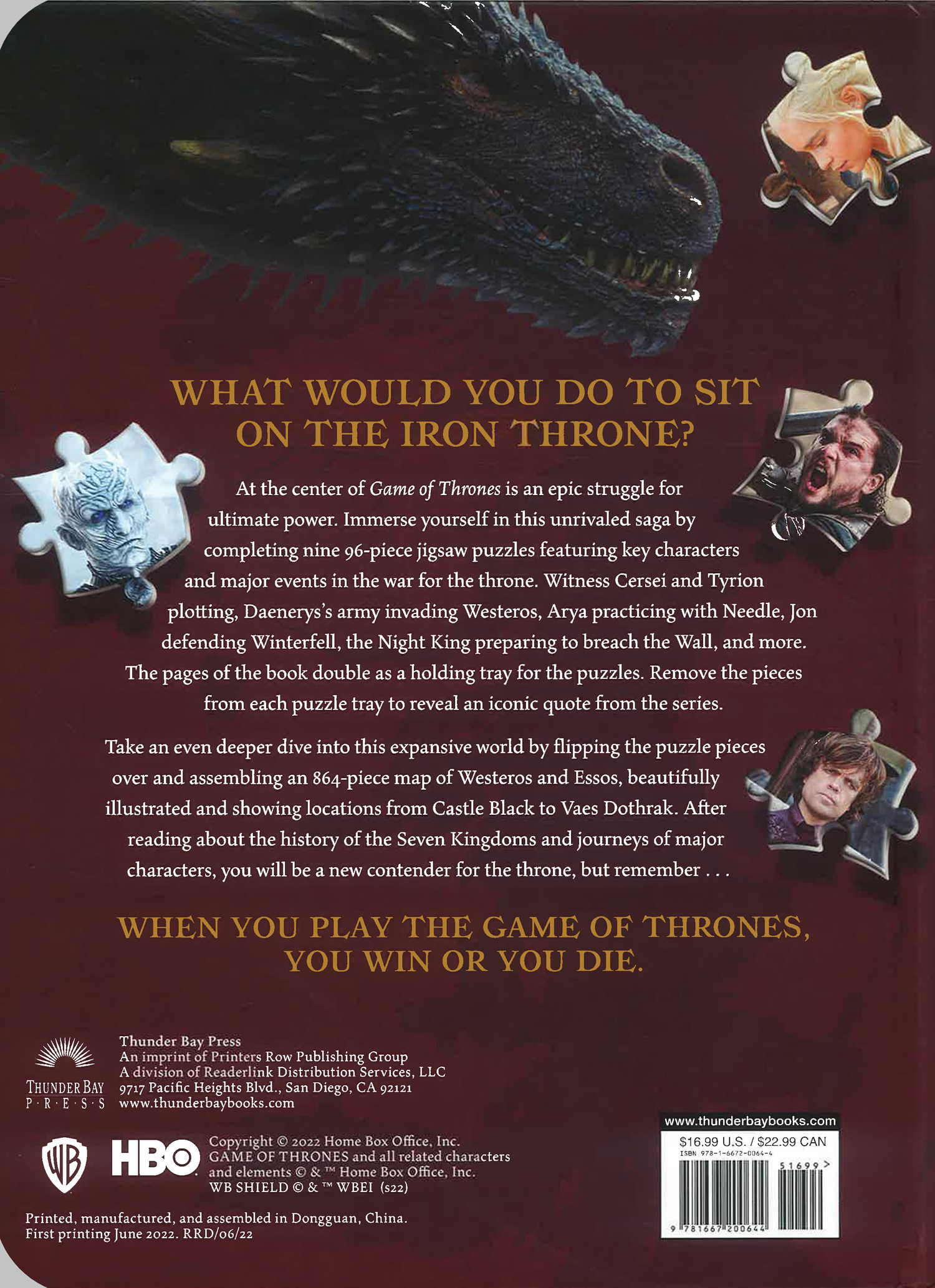 The world of Westeros is at your fingertips as you learn trivia and facts from the hit HBO series Game of Thrones and piece together nine 96-piece jigsaw puzzles featuring iconic characters and scenes. Each puzzle is accompanied by informative text about the depicted characters, giving readers further insight to their importance in the series. As a bonus, the back side of each puzzle shows a section of a map—and when laid out side by side, the nine puzzles form the entire map of Westeros and the surrounding lands. The puzzles all fit into individual recessed trays in the book’s pages, keeping the puzzles in place wherever you go.
