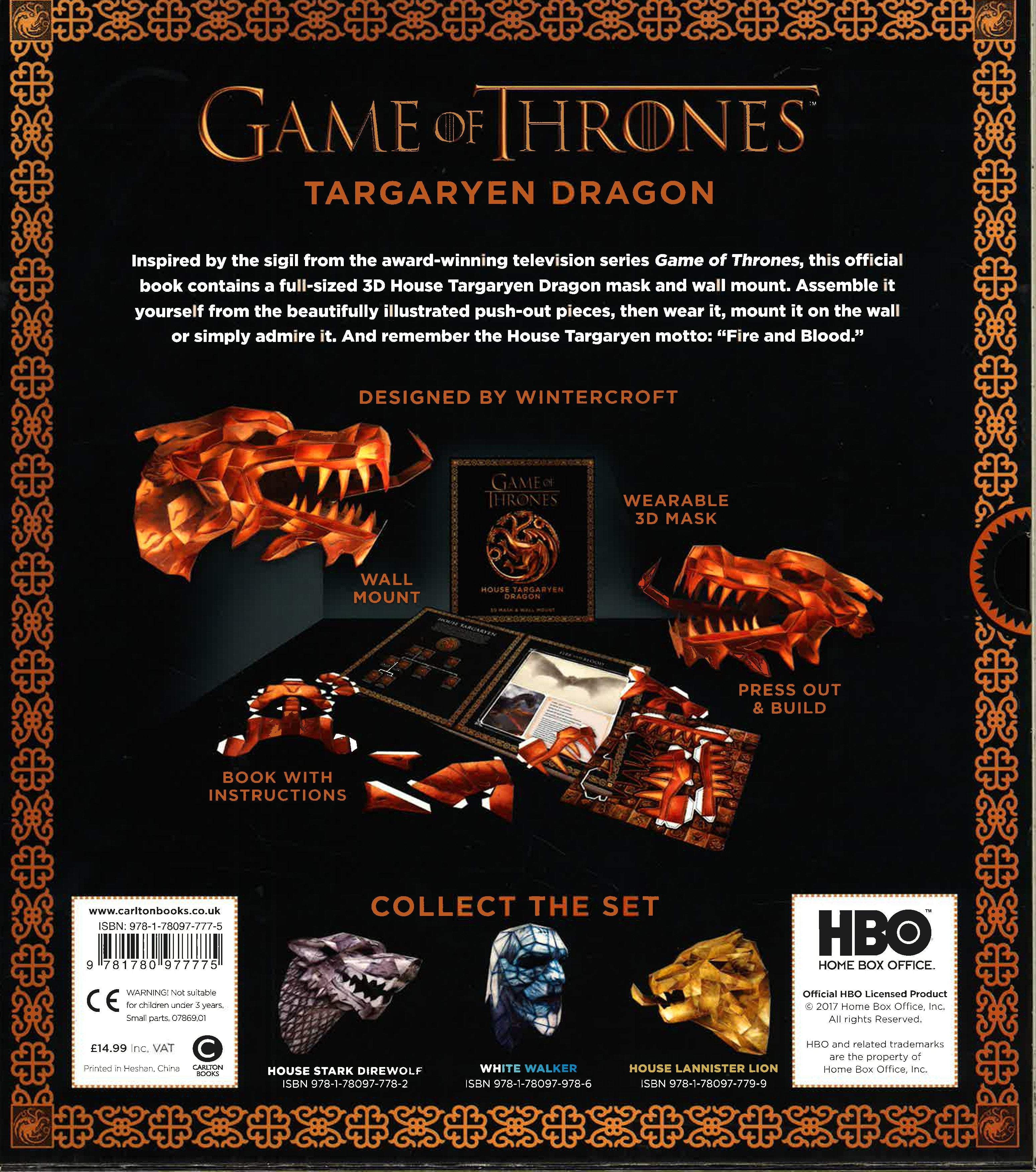 Honour the noble houses of Westeros, and warn others of the coming winter with the official Game of Thrones 3D Mask and Wall Mount series. Using Wintercroft's fantastic 3D mask designs, take these iconic house sigils and create easy-to-make masks either to wear, or to mount on your wall as trophies. The Targaryens take what they want though 'fire and blood' - show you do the same with this fantastic mount, perfect for any Game of Thrones fan's home.