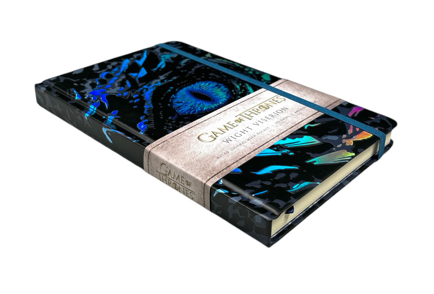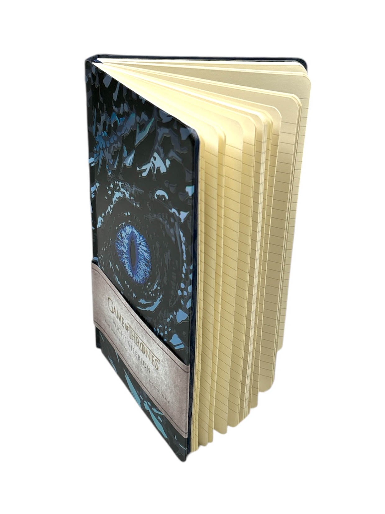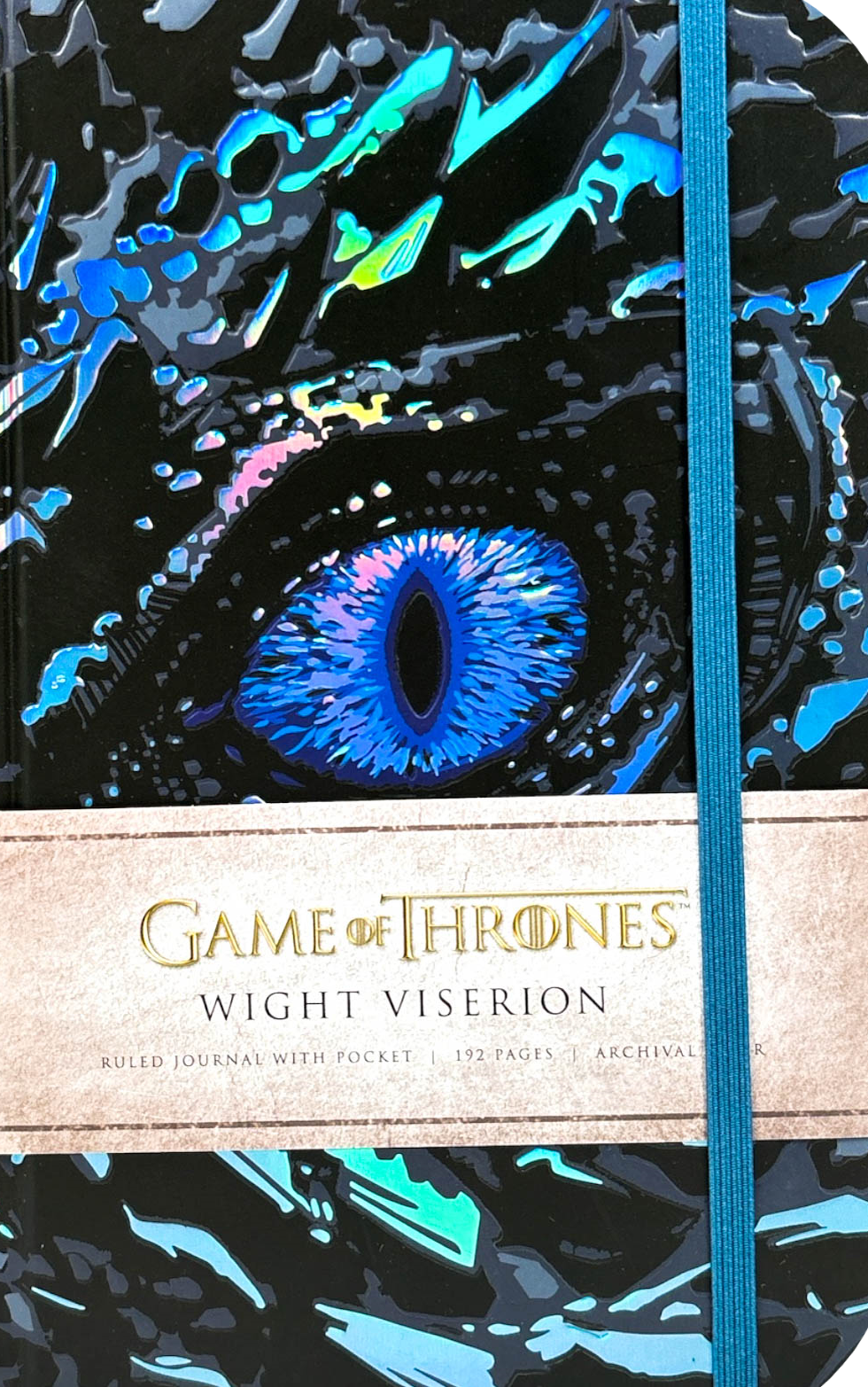 Celebrate the final season of HBO’s Game of Thrones with this hardcover ruled journal, based on Daenerys Targaryen’s dragon, Viserion, after his shocking transformation by the Night King. Featuring a unique sculpted cover and a textured case, this hardcover journal lies flat when open and includes 192 ruled pages, a ribbon placeholder, an elastic band, and a back pocket for storing keepsakes and mementos.