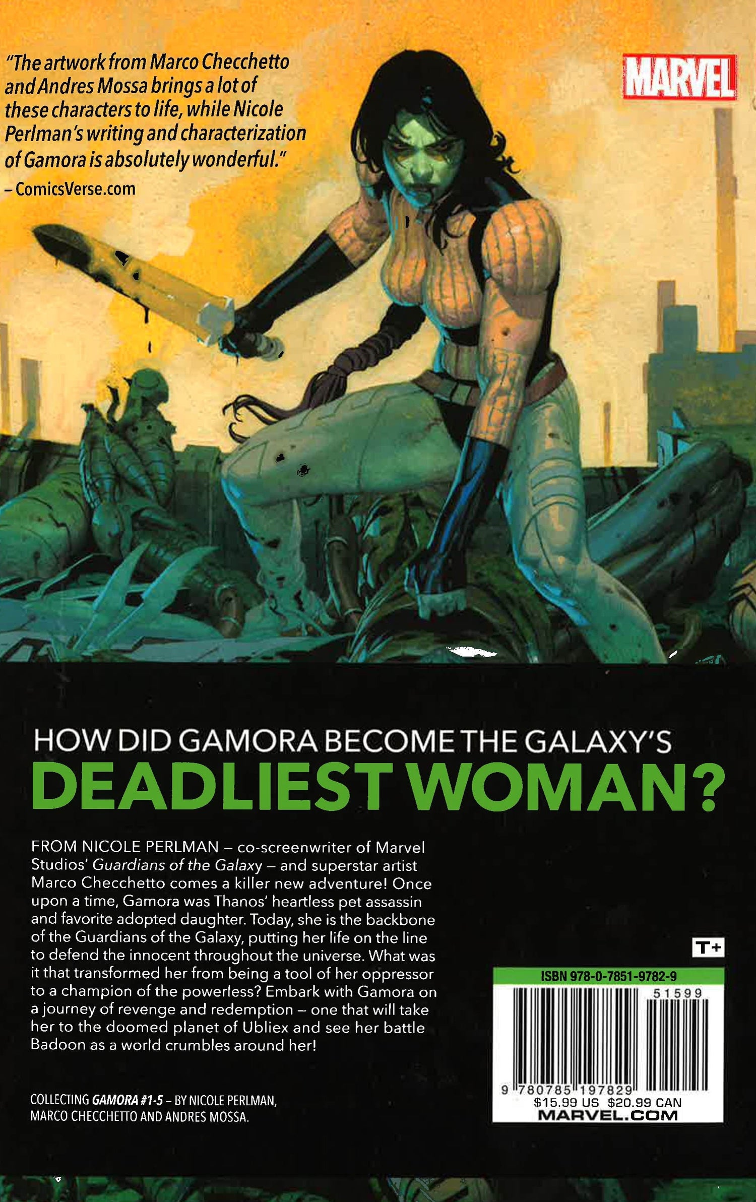 From screenwriter Nicole Perlman - co-writer of the Guardians of the Galaxy screenplay - and Marvel superstar artist Marco Checchetto, comes a killer new ongoing series! Once upon a time, Gamora was Thanos' heartless pet assassin and favorite adopted daughter. Today, she is the backbone of the Guardians of the Galaxy, putting her life on the line to defend the innocent throughout the universe. What was it that transformed her from being used as a tool of her oppressor, to a champion of the powerless? Embark on a journey of revenge and redemption, and witness how Gamora earned her reputation as the Deadliest Woman in the Galaxy.