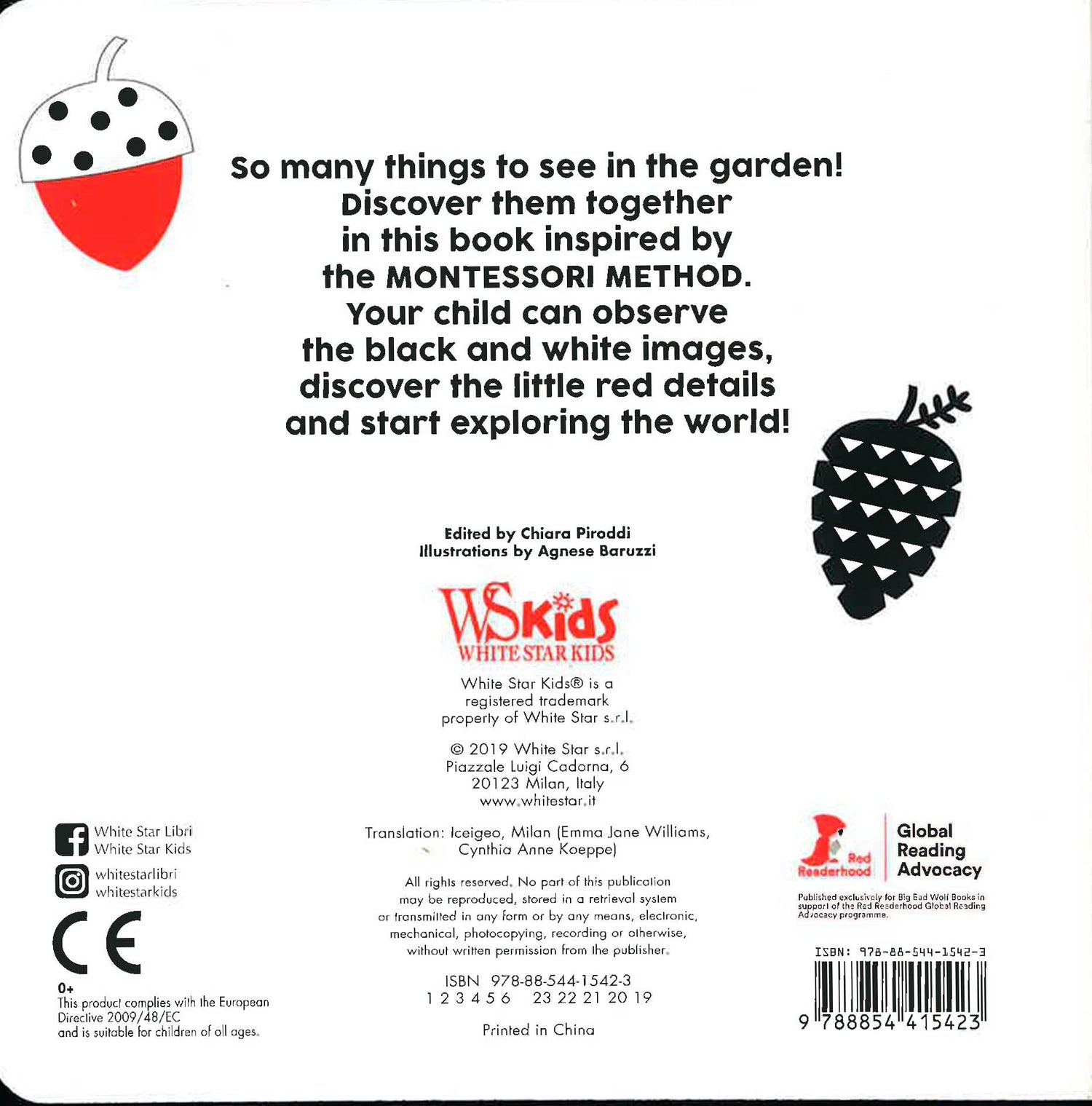 In this new collection, the Black White Red Baby Montessori board books, the scientific studies on the visual development and the Montessori theory on the visual skills of new-borns are combined to stimulate the attitude of babies in recognizing shapes and figures with net borders. The four board books propose progressive visual complexity, starting from black and white contrast and moving on with a third vibrant colour: red. Red is recognized by the baby from the third month of life forward. The variety of subjects (animals, vegetables, fruits, path to follow with the fingers) keep the interest of the baby during the first year of life