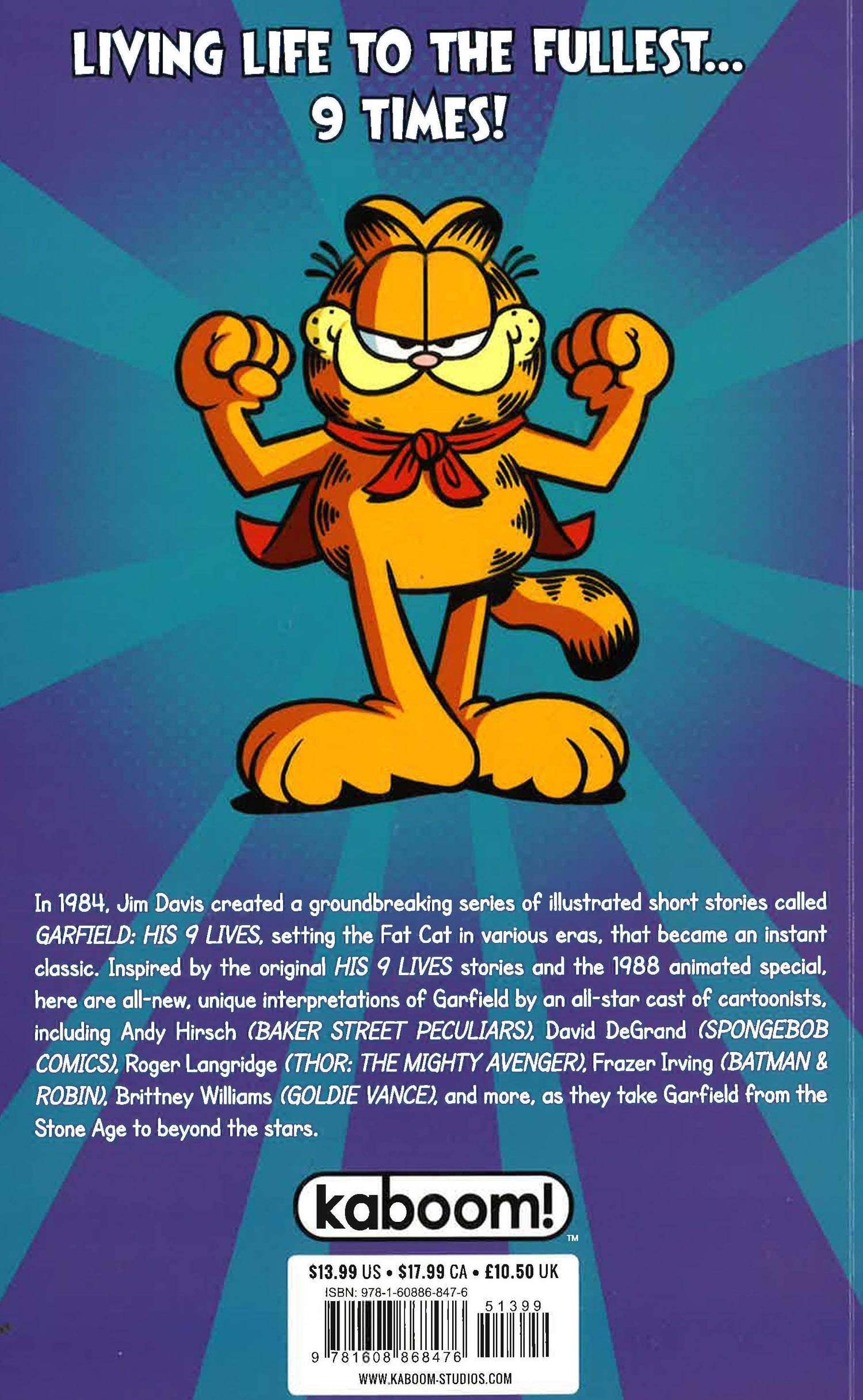 In 1984, Jim Davis created a groundbreaking series of illustrated short stories called Garfield: His 9 Lives, setting the Fat Cat in various eras, that became an instant classic, both as a book, and an acclaimed animated special. Now, join an all-star cast of cartoonists, including Andy Hirsch (Baker Street Peculiars), David DeGrand, Roger Langridge (Snarked), Brittney Williams (Goldie Vance), Frazer Irving, and Genevieve FT, as they depict Garfield through the ages, from prehistoric times, to the reaches of outer space, updating a modern classic for a new generation.
