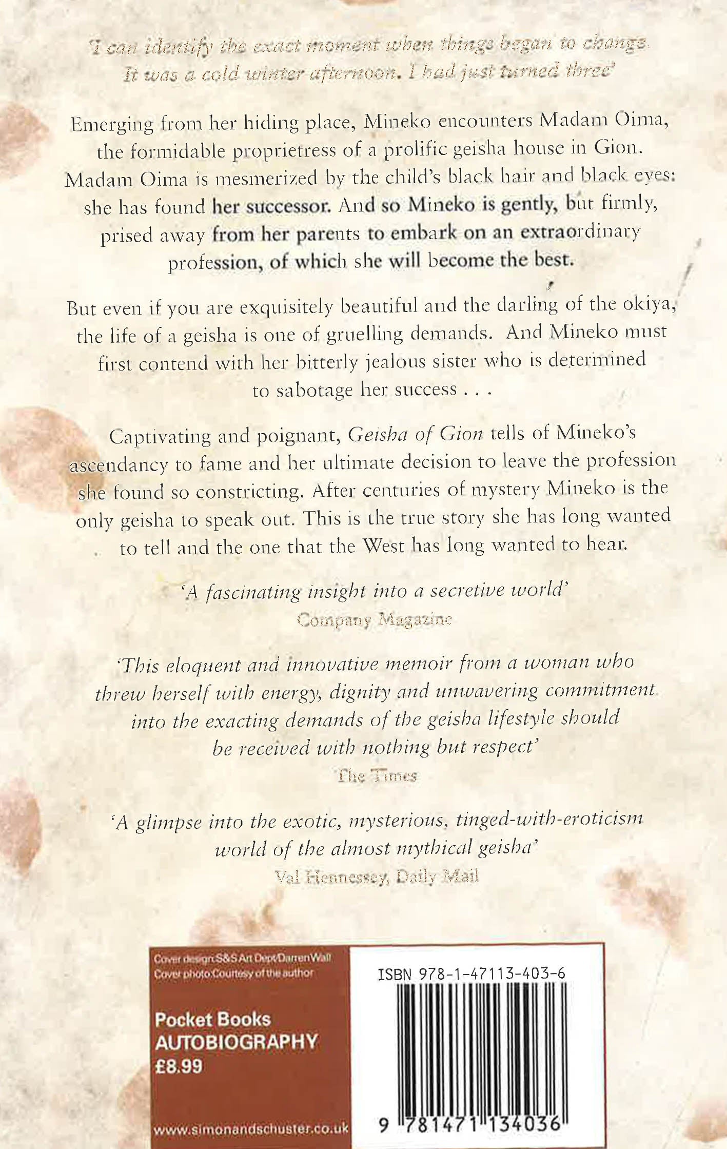 Emerging from her hiding place, Mineko encounters Madam Oima, the formidable proprietress of a prolific geisha gouse in Gion. Madam Oima is mesmerized by the child's black hair and black eyes, she found her succesor. And so Mineko in gently , but firmly, prised away from her parents to embark on an extraordinary profession, of which she will become the best.