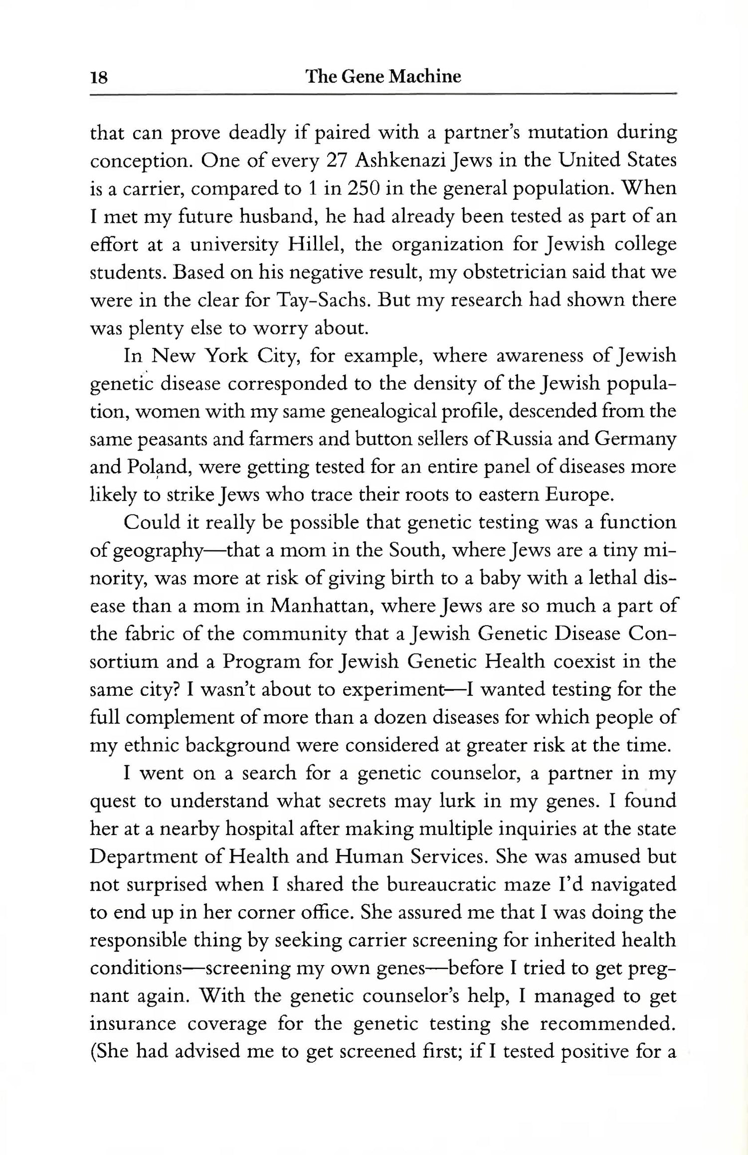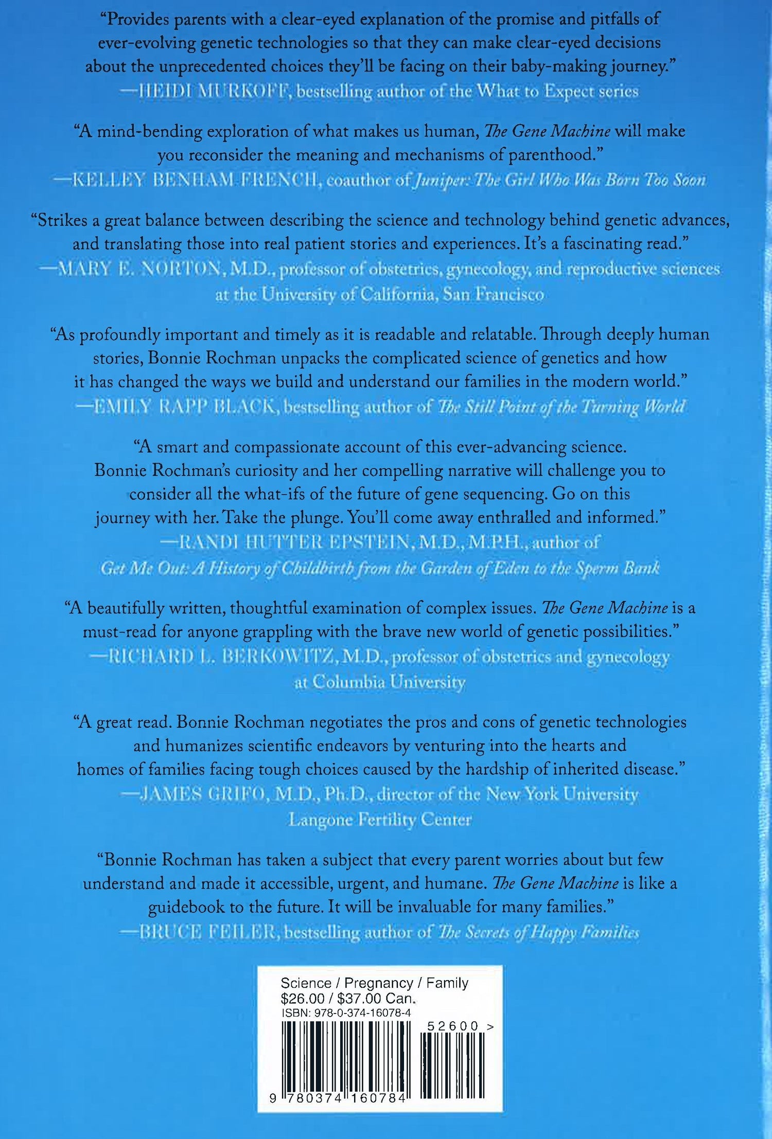 A sharp-eyed exploration of the promise and peril of having children in an age of genetic tests and interventions Is screening for disease in an embryo a humane form of family planning or a slippery slope toward eugenics? Should doctors tell you that your infant daughter is genetically predisposed to breast cancer? If tests revealed that your toddler has a genetic mutation whose significance isn't clear, would you want to know? In The Gene Machine, the award-winning journalist Bonnie Rochman deftly explores these hot-button questions, guiding us through the new frontier of gene technology and how it is transforming medicine, bioethics, health care, and the factors that shape a family. Rochman tells the stories of scientists working to unlock the secrets of the human genome; genetic counselors and spiritual advisers guiding mothers and fathers through life-changing choices; and, of course, parents (including Rochman herself) grappling with revelations that are sometimes joyous, sometimes heartbreaking, but always profound. She navigates the dizzying and constantly expanding array of prenatal and postnatal tests, from carrier screening to genome sequencing, while considering how access to more tests is altering perceptions of disability and changing the conversation about what sort of life is worth living and who draws the line. Along the way, she highlights the most urgent ethical quandary: Is this technology a triumph of modern medicine or a Pandora's box of possibilities? Propelled by human narratives and meticulously reported, The Gene Machine is both a scientific road map and a meditation on our power to shape the future. It is a book that gets to the very core of what it means to be human.