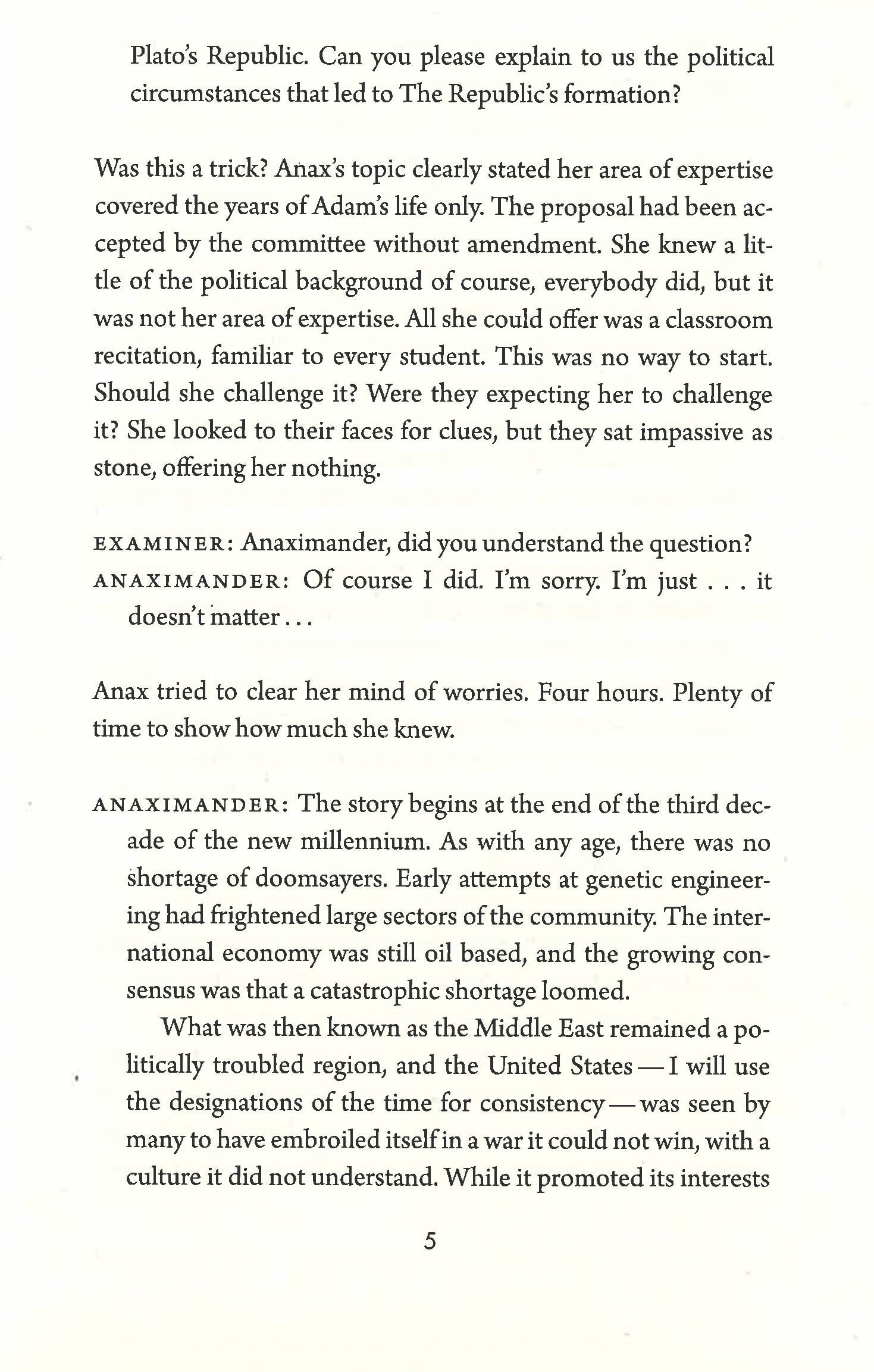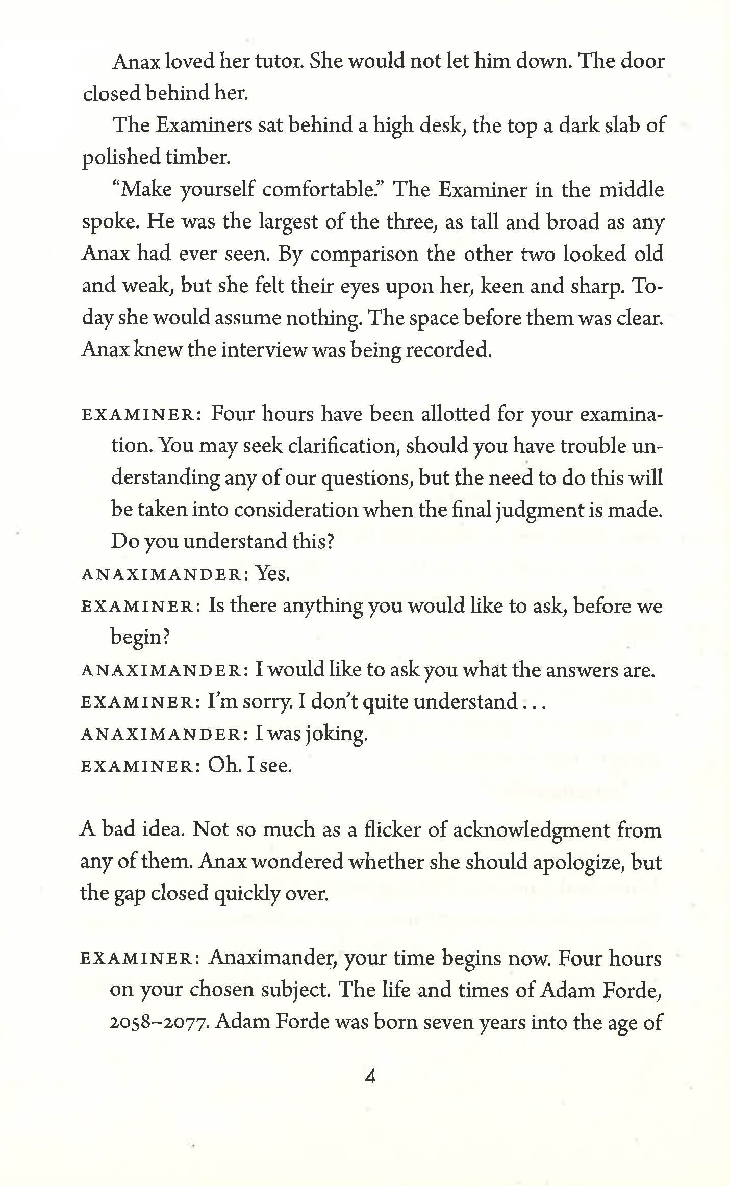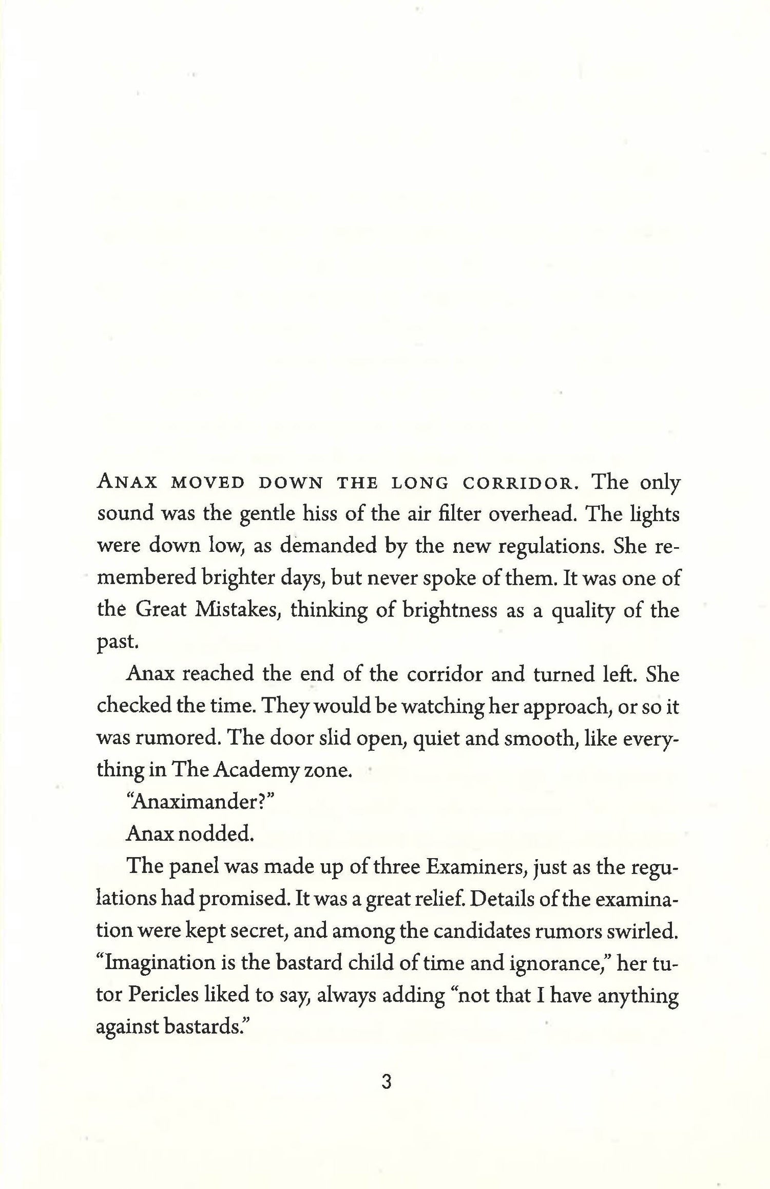 Anax thinks she knows history. Her grueling all-day Examination has just begun, and if she passes, she'll be admitted into the Academy--the elite governing institution of her utopian society. But Anax is about to discover that for all her learning, the history she's been taught isn't the whole story. And the Academy isn't what she believes it to be. In this brilliant novel of dazzling ingenuity, Anax's examination leads us into a future where we are confronted with unresolved questions raised by science and philosophy. Centuries old, these questions have gained new urgency in the face of rapidly developing technology. What is consciousness? What makes us human? If artificial intelligence were developed to a high enough capability, what special status could humanity still claim? Outstanding and original, Beckett's dramatic narrative comes to a shocking conclusion.