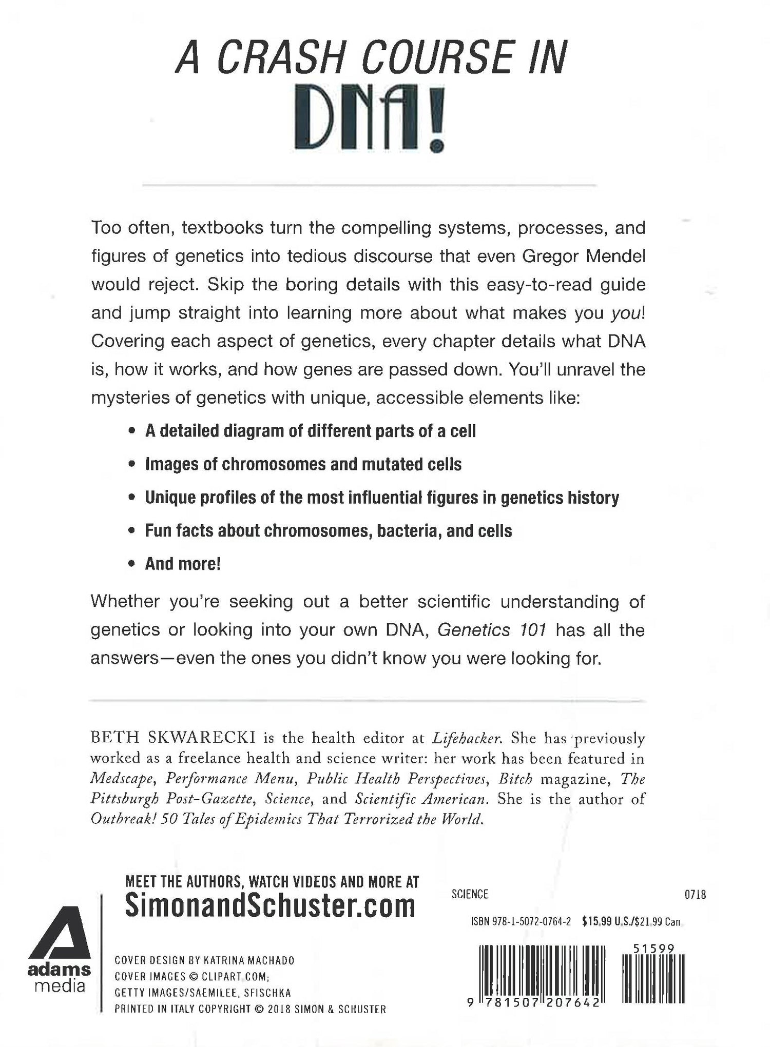 A clear and straightforward explanation of genetics in this new edition of the popular 101 series. Our genetic makeup determines so much about who we are, and what we pass on to our children—from eye color, to height, to health, and even our longevity. Genetics 101 breaks down the science of how genes are inherited and passed from parents to offspring, what DNA is and how it works, how your DNA affects your health, and how you can use your personal genomics to find out more about who you are and where you come from. Whether you’re looking for a better scientific understanding of genetics, or looking into your own DNA, Genetics 101 is your go-to source to discover more about both yourself and your ancestry.
