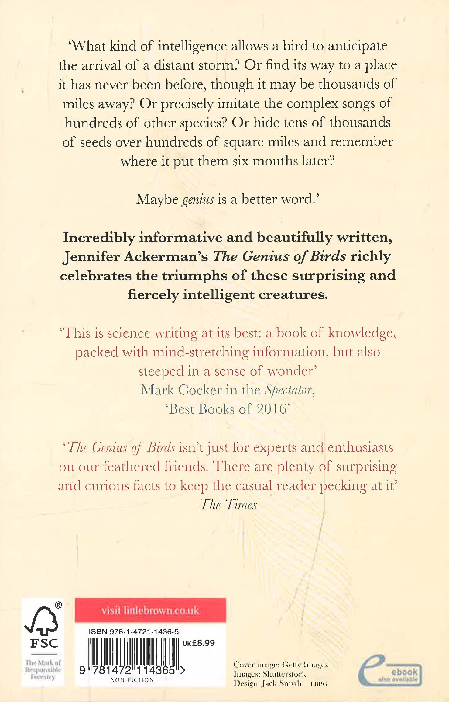 In The Genius of Birds, acclaimed author Jennifer Ackerman explores the newly discovered brilliance of birds and how it came about. As she travels around the world to the most cutting-edge frontiers of research - the distant laboratories of Barbados and New Caledonia, the great tit communities of the United Kingdom and the bowerbird habitats of Australia, the ravaged mid-Atlantic coast after Hurricane Sandy and the warming mountains of central Virginia and the western states - Ackerman not only tells the story of the recently uncovered genius of birds but also delves deeply into the latest findings about the bird brain itself that are revolutionizing our view of what it means to be intelligent.