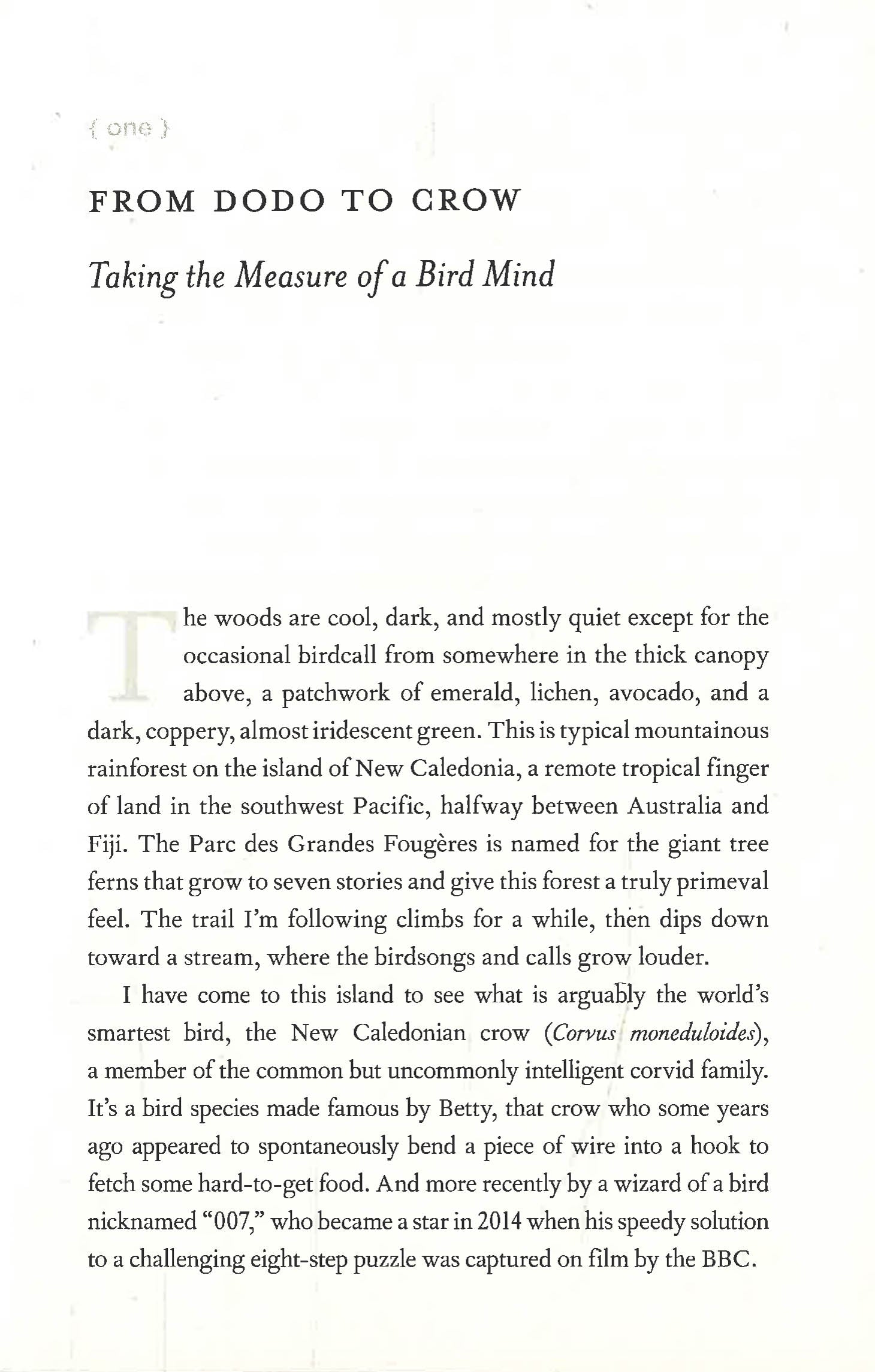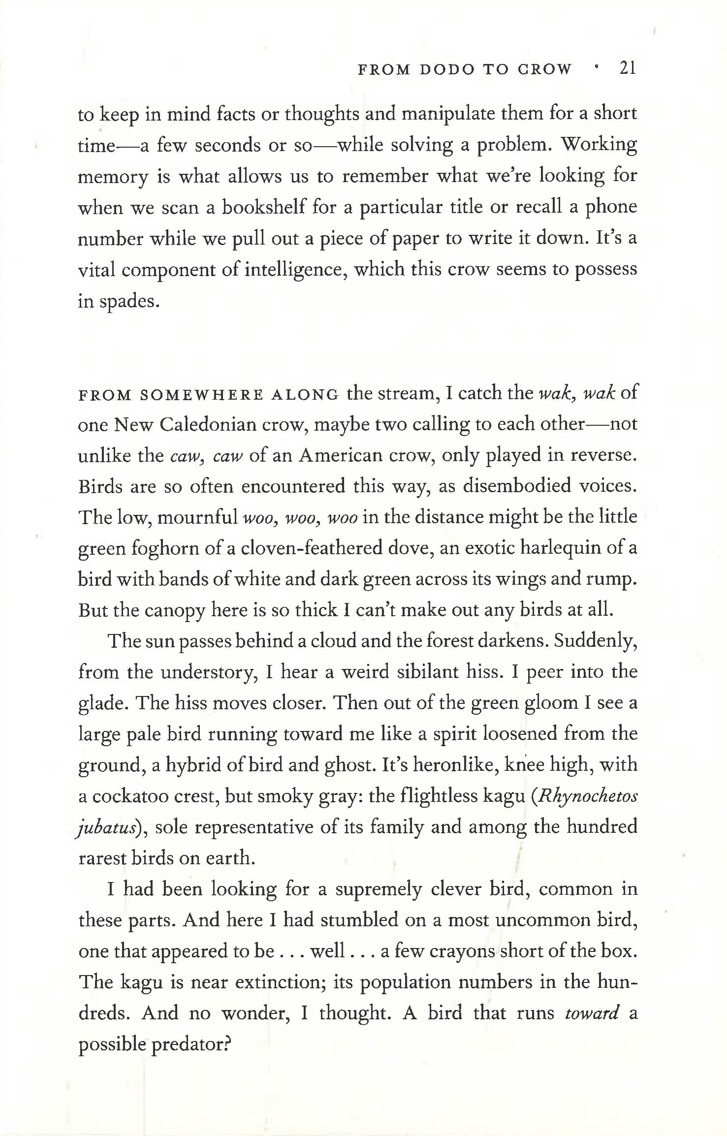 Consider, as Ackerman does, the Clark's nutcracker, a bird that can hide as many as 30,000 seeds over dozens of square miles and remember where it put them several months later; the mockingbirds and thrashers, species that can store 200 to 2,000 different songs in a brain a thousand times smaller than ours; the well-known pigeon, which knows where it's going, even thousands of miles from familiar territory; and the New Caledonian crow, an impressive bird that makes its own tools.
