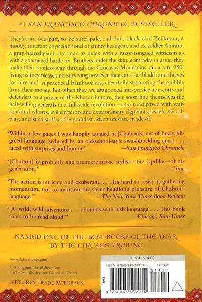 Michael Chabon's Pulitzer Prize-winning bestseller, The Amazing Adventures of Kavalier & Clay, sprang from an early passion for the derring-do and larger-than-life heroes of classic comic books. Now, once more mining the rich past, Chabon summons the rollicking spirit of legendary adventures-from The Arabian Nights to Alexandre Dumas to Fritz Leiber's Fafhrd and the Gray Mouser stories-in a wonderful new novel brimming with breathless action, raucous humor, cliff-hanging suspense, and a cast of colorful characters worthy of Scheherazade's most tantalizing tales. They're an odd pair, to be sure: pale, rail-thin, black-clad Zelikman, a moody, itinerant physician fond of jaunty headgear, and ex-soldier Amram, a gray-haired giant of a man as quick with a razor-tongued witticism as he is with a sharpened battle-ax. Brothers under the skin, comrades in arms, they make their rootless way through the Caucasus Mountains, circa A.D. 950, living as they please and surviving however they can-as blades and thieves for hire and as practiced bamboozlers, cheerfully separating the gullible from their money. No strangers to tight scrapes and close shaves, they've left many a fist shaking in their dust, tasted their share of enemy steel, and made good any number of hasty exits under hostile circumstances. None of which has necessarily prepared them to be dragooned into service as escorts and defenders to a prince of the Khazar Empire. Usurped by his brutal uncle, the callow and decidedly ill-tempered young royal burns to reclaim his rightful throne. But doing so will demand wicked cunning, outrageous daring, and foolhardy bravado . . . not to mention an army. Zelikman and Amram can at least supply the former. But are these gentlemen of the road prepared to become generals in a full-scale revolution? The only certainty is that getting there-along a path paved with warriors and whores, evil emperors and extraordinary elephants, secrets, swordplay, and such stuff as the grandest adventures are made of-will be much more than half the fun. From the Hardcover edition.