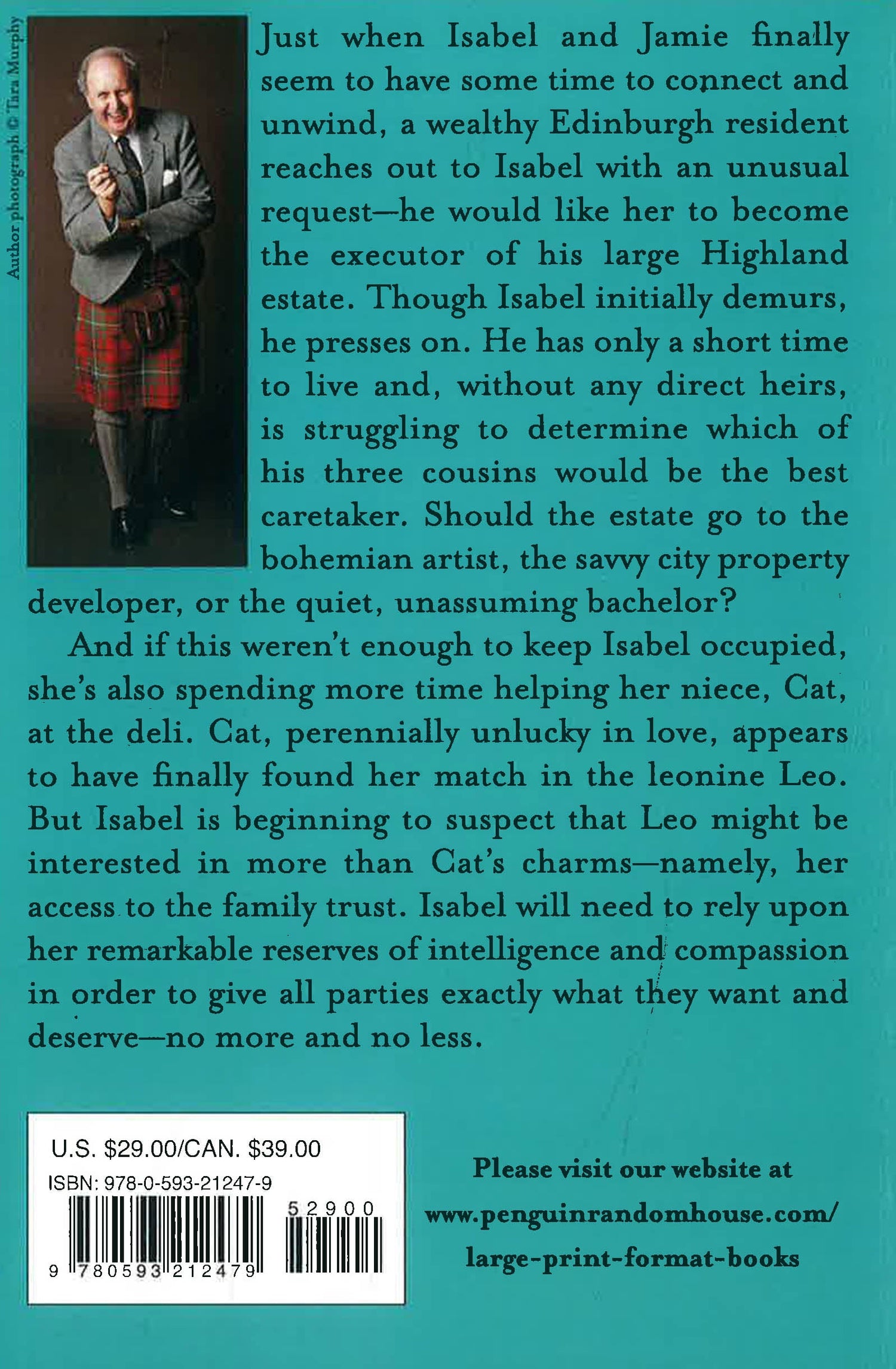 Just when Isabel and Jamie finally seem to have some time to connect and unwind, a wealthy Edinburgh resident reaches out to Isabel with an unusual request&;he would like her to become the executor of his large Highland estate. Though Isabel initially demurs, he presses on. He has only a short time to live, and, without any direct heirs, is struggling to determine which of his three cousins would be the best caretaker. Should it go to the bohemian artist, the savvy city property developer, or the quiet, unassuming bachelor?