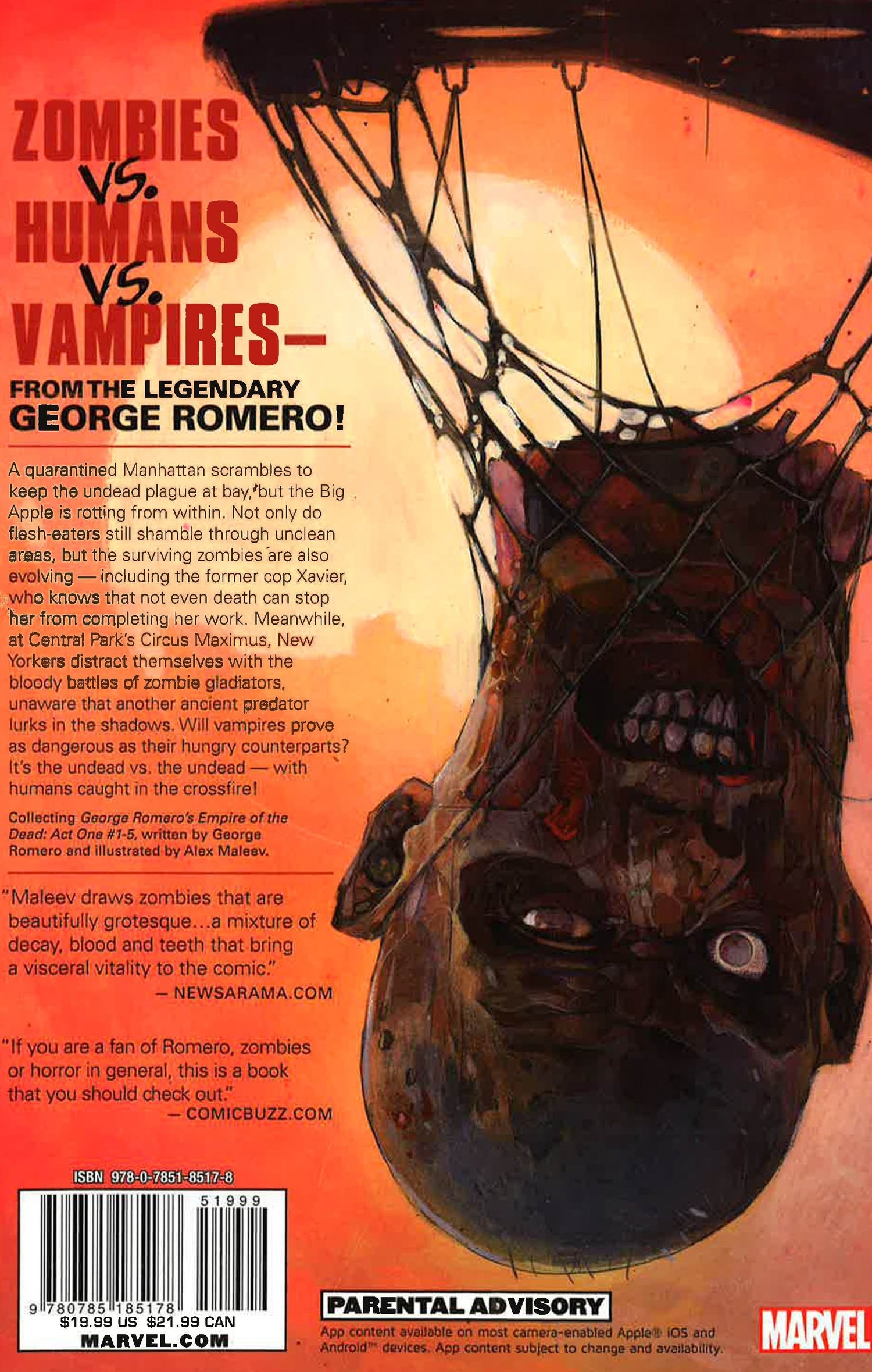Zombie godfather George Romero unleashes his next undead epic - as an all-new Marvel comic! Welcome to New York City years after the undead plague has erupted...but just because Manhattan has been quarantined, don't think that everyone inside is safe! Not only do flesh-eaters roam Manhattan, but there's another ancient predator that has taken a bloody bite out of the Big Apple: vampires rule the city! But who is plotting against the Mayor? Is there a zombie uprising afoot? Who is the firecracker known as Dixie Peach? And in the pit of the bloody Circus Maximus, can anything stop the unchained fury of the zombie gladiator known as Zanzibar? It's zombies vs. vampires - with humans caught in the crossfire! COLLECTING: George Romero's Empire Of Th e Dead: Act One 1-5