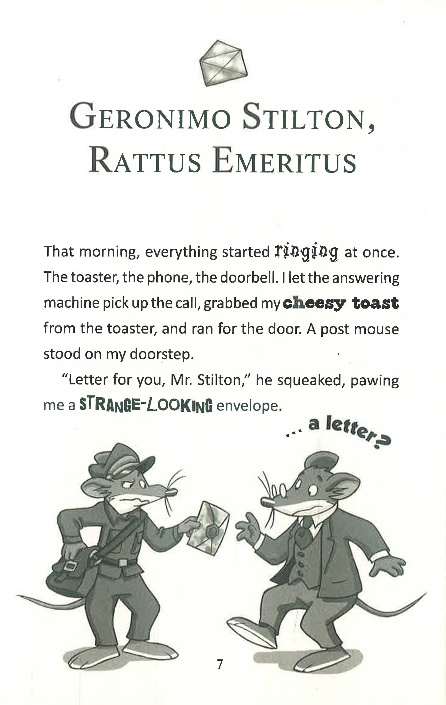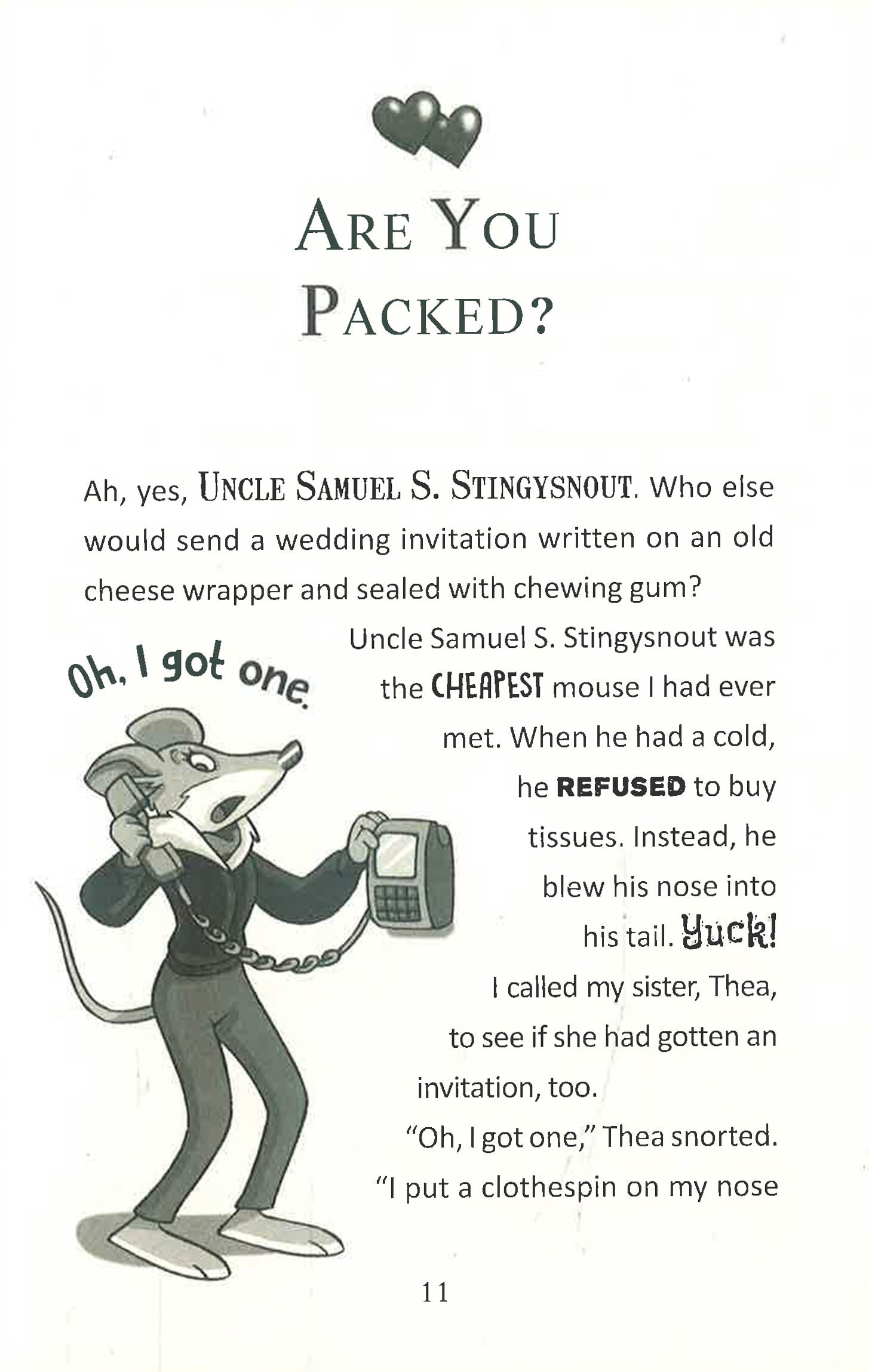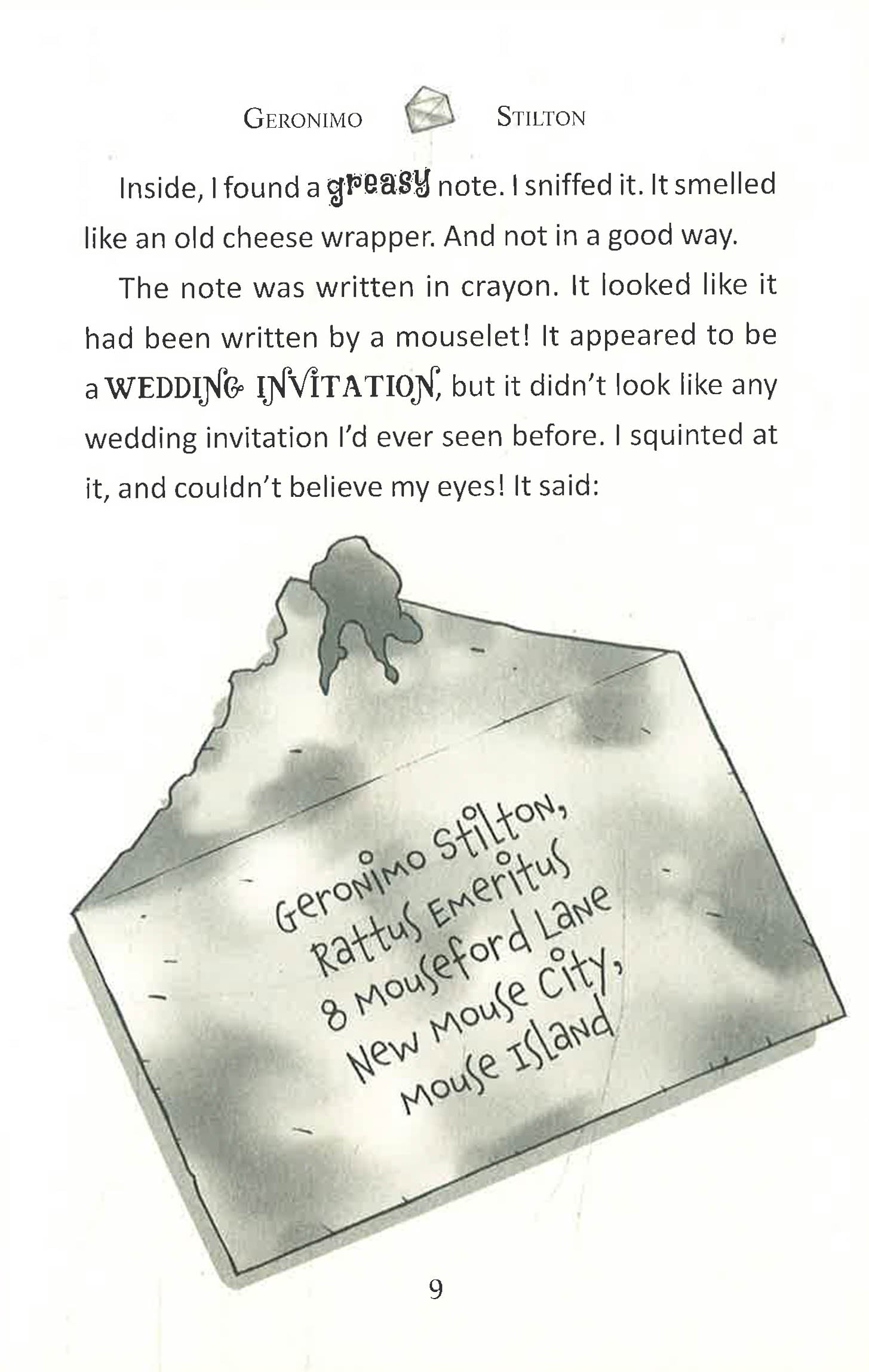 The Stiltons are off to Penny Pincher Castle for a fabumouse wedding! Cousin Stevie Stingysnout is marrying Patience Plainpaws. But when they arrive there’s no wedding reception, no refreshments – and the bride is very unhappy. What secrets are hiding in Penny Pincher Castle? It’s up to Geronimo to find out!