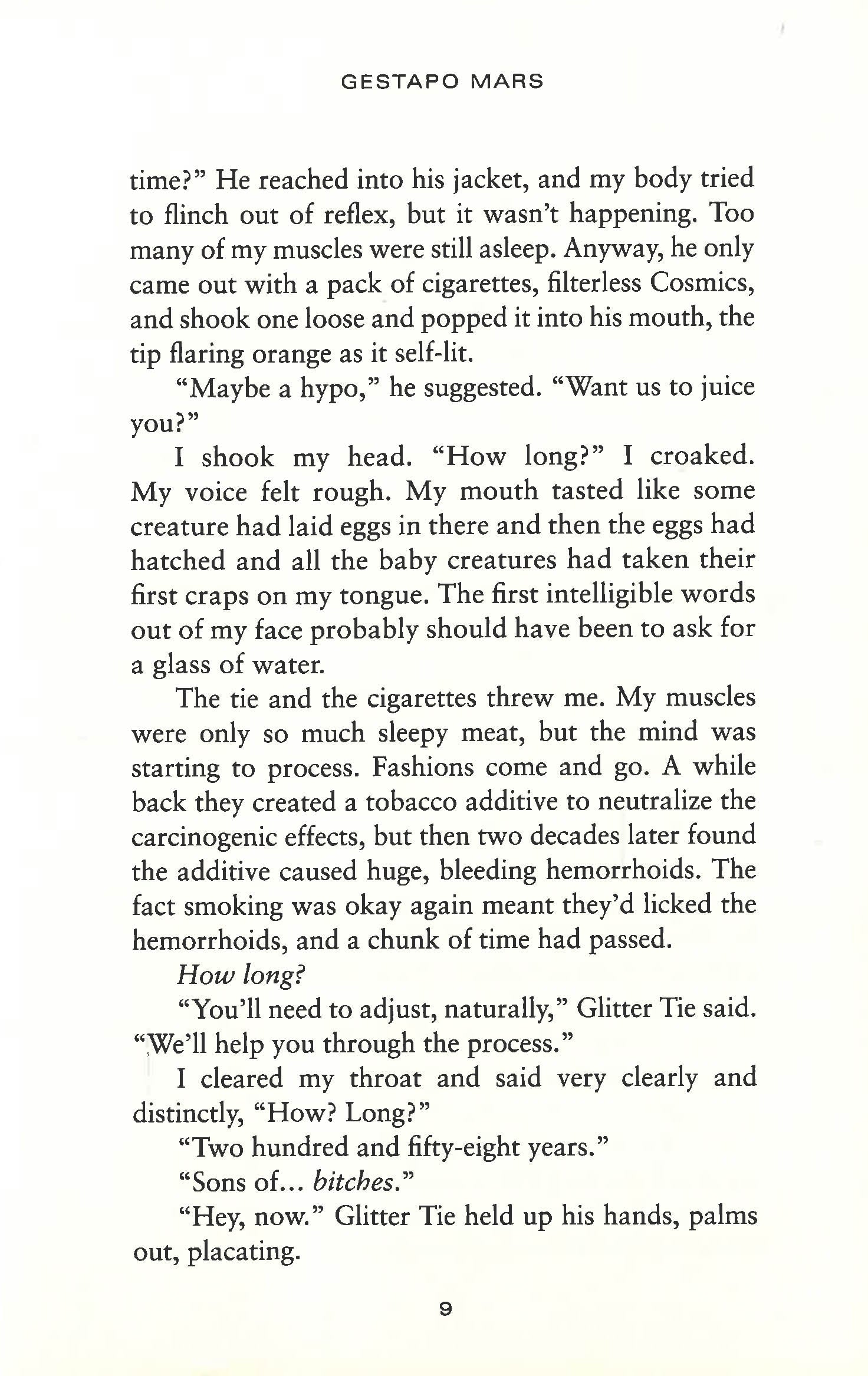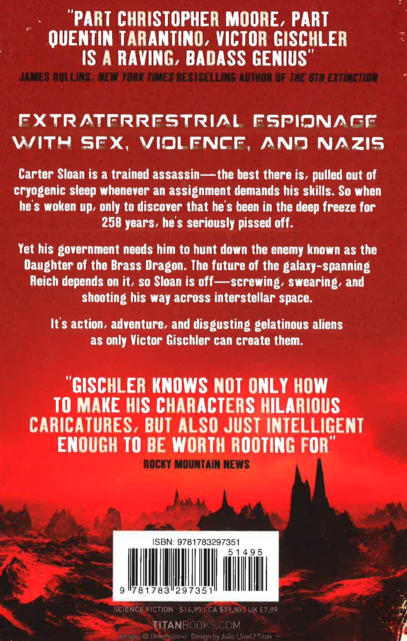 Carter Sloan is a trained assassin-the best there is, pulled out of cryogenic sleep whenever an assignment demands his skills. So when he's kept in the deep freeze for 258 years, he's seriously pissed off.Yet his government needs him, to hunt down the enemy known as the Daughter of the Brass Dragon. The future of the galaxy-spanning Reich depends on it, so Sloan is off-screwing, swearing, and shooting his way across interstellar space.lt's action, adventure, and disgusting gelatinous aliens as only Victor Gischler can create them.