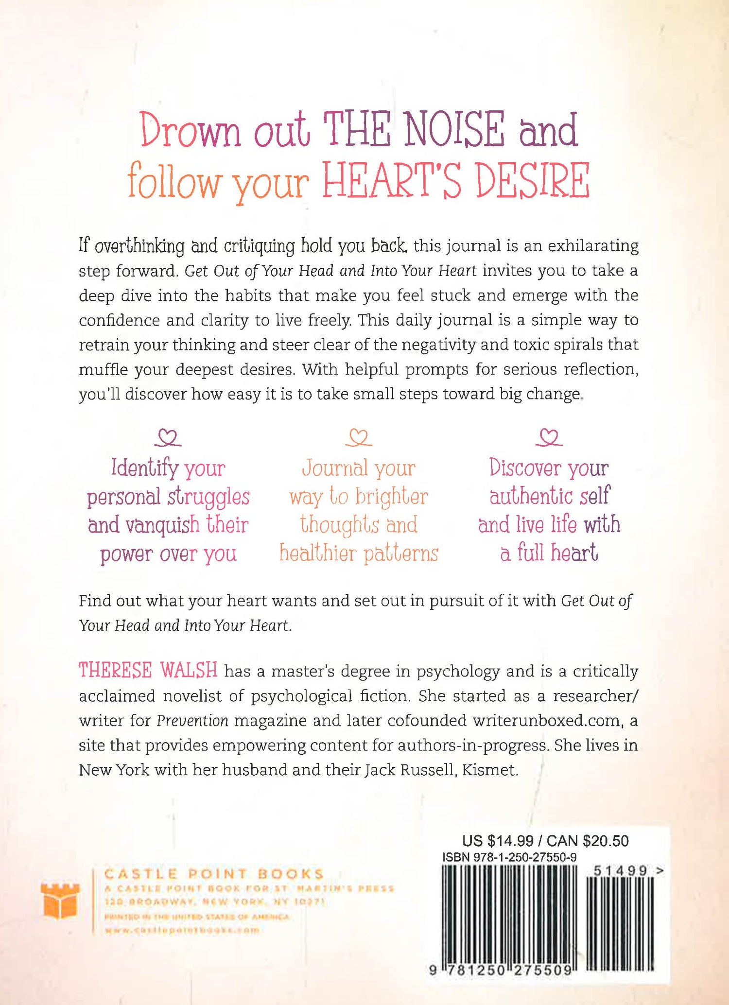 Therese Walsh's Get Out of Your Head and Into Your Heart invites you to take a deep dive into the habits that make you feel stuck and emerge with the confidence and clarity to live freely. This daily journal is a simple way to retrain your thinking and steer clear of the negativity and toxic spirals that muffle your deepest desires. With helpful prompts for serious reflection, you’ll discover how easy it is to take small steps toward big change.