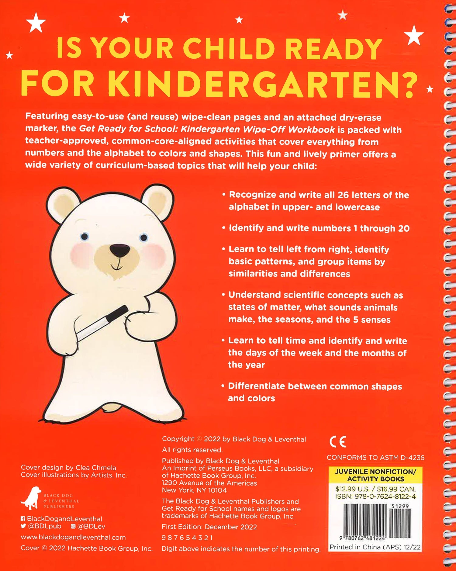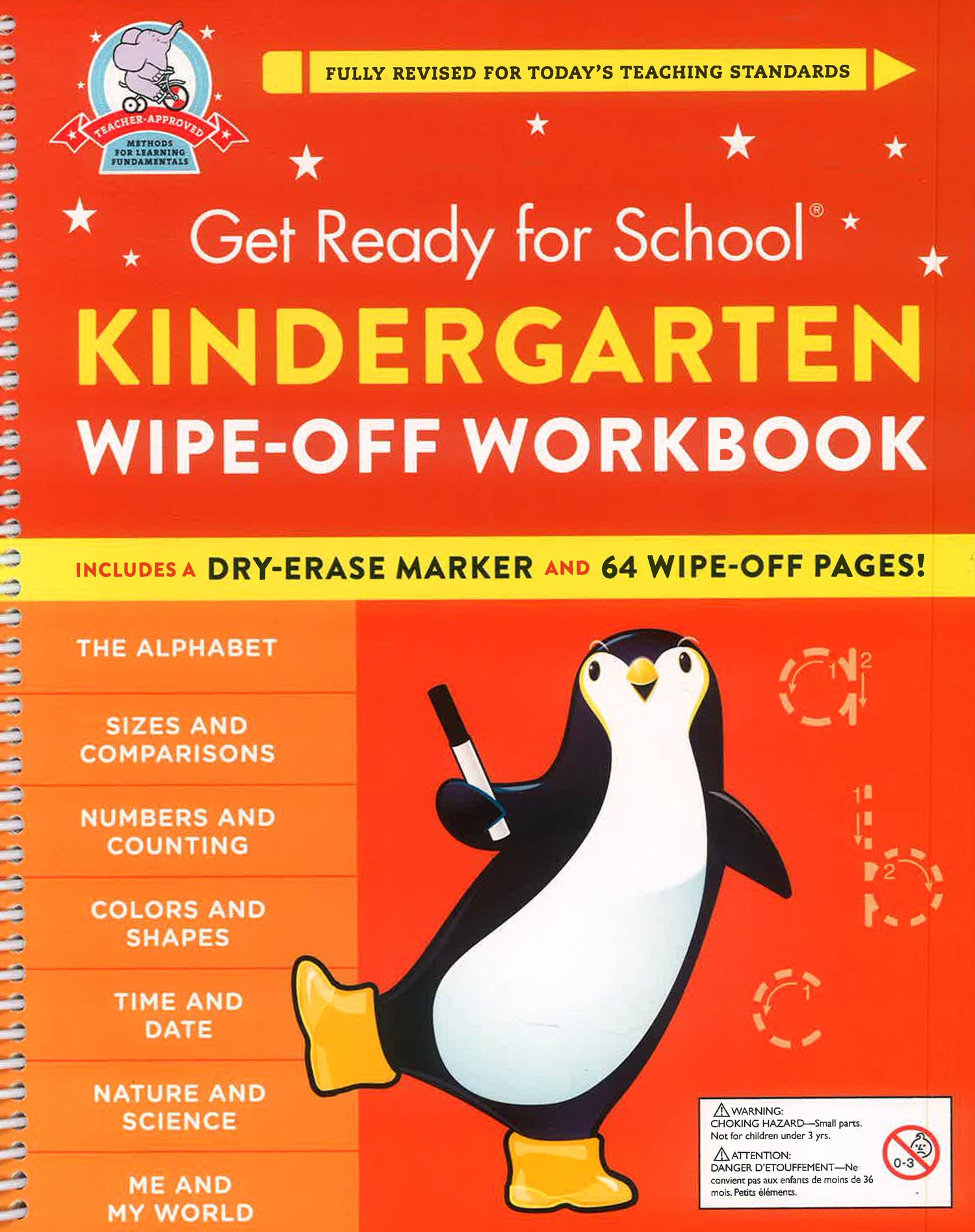 Featuring easy-to-use, wipe-clean pages and an attached dry-erase marker, the Get Ready for School: Kindergarten Wipe-Off Workbook is packed with teacher-approved, common-core aligned activities that cover everything from numbers and letters, to colors and shapes. Help the young student in your life prepare for school with this friendly, colorful, and re-useable activity book that introduces and reinforces basic skills through quizzes, tracing, fill-in-the blank prompts and more. Get Ready for School: Kindergarten Wipe-Off Workbook offers a wide variety of curriculum-based topics that will help your child: ·Recognize and write all 26 letters of the alphabet in upper- and lowercase ·Identify and write numbers 1 through 20 ·Learn to tell their left from their right, and to differentiate between up and down, and things that are similar and different ·Understand scientific concepts such as where animals live and what they eat, states of matter, and the five senses ·Learn to tell time and to identify and write the days of the week and the months of the year ·Differentiate between common shapes and colorsTime-tested and teacher-approved, Get Ready for School: Kindergarten Wipe-Off Workbook will help your child develop a love for learning while enhancing their essential motor and problem-solving skills. Colorful workbook pages combine a sense of fun with a feeling of accomplishment, and parents will love that this spiral-bound workbook reflects current academic standards and aligns with the Common Core.Whether it's used during summer break, for extra practice during the school year, or for at home schooling, the Get Ready for School: Kindergarten Wipe-Off Workbook is the perfect study aid for every young learner.