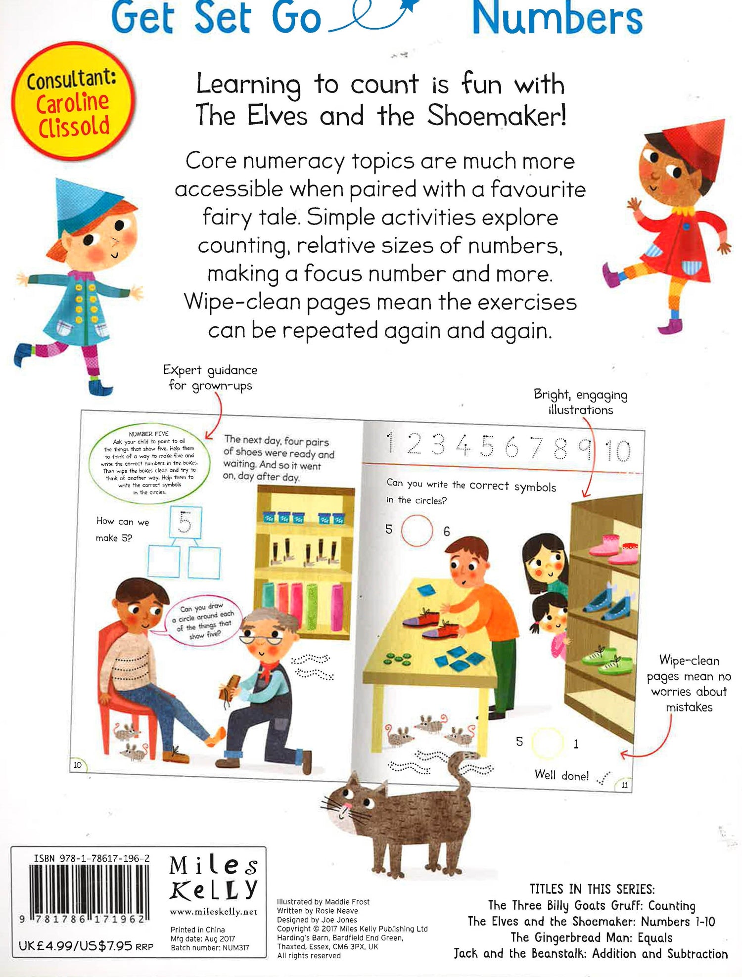 Get Set Go Numbers: The Elves and the Shoemaker Numbers 1 10 explores numbers in a much more fun way by pairing with a favourite fairy tale. Simple instructions for adults accompany the carefully retold story and enjoyable activities, guiding readers through the learning process step by step. The pages are wipe clean so each exercise can be repeated again and again. The numeracy content is planned by primary teacher and mathematics consultant Caroline Clissold, with the aim of increasing children's enjoyment in mathematics and helping them to see a purpose in their learning.