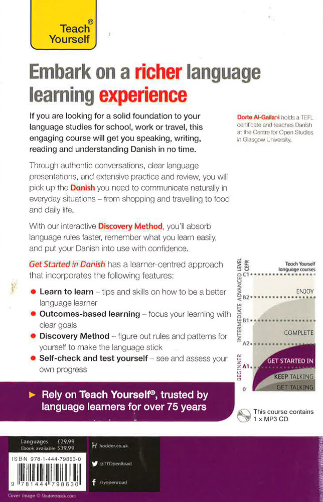Get Started reading, writing, speaking and listening in Danish. Ideal for complete beginners, this course comprises a book and audio support which is easy to download to your computer or MP3 player. Do you want a solid foundation to your Danish studies?If you are looking for a solid foundation to your language studies for school, work or travel, this engaging course will get you speaking, writing, reading and understanding Danish in no time. Through authentic conversations, clear language presentations, and extensive practice and review, you will learn the Danish you need to communicate naturally in everyday situations - from booking a hotel room to talking about friends and family.What will I learn?Basic Danish is slowly and carefully introduced to ensure you progress confidently through the course and build up a foundation to allow you to feel confident in everyday situations and move to the next level of your learning. It teaches grammar, vocabulary and listening, reading, writing, speaking and pronunciation skills. By the end of the course you will reach a solid Novice High proficiency level of ACTFL (The American Council for the Teaching of Foreign Languages) and A2 Beginner level of the CEFR (Common European Framework of Reference for Languages) guidelines. Is this course for me?Get Started in Danish is for absolute and false beginners of Danish. Clear and simple explanations make the course appropriate and accessible to anyone learning Danish. There are extensive illustrations to support the learner working on his or her own. This course is also ideal to use with one-to-one tutoring and as a classroom course.What do I get? This book has a learner-centred approach that incorporates the following features:- 10 units of learning content - covering everyday topics from booking a hotel room to talking about friends and family- Discovery Method - figure out rules and patterns yourself to make the language stick- Outcomes-based learning - focus your studies with clear aims- Vocabulary building - thematic lists and activities to help you learn vocabulary quickly- Test yourself - see and track your own progress- Native speaker audio - available as a digital download- Free, downloadable audio transcripts and vocabulary and language reference listsThis pack includes a book and one MP3 CD of audio material.Where do I go next?If you want to advance your Danish, our Complete Danish course (9781444194982) will take you to an intermediate level of Danish.Rely on Teach Yourself, trusted by language learners for over 75 years