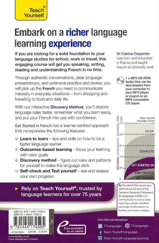 Get started reading, speaking and listening in French. Ideal for complete beginners, this course comprises a book and audio support which is easy to download to your computer or MP3 player. Do you want a solid foundation to your French studies?If you are looking for a solid foundation to your language studies for school, work or travel, this engaging course will get you speaking, writing, reading and understanding French in no time. Through authentic conversations, clear language presentations, and extensive practice and review, you will learn the French you need to communicate naturally in everyday situations - from booking a hotel room to talking about friends and family.What will I learn?Basic French is slowly and carefully introduced to ensure you progress confidently through the course and build up a foundation to allow you to feel confident in everyday situations and move to the next level of your learning. It teaches grammar, vocabulary and listening, reading, writing, speaking and pronunciation skills. By the end of the course you will reach a solid Novice High proficiency level of ACTFL (The American Council for the Teaching of Foreign Languages) and A2 Beginner level of the CEFR (Common European Framework of Reference for Languages) guidelines. Is this course for me?Get Started in French is for absolute and false beginners of French. Clear and simple explanations make the course appropriate and accessible to anyone learning French. There are extensive illustrations to support the learner working on his or her own. This course is also ideal to use with one-to-one tutoring and as a classroom course.What do I get? This book has a learner-centred approach that incorporates the following features:- 10 units of learning content - covering everyday topics from booking a hotel room to talking about friends and family- Discovery Method - figure out rules and patterns yourself to make the language stick- Outcomes-based learning - focus your studies with clear aims- Vocabulary building - thematic lists and activities to help you learn vocabulary quickly- Test yourself - see and track your own progress- Native speaker audio - available as a digital download- Free, downloadable audio transcripts and vocabulary and language reference listsThis pack includes a book and one MP3 CD of audio material.Where do I go next?If you want to advance your French, our Complete French course (9781444177299) will take you to an intermediate level of French. If you want to practice your speaking and listening skills, Get Talking and Keep Talking French (9781444184143) is the perfect audio course. Rely on Teach Yourself, trusted by language learners for over 75 years
