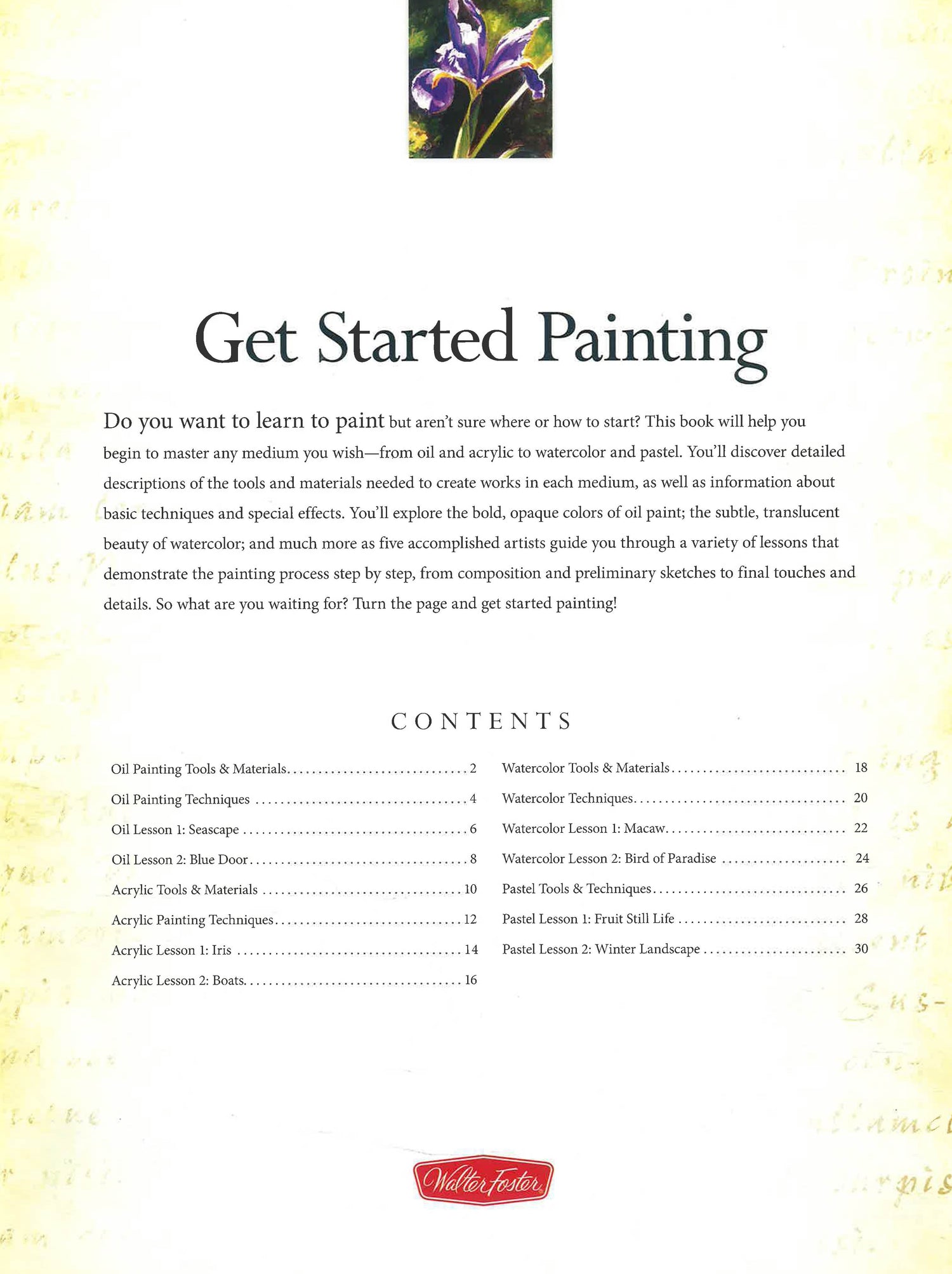 Learn how to paint in four different media! Taking the first steps to learn how to paint can be a challenge, especially when beginning artists are unsure which medium best suits them. With this book, aspiring artists will discover the qualities and benefits of four painting media-acrylic, oil, pastel, and watercolor-making it easier for them to begin their artistic journey. After an in-depth introduction to the tools and materials needed for each medium, five accomplished artists guide readers step by step through the creation of their own works of art.