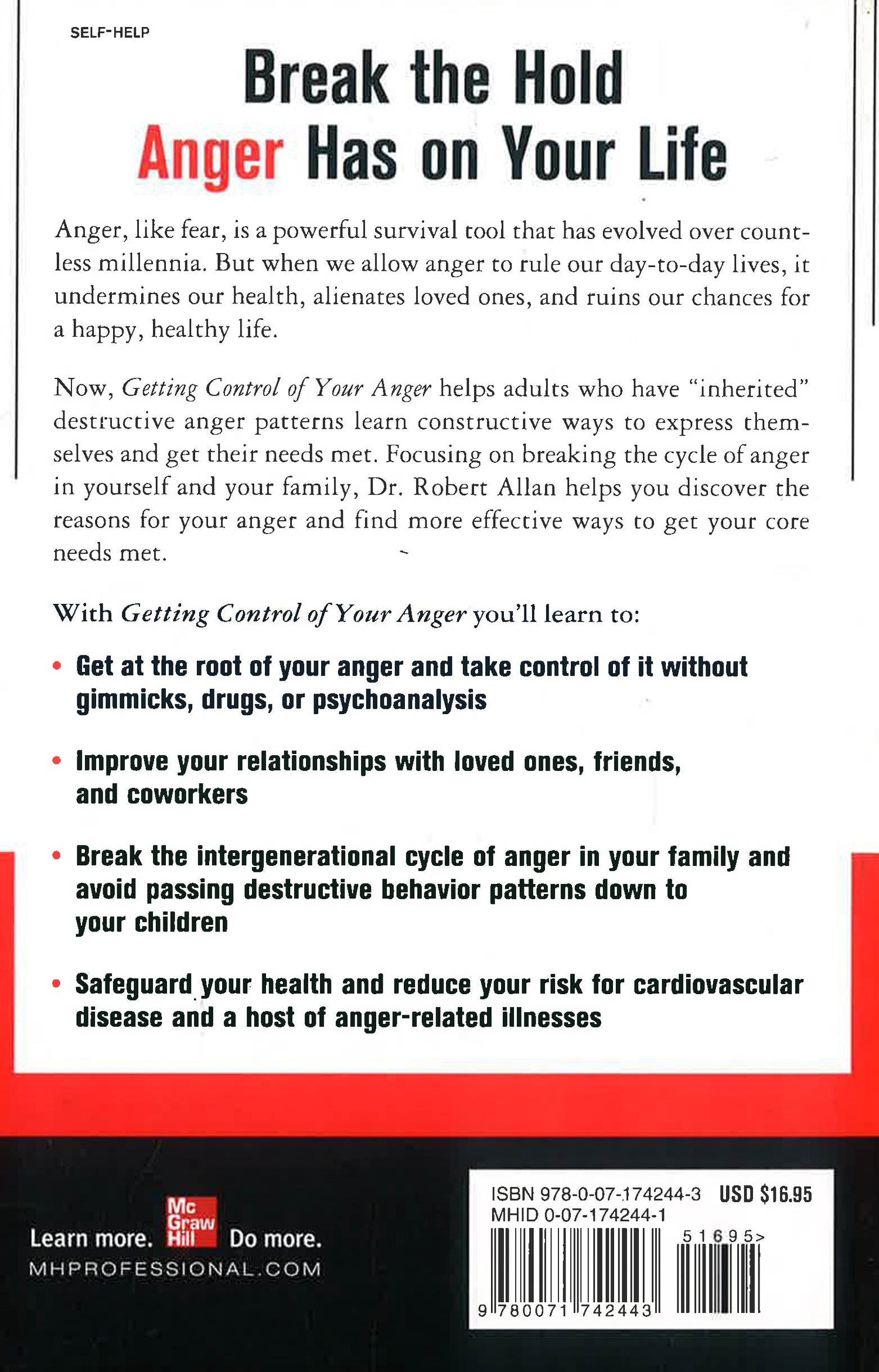 Break the Hold Anger Has on Your LifeAnger, like fear, is a powerful survival tool that has evolved over countless millennia. But when we allow anger to rule our day-to-day lives, it undermines our health, alienates loved ones, and ruins our chances for a happy, healthy life.Now, Getting Control of Your Anger helps adults who have "inherited" destructive anger patterns learn constructive ways to express themselves and get their needs met. Focusing on breaking the cycle of anger in yourself and your family, Dr. Robert Allan helps you discover the reasons for your anger and find more effective ways to get your core needs met.With Getting Control of Your Anger you'll learn to:Get at the root of your anger and take control of it without gimmicks, drugs, or psychoanalysisImprove your relationships with loved ones, friends, and coworkersBreak the intergenerational cycle of anger in your family and avoid passing destructive behavior patterns down to your childrenSafeguard your health and reduce your risk for cardiovascular disease and a host of anger-related illnesses.