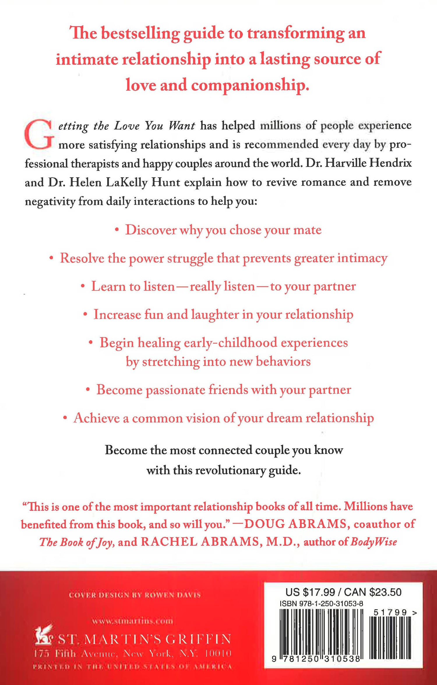 In Getting the Love You Want, Dr. Harville Hendrix and Dr. Helen Hunt offer the relationship skills that have helped millions of couples replace confrontation and criticism with a process of mutual support that facilitates healing and growth at any stage of a relationship. This extraordinary practical guide describes the revolutionary technique that combines a number of disciplines - including the behavioural sciences, depth psychology, social learning theory, Gestalt therapy, and interpersonal neurosciences, among others - to create a program that transforms conflict into creative tension that deepens connection and renews passion. In a new forward and chapter, Hendrix and Hunt offer a new perspective of what a relationship is and where we should focus our attention and energy. Reversing the assumption that prioritises the individual, the authors show how tending to the needs of the relationship first will ensure that the needs of the individual are met. By shifting our conversational methods away from negativity and towards affirmation, a safe and encouraging environment is built that reduces anxiety and allows couples to thrive. The chapter also includes practical exercises - proven invaluable in couple’s therapy - to achieve the goal of intimate partnership full of life, joy, and wonder.
