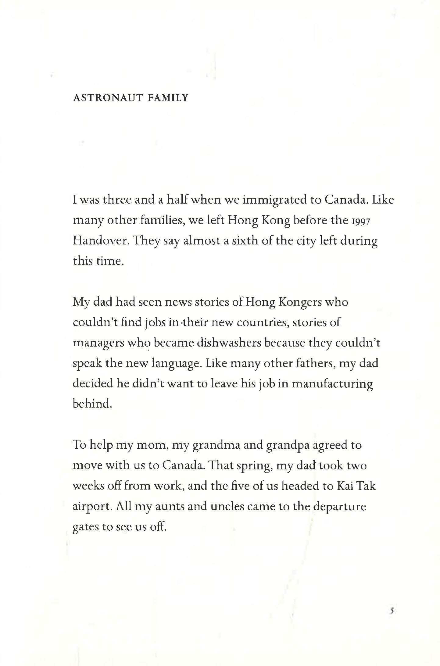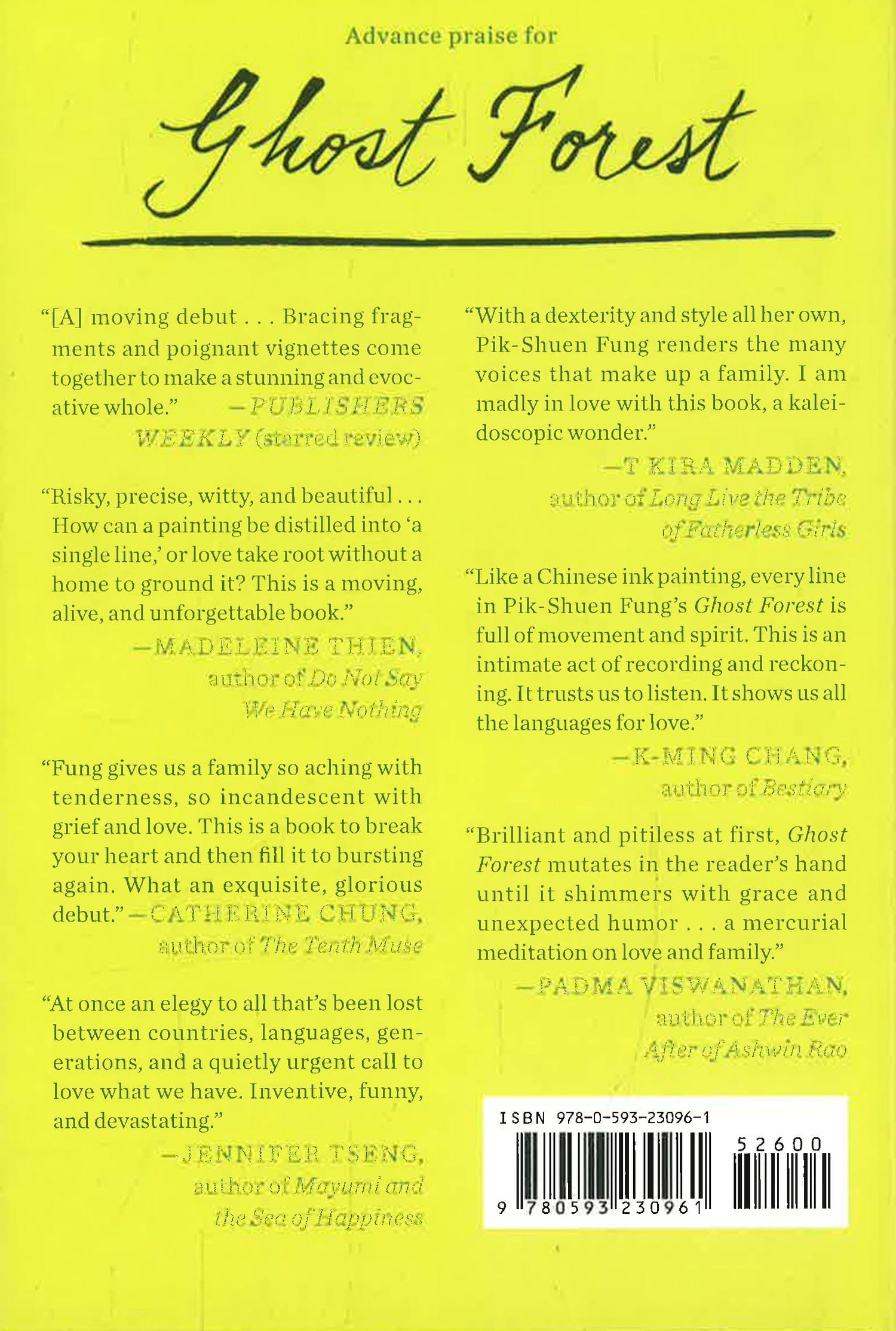 Buoyant and heartbreaking, Ghost Forest is a slim novel that envelops the reader in joy and sorrow. Fung writes with a poetic and haunting voice, layering detail and abstraction, weaving memory and oral history to paint a moving portrait of a Chinese-Canadian astronaut family.