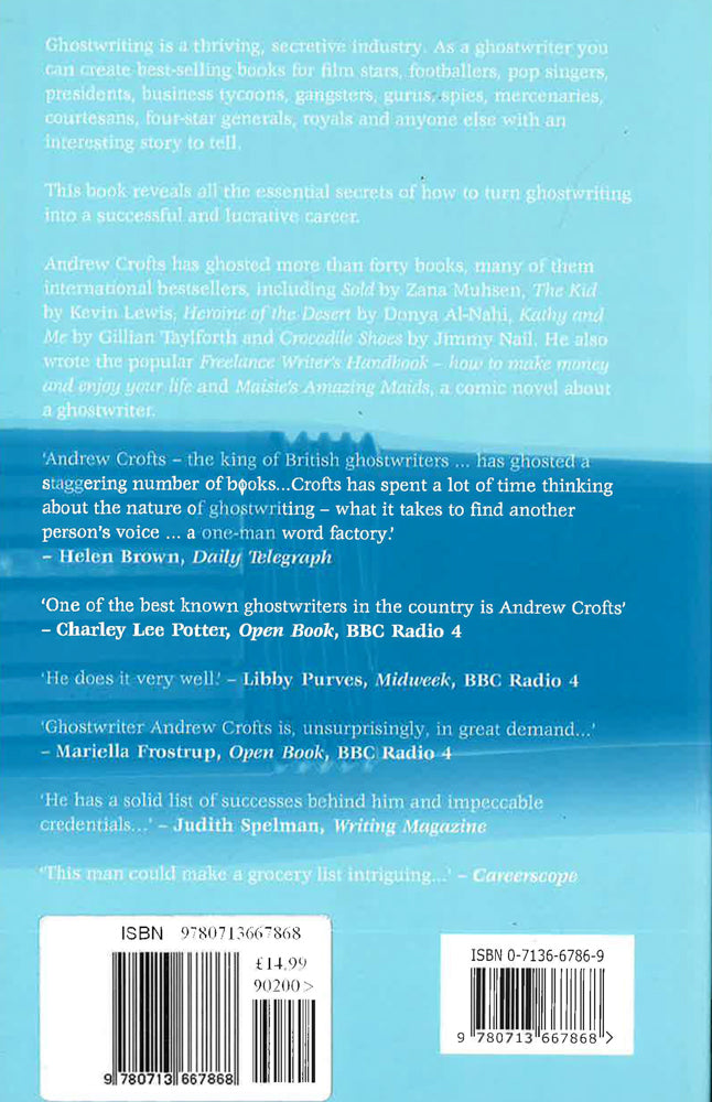 Ghostwriting is a thriving, secretive industry. As a ghostwriter you can create best-selling books for film stars, footballers, pop singers, presidents, business tycoons, gangsters, gurus, spies, mercenaries, courtesans, four-star generals, royals and anyone else with an interesting story to tell. This book reveals all the essential secrets of how to turn ghostwriting into a successful and lucrative career. Andrew Crofts has ghosted more than forty books, many of them international bestsellers, including Sold by Zana Muhsen (nearly 4 million copies sold), The Kid by Kevin Lewis, Heroine of the Desert by Donya Al-Nahi, Kathy and Me by Gillian Taylforth and Crocodile Shoes by Jimmy Nail.