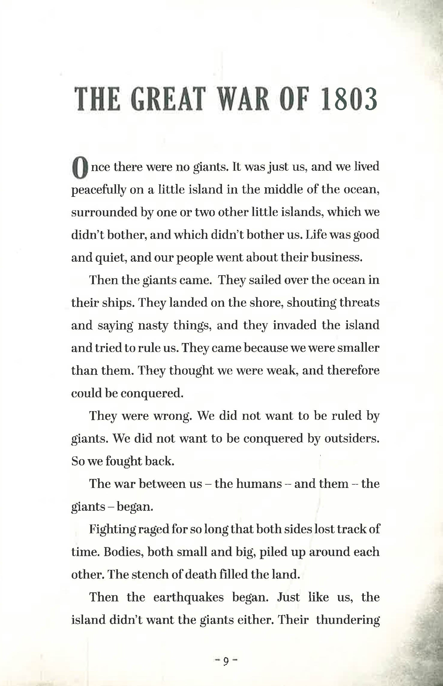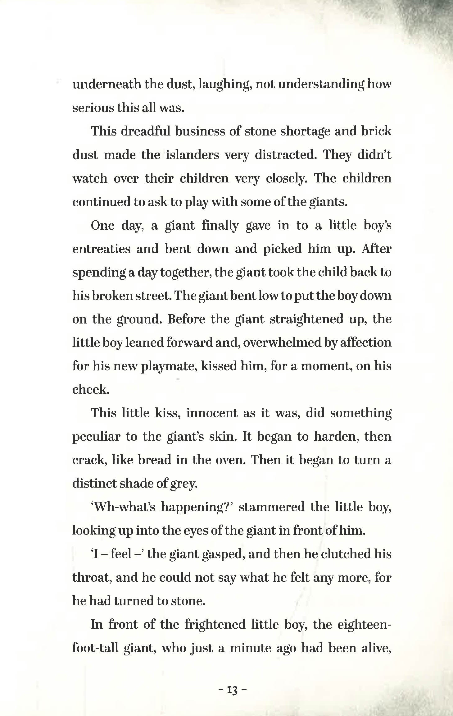 Luckily, the island’s inhabitants have found a way to fix their crumbling walls: giants. Giants look after human children, like eleven-year-old Minnie. When Minnie turns twelve, she’ll kiss her giant, turning her into a stone statue forever. The stone will be used to repair buildings. And there’s nothing wrong with that either . . . or so Minnie thinks.