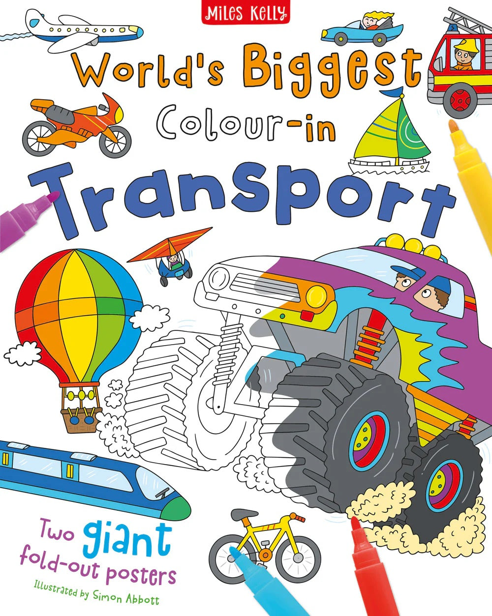 These two giant posters are packed full of vehicles and details to colour. Young children will be kept entertained for hours discovering a wide variety of transport, from planes and trains to tractors and diggers. Once completed, these giant posters can be hung on the wall to decorate and brighten any room.