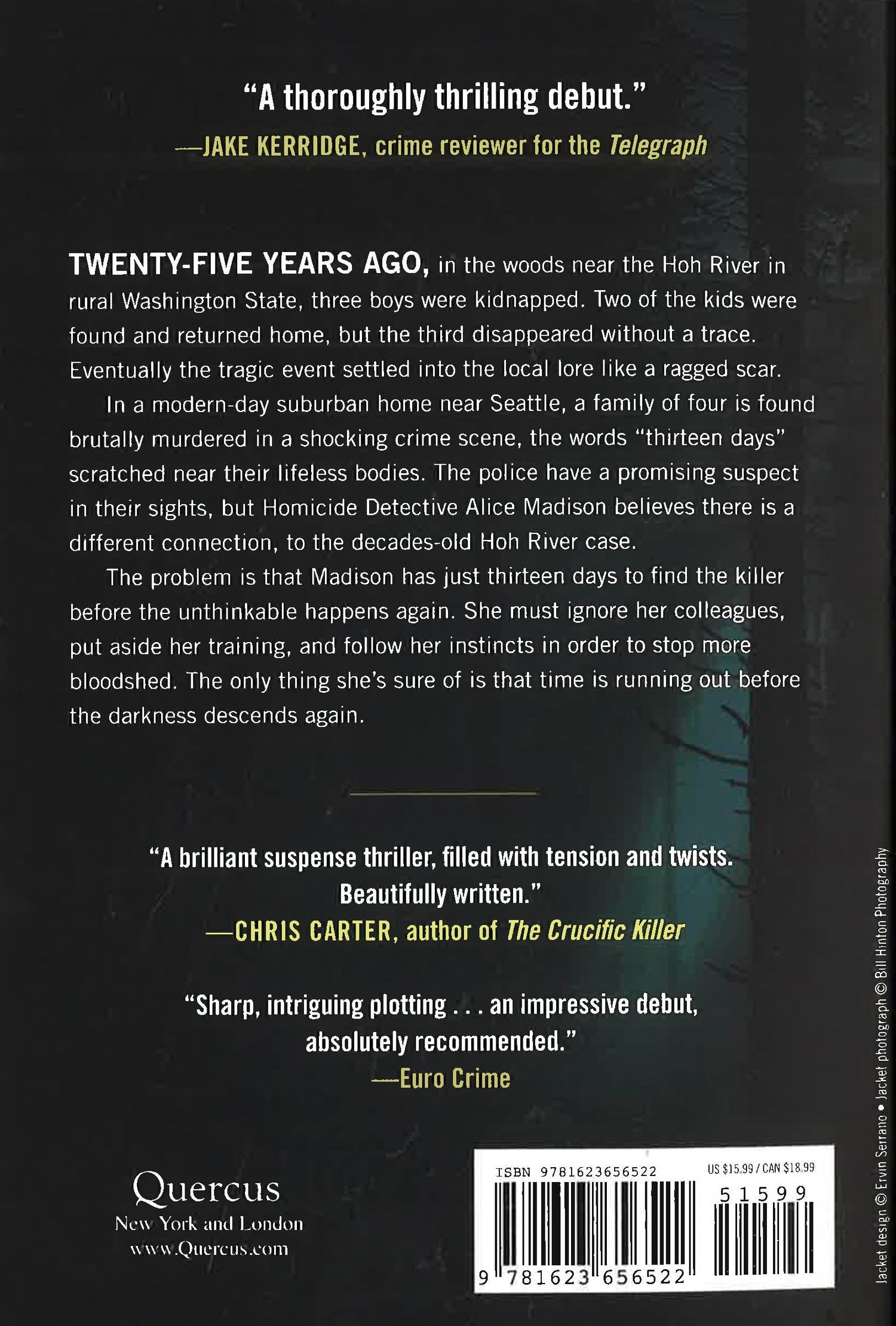 "Beautifully haunting prose, fascinating characters, interesting and surprising plotting, and I'm smitten with the Seattle/Olympic Peninsula setting." --Reader 5-Star Review "impossible to stop reading until the last page in each book" --Reader 5-Star Review "riveting race to the end"--Reader 5-Star Review Twenty-five years ago in the woods by the Hoh River near Seattle, three boys were kidnapped. One never came home. Last night, a family of four was found brutally murdered, the words 'thirteen days' carved near their lifeless bodies. Homicide Detective Alice Madison - a one-time child runaway with a murky past - now spends her life hunting down the very worst humanity has to offer. Madison has a hunch that the two murders are linked . . . and she has thirteen days to prove it. To stop a psychopath, Madison returns to the woods to confront the unsolved mystery of the Hoh River Boys. She must forget her training and follow her instincts to the terrifying end as enemies become allies and, in the silent forest, time is running out to save another life. Discover more Detective Alice Madison with the next installments of the gripping series --The Dark, Blood and Bone, and Sweet After Death.