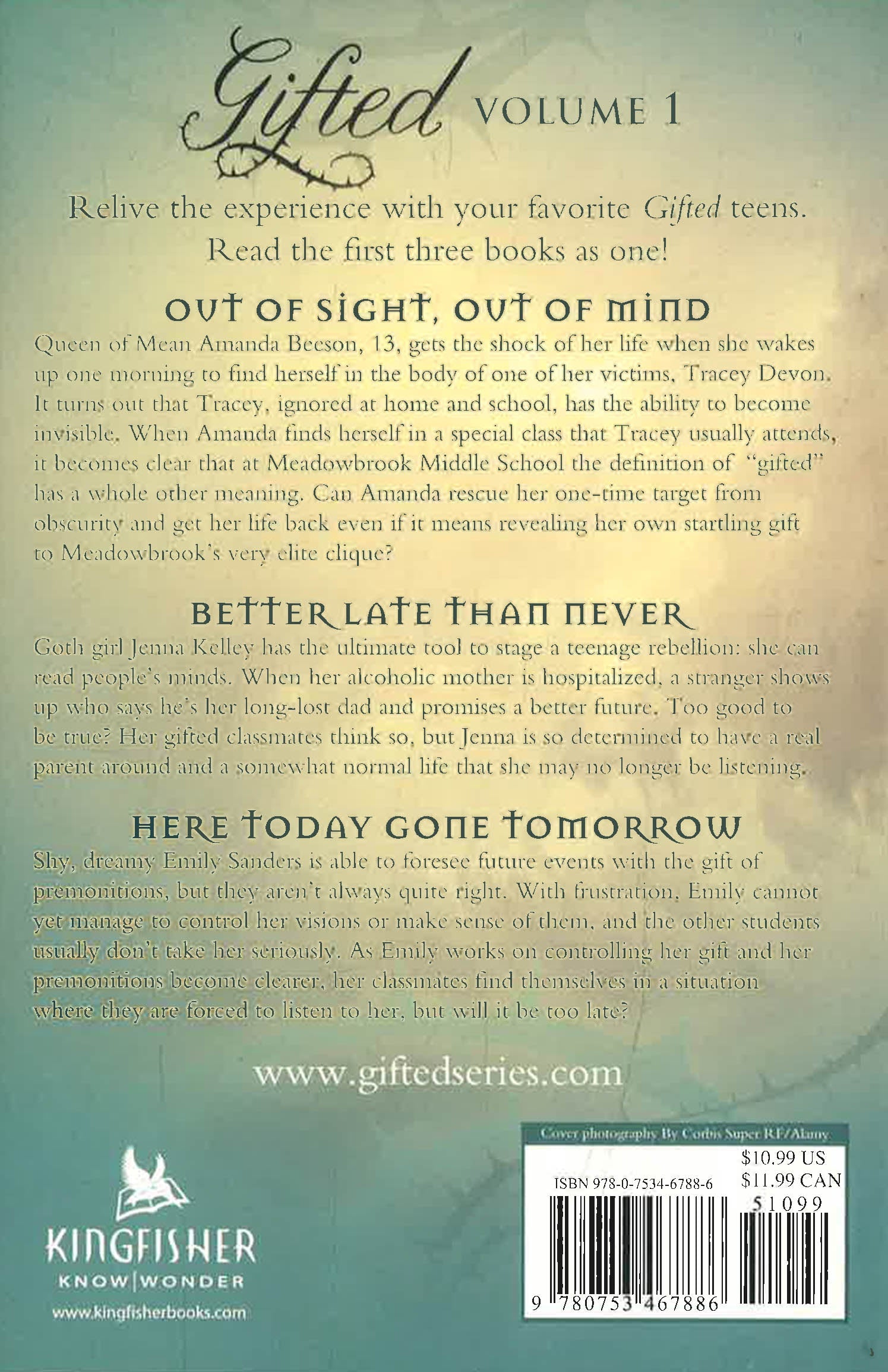 About the Series Meadowbrook Middle School is an ordinary school with ordinary students-except for the Nine. These students look like the others, but they're not. You could call it a skill, a talent or a disadvantage, but each of these students is unique - they're gifted. Out of Sight, Out of MindQueen of Mean Amanda Beeson, 13, gets the shock of her life when she wakes up one morning to find herself in the body of one of her victims, Tracey Devon. It turns out that Tracey, ignored at home and school, has the ability to become invisible. When Amanda finds herself in a special class that Tracey usually attends, it becomes clear that at Meadowbrook Middle School the definition of "gifted" has a whole other meaning. Can Amanda rescue her one-time target from obscurity and get her life back even if it means revealing her own startling gift to Meadowbrook's very secret clique? Better Late