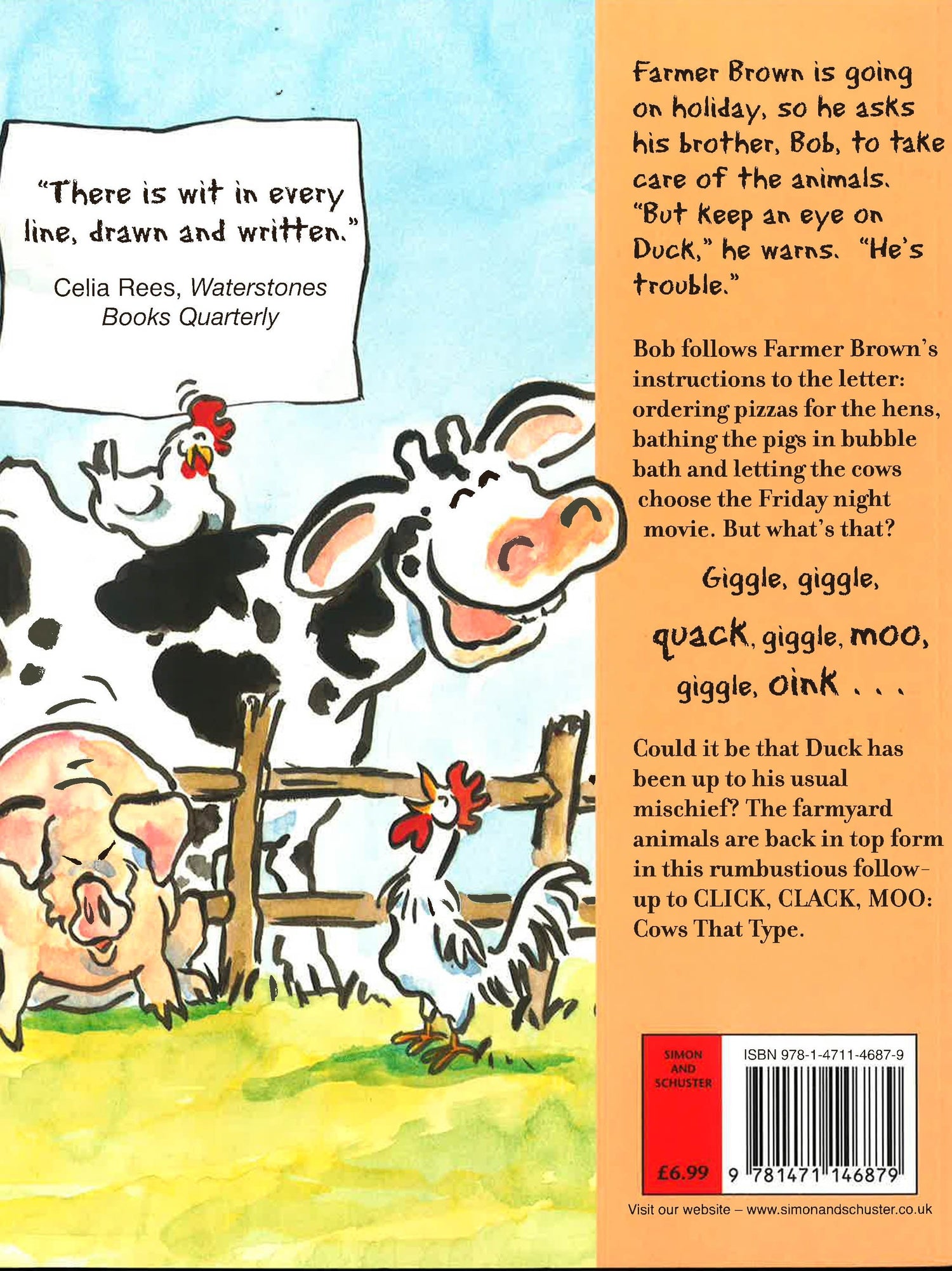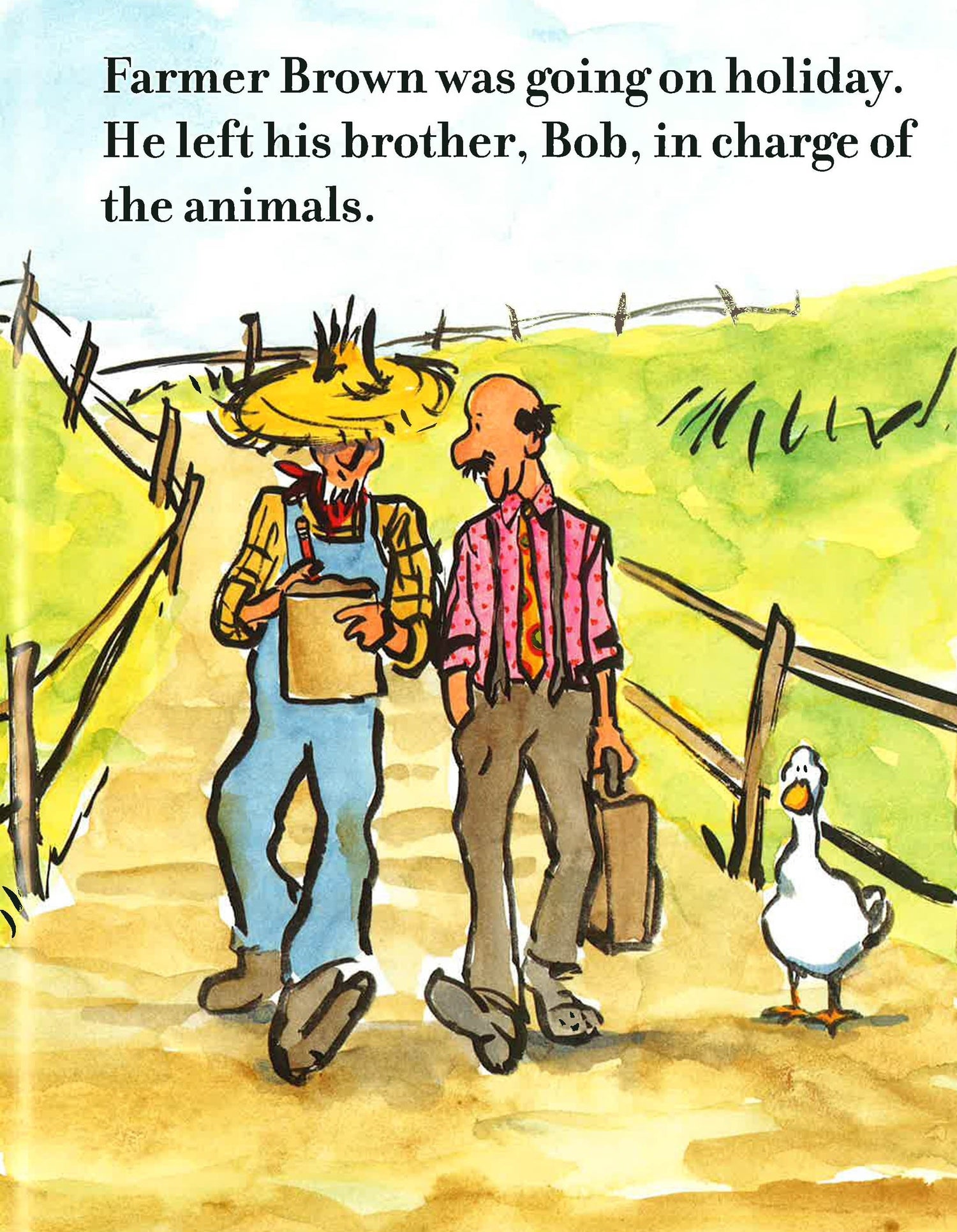 Farmer Brown is going on holiday, so he asks his brother, Bob, to take care of the animals. "But keep an eye on Duck," he warns. "He's trouble."