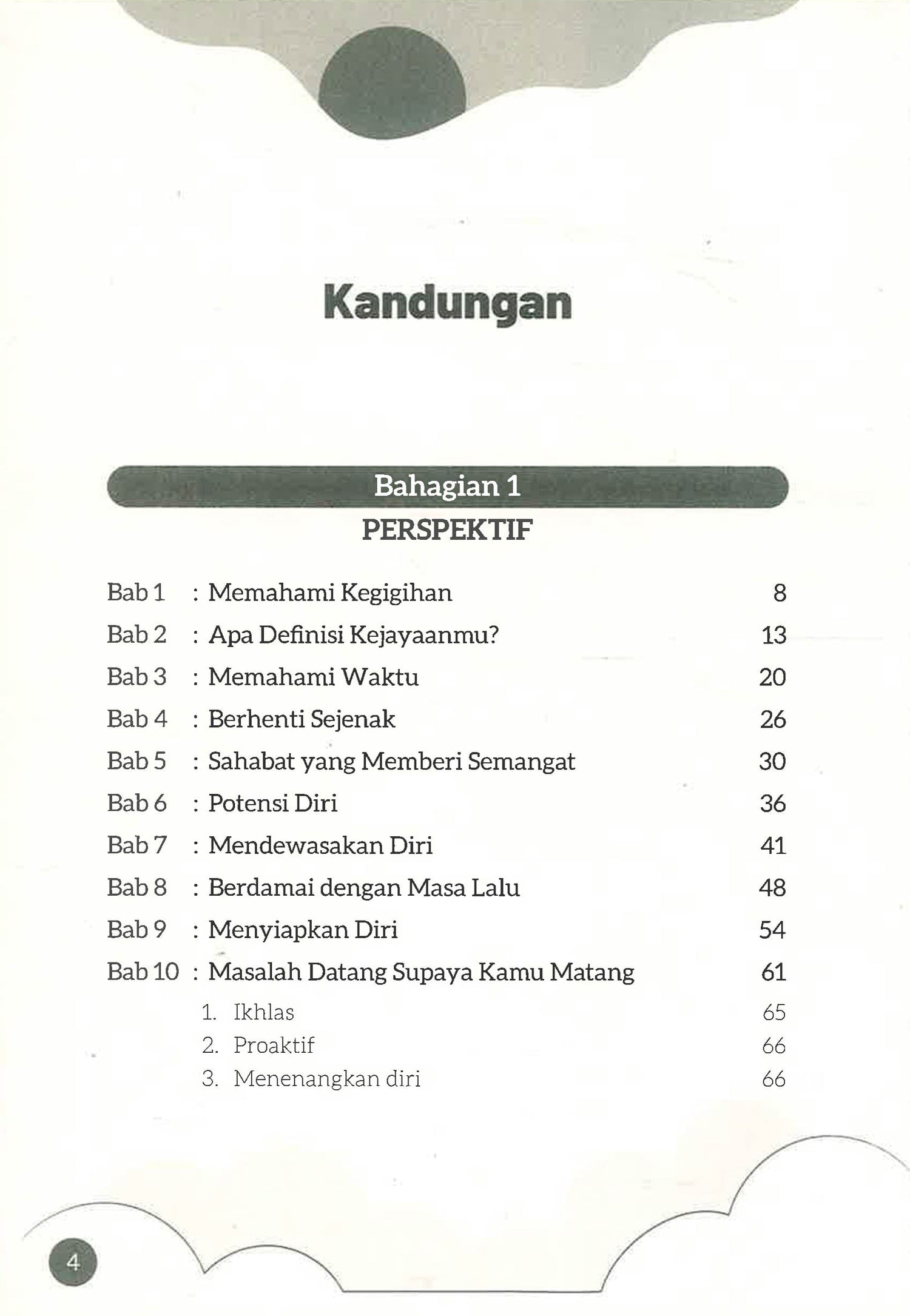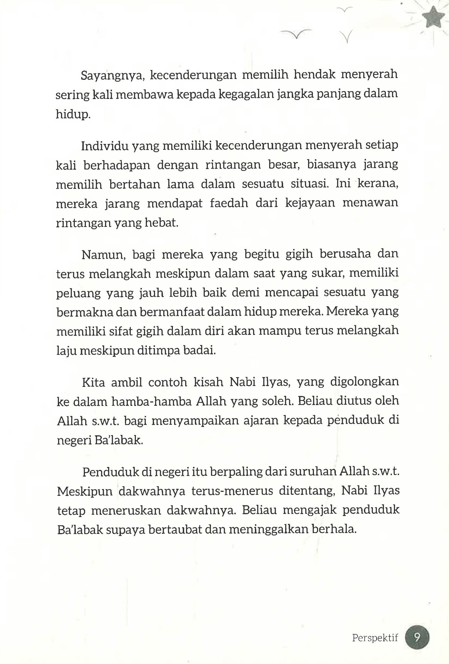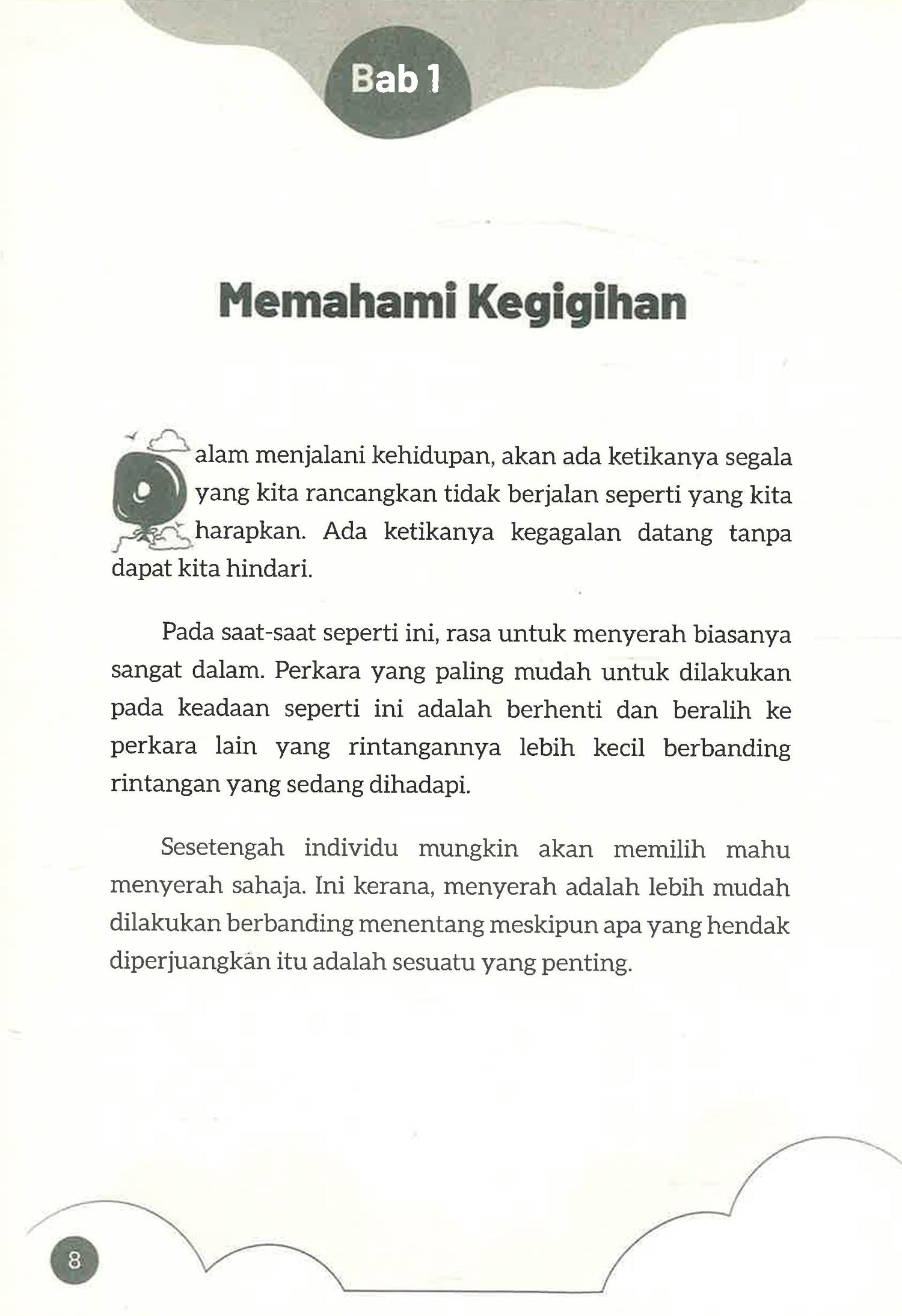 Gigih – Kualiti diri pada individu, yang diuji dengan seribu satu cabaran dan arus ganas kehidupan, namun dia tetap terus berusaha bagi mencapai matlamat yang diimpikan. Dalam menjalani kehidupan, akan ada ketikanya segala yang kita rancang tidak berjalan seperti yang diharapkan. Ada ketikanya kegagalan datang tanpa dapat kita hindari. Sesetengah individu mungkin akan memilih untuk menyerah sahaja kerana menyerah lebih mudah dilakukan. Kecenderungan memilih untuk menyerah sering kali membawa kepada kegagalan jangka panjang dalam hidup. Namun bagi mereka yang dengan gigihnya mampu untuk terus melangkah meskipun dalam saat yang sukar, memiliki peluang yang jauh lebih baik demi mencapai sesuatu yang bermakna dan bermanfaat dalam hidup mereka. Mereka yang memiliki sifat gigih dalam diri akan mampu terus melangkah lebih jauh walaupun berhadapan dengan pelbagai rintangan. Melalui buku ini, pembaca akan mendalami sifat kegigihan dan perkaitannya dengan kejayaan.