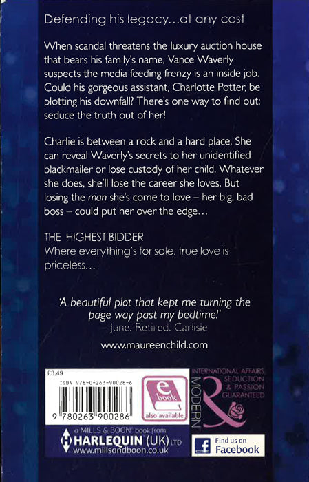 Defending his legacy...at any cost When scandal threatens the luxury auction house that bears his family's name, Vance Waverly suspects the media feeding frenzy is an inside job. Could his gorgeous assistant, Charlotte Potter, be plotting his downfall? There's one way to find out: seduce the truth out of her! Charlie is between a rock and a hard place. She can reveal Waverly's secrets to her unidentified blackmailer or lose custody of her child. Whatever she does, she'll lose the career she loves. But losing the man she's come to love - her big, bad boss - could put her over the edge...The HIGHEST BIDDER Where everything's for sale, true love is priceless...?A beautiful plot that kept me turning the page way past my bedtime!' - June, Retired, Carlisle www.maureenchild.com