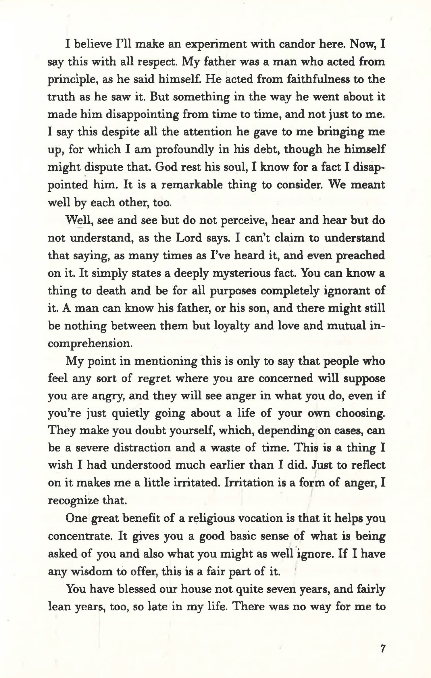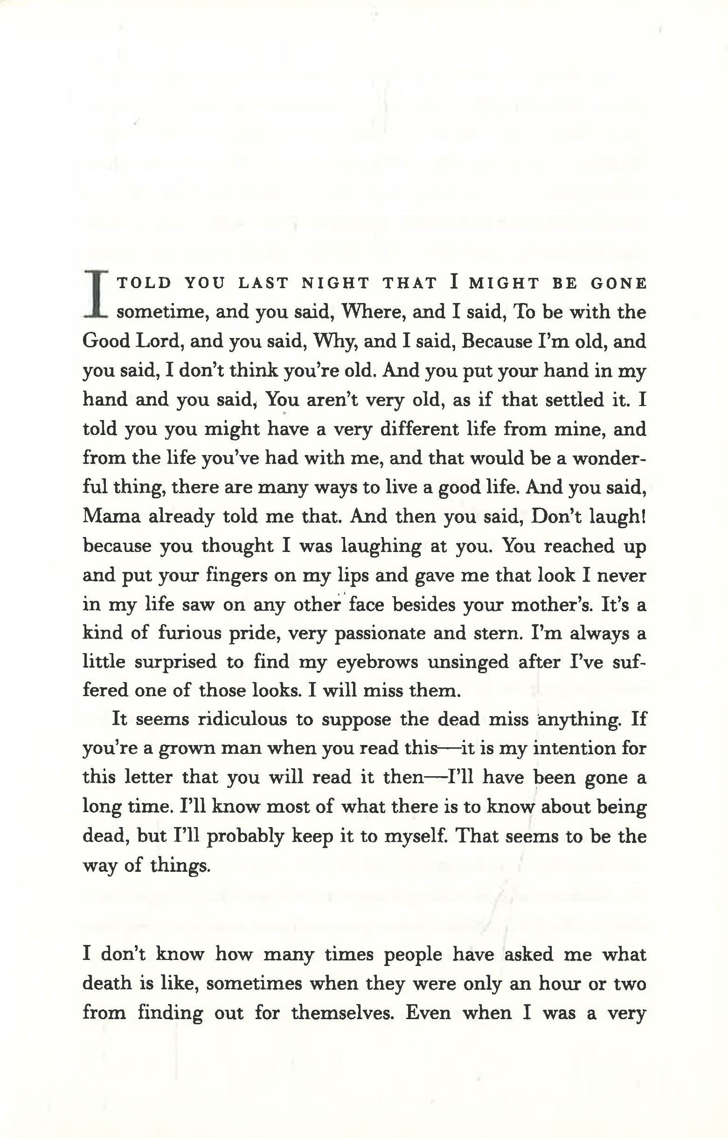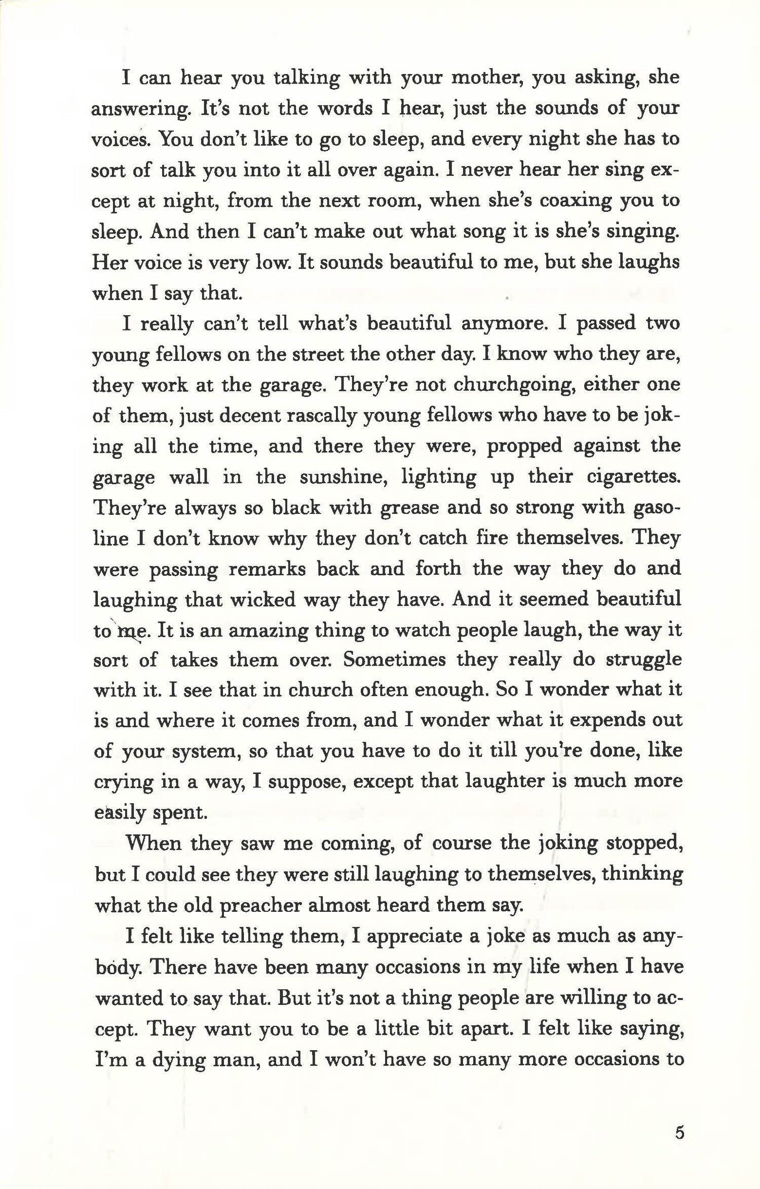 In 1956, toward the end of Reverend John Ames's life, he begins a letter to his young son, an account of himself and his forebears. Ames is the son of an Iowan preacher and the grandson of a minister who, as a young man in Maine, saw a vision of Christ bound in chains and came west to Kansas to fight for abolition: He preached men into the Civil War, then, at age fifty, became a chaplain in the Union Army, losing his right eye in battle.